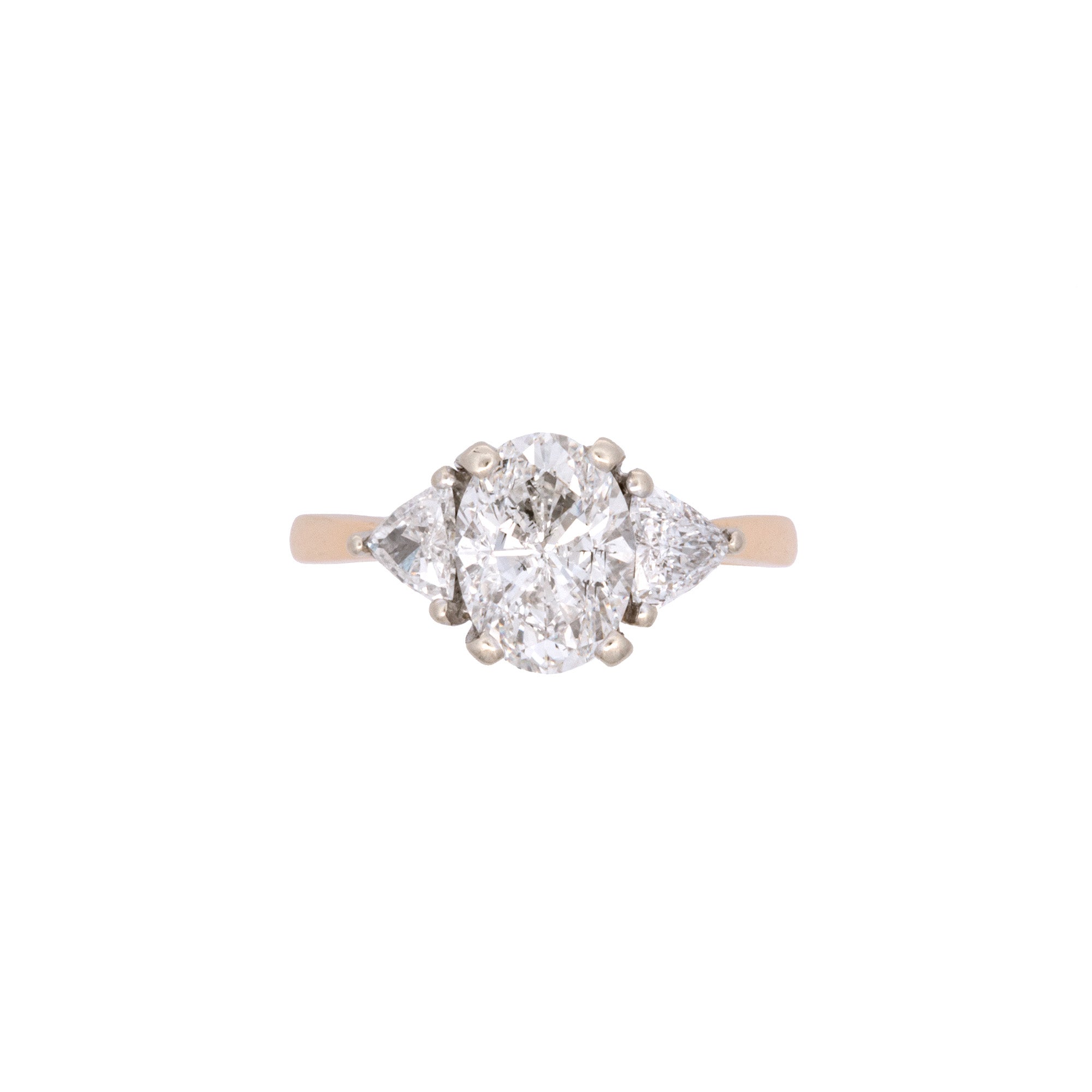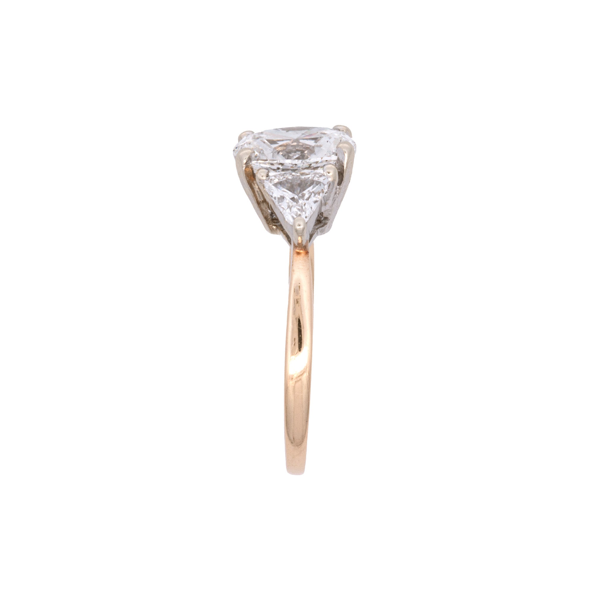 14K Yellow And White Gold Oval And Trillion Diamond Ring. Oval Diamond Weighs 1.90 Carats And Has I-J Color, I2 Clarity. Trillion Diamonds Weigh A Total Of 0.50 Carats. Sizing Available.