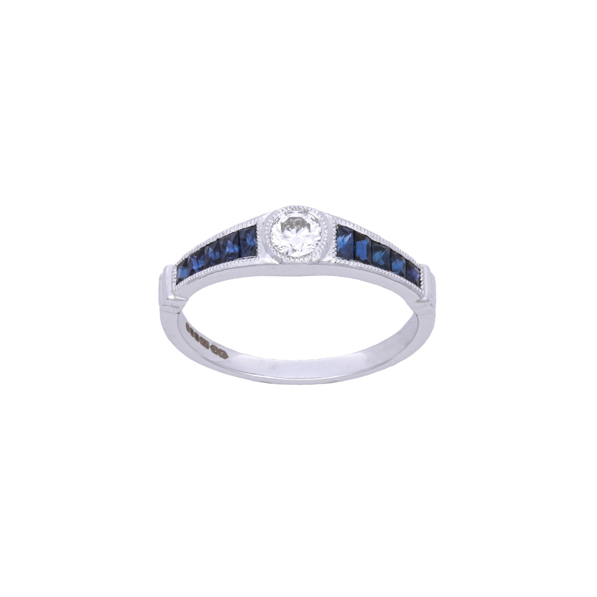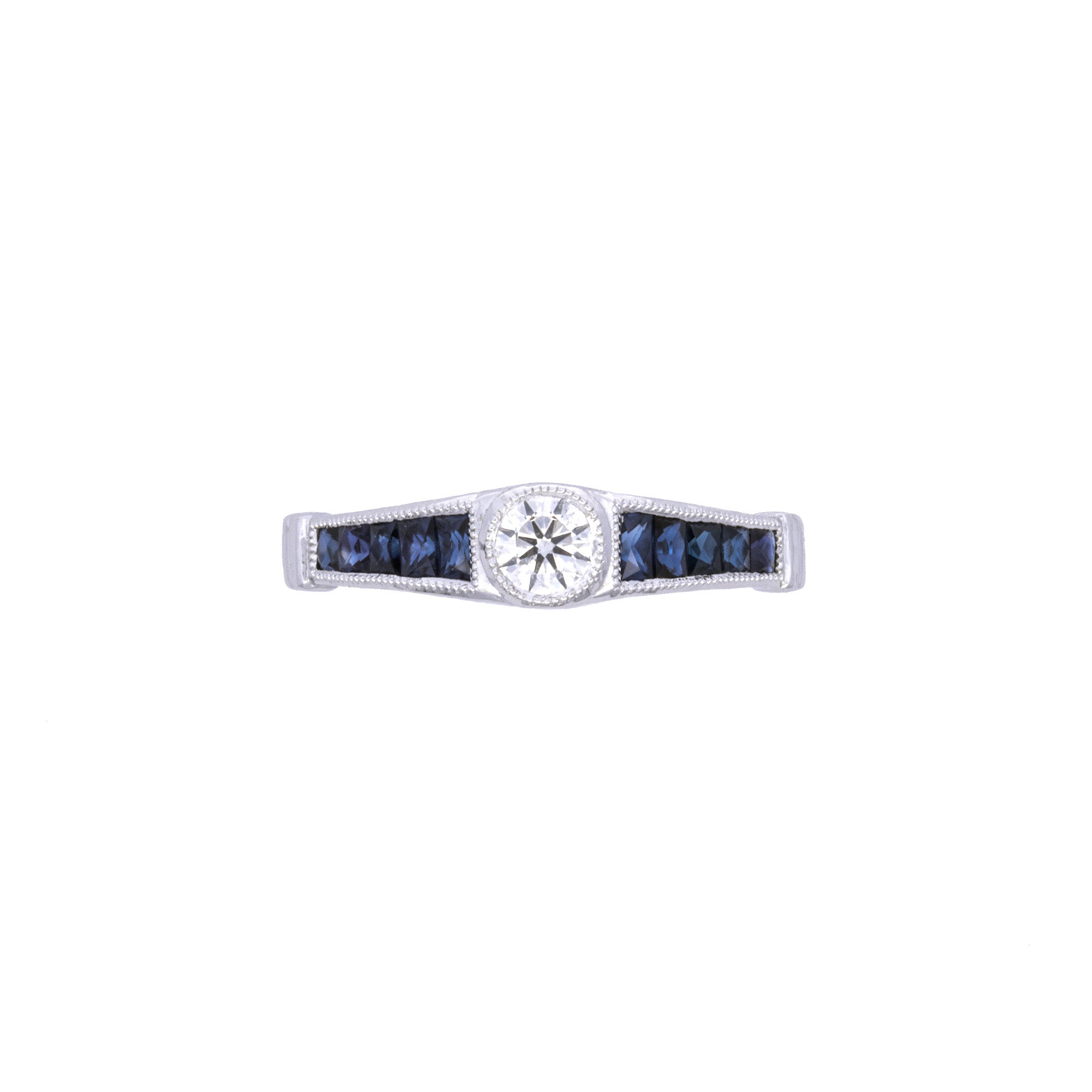 18K White Gold Sapphire And Diamond Engagement Ring. The Diamond Weighs A Total Of 0.30 Carats And Has G Color And SI1 Clarity. The Ring Can Be Sized.