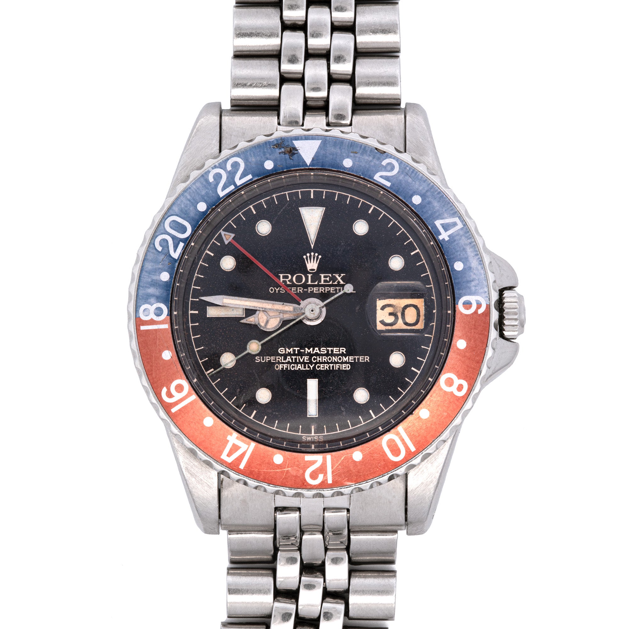 40mm Stainless Steel "Rolex" GMT Pepsi "Tropical Dial" Watch With Box And Warranty Paper, Circa 1960