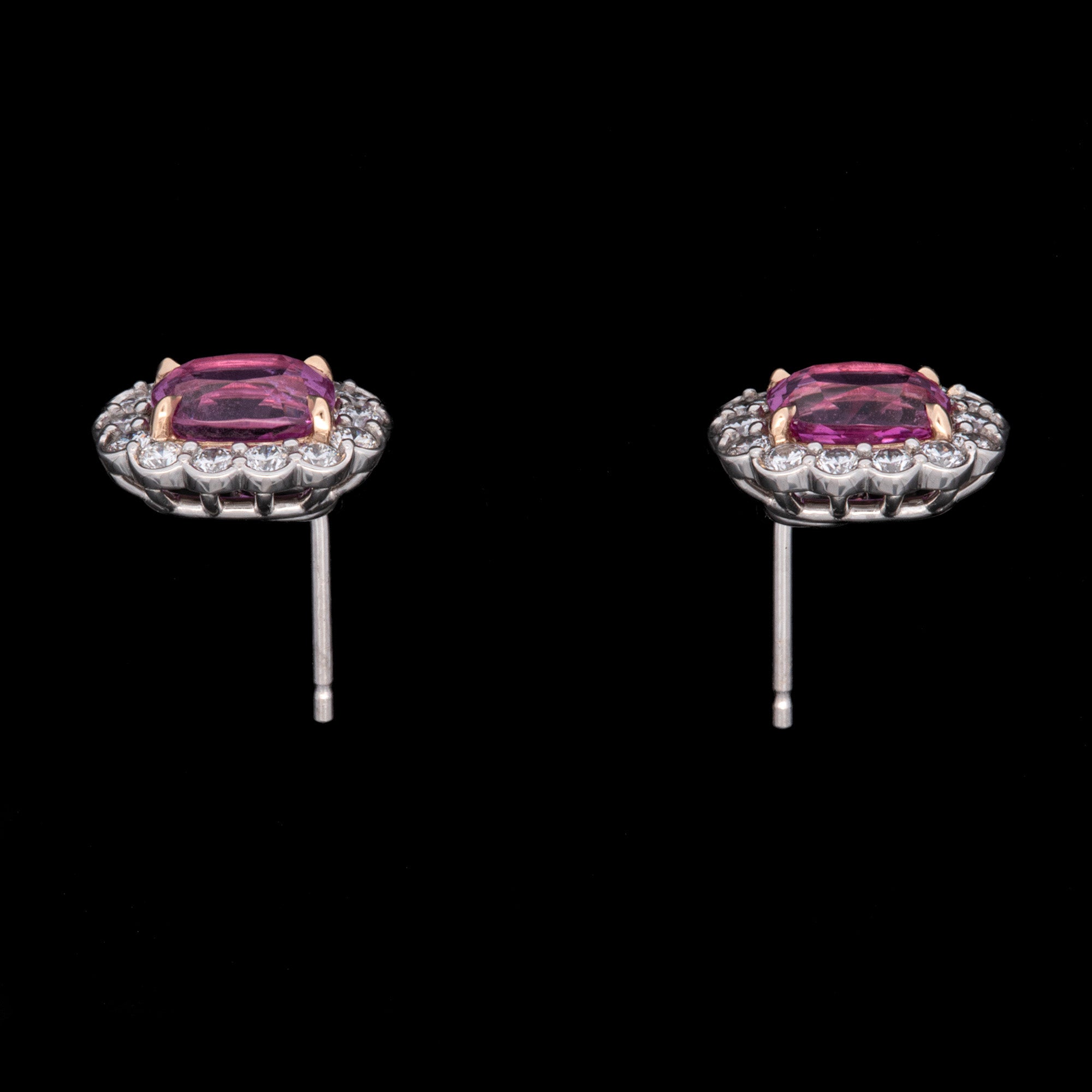 Platinum And 18K Yellow Gold Cushion Cut Pink Sapphire And Diamond Halo Scalloped Edge Stud Earrings