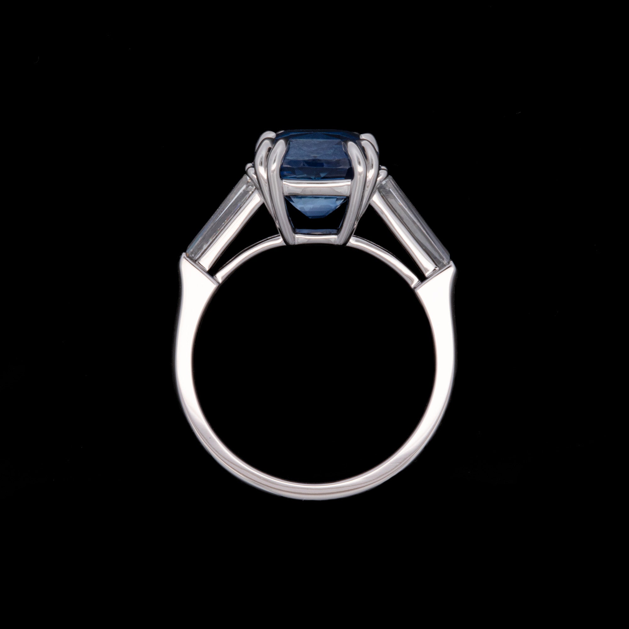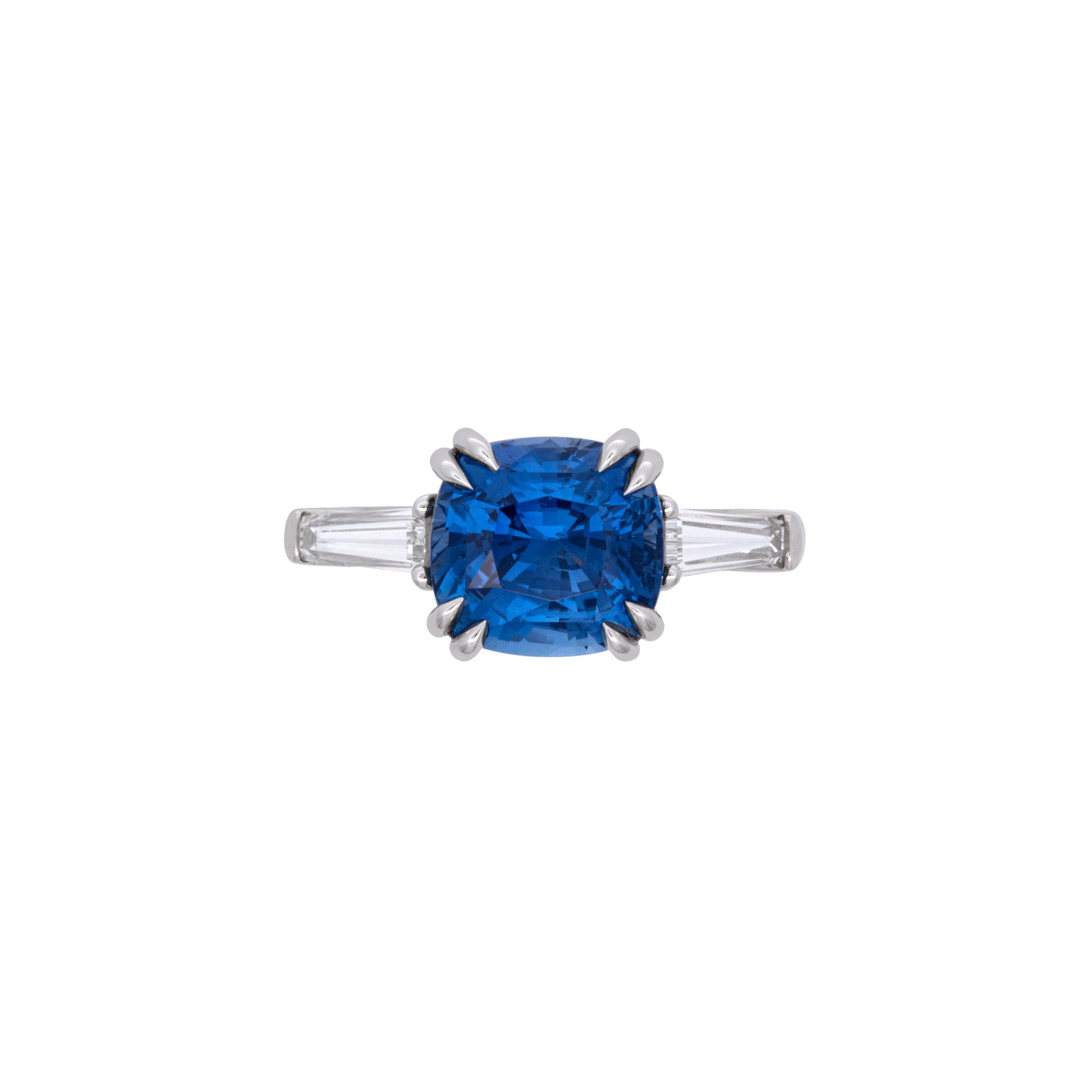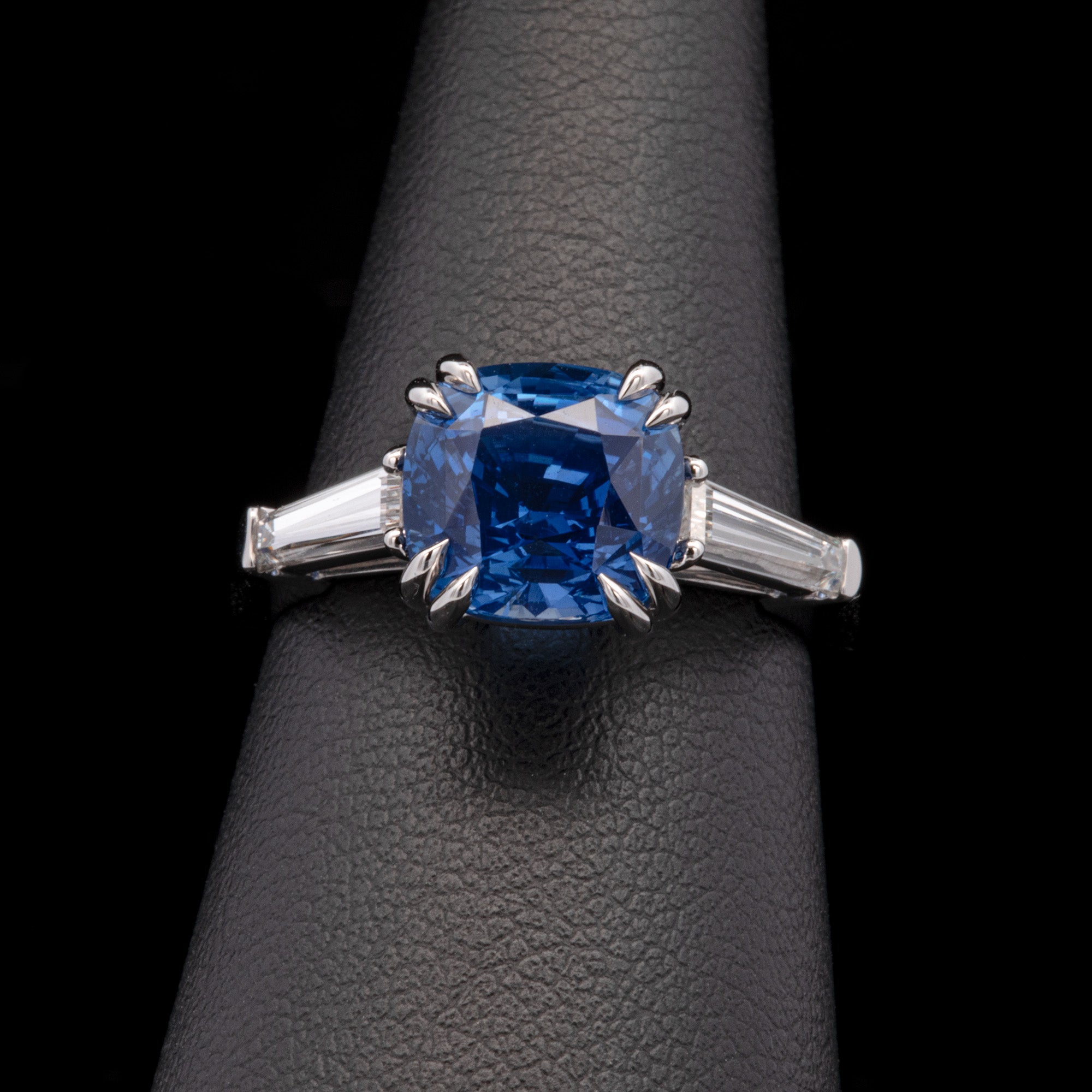 Platinum "No Heat" Ceylon Sapphire And Diamond Ring. Cushion Cut Sapphire Weighs 4.21 Carats; AGL Certified. Two Tapered Baguette Diamonds Weigh A Total Of 0.72 Carats And Have F Color, VS1-VS2 Clarity. Sizing Available.