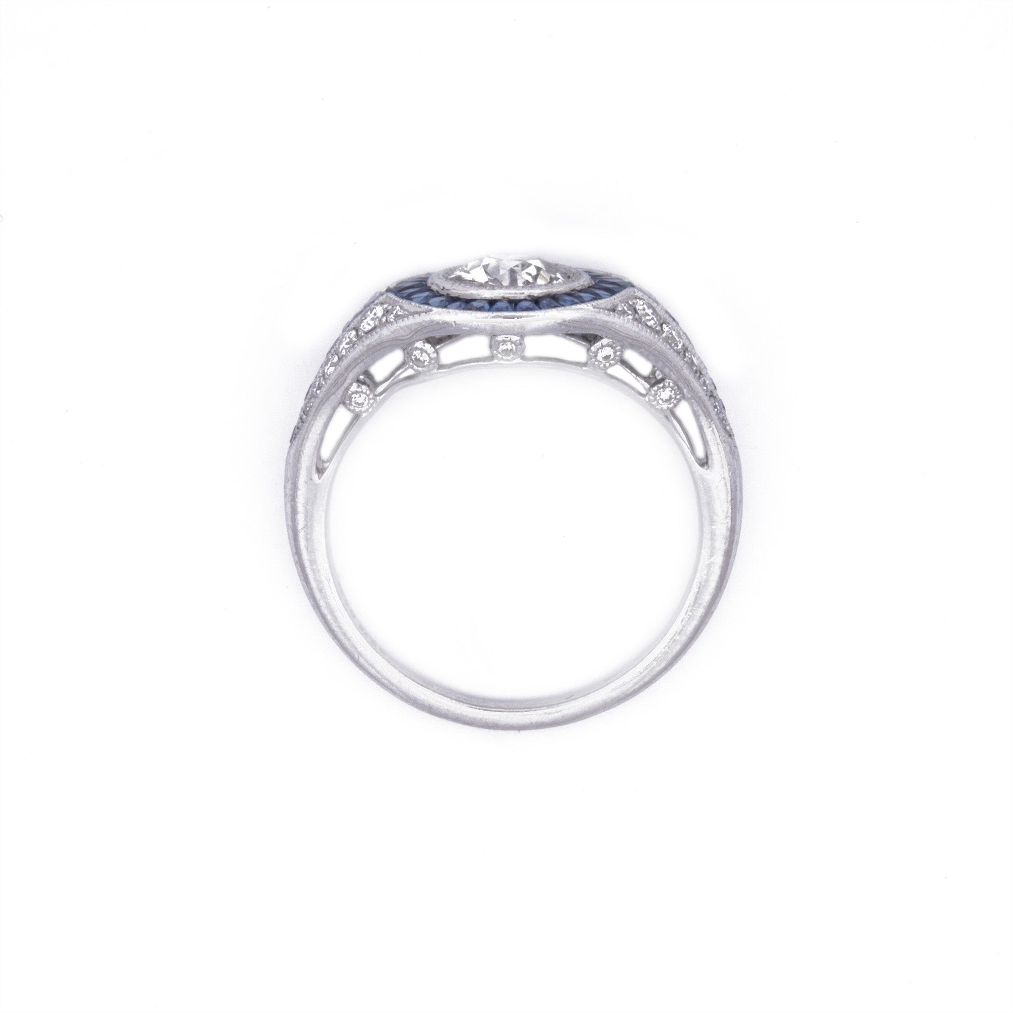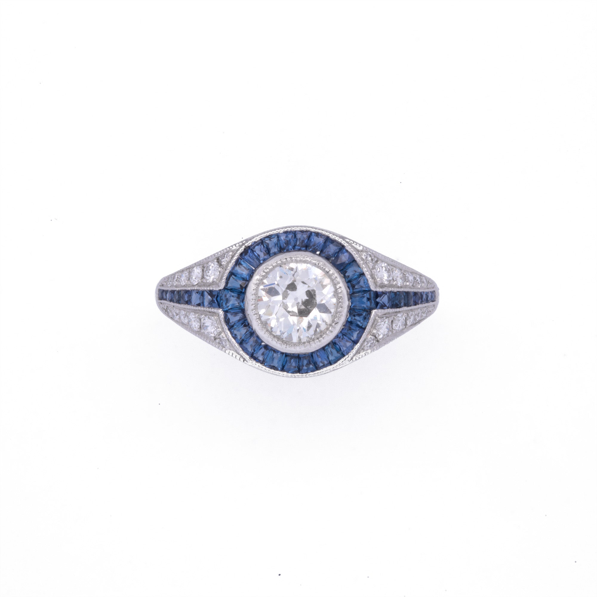 Platinum Old European Cut Diamond and Sapphire Ring