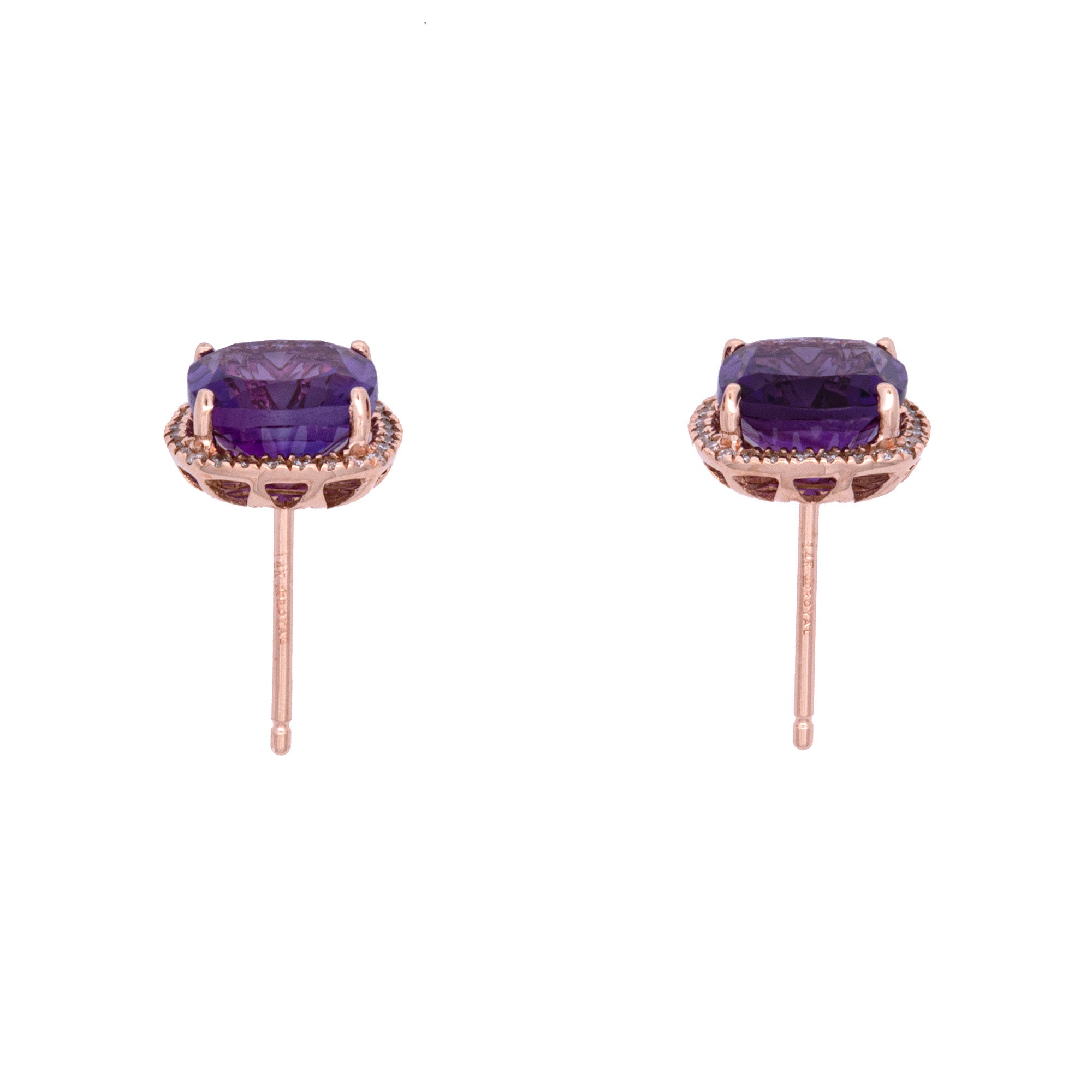 14K Rose Gold Amethyst And Diamond Halo Stud Earrings. Amethysts Weigh A Total Of 3.80 Carats. Diamonds Weigh A Total Of 0.21 Carats.
