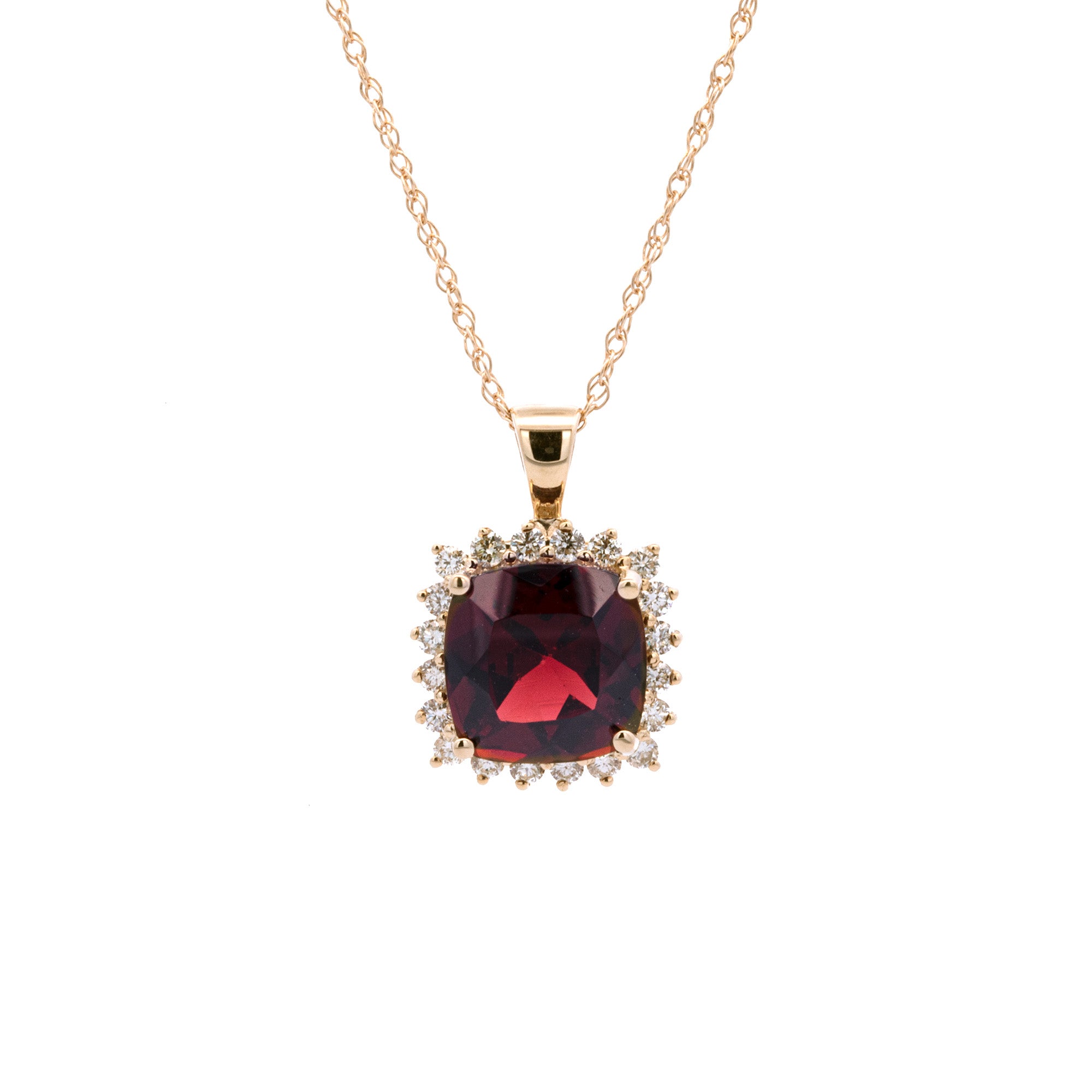 14K Yellow Gold Cushion Cut Garnet And Diamond Halo Pendant