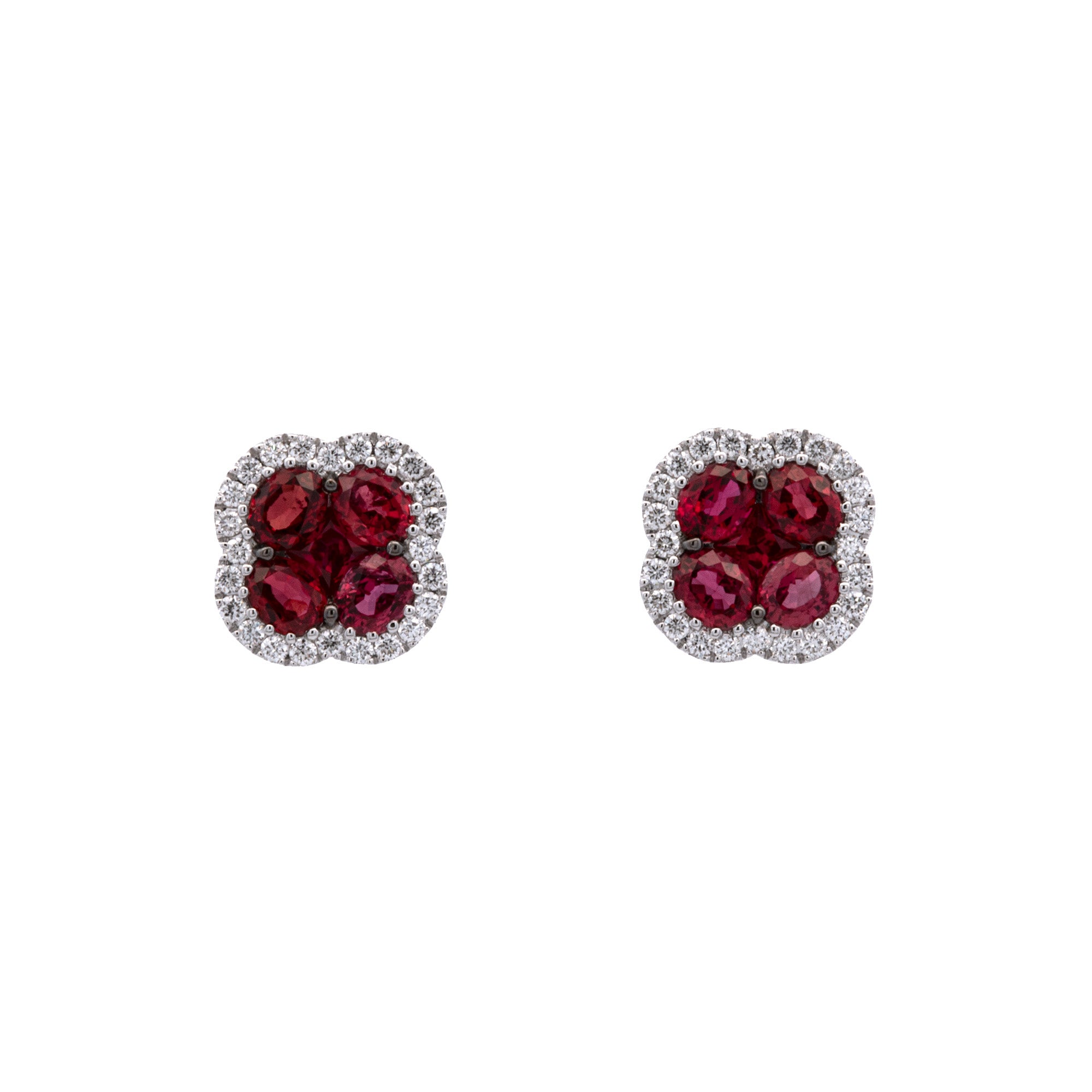 18K White Gold Ruby And Diamond Clover Stud Earrings. Ten Rubies Weigh A Total Of 1.86 Carats. Forty-Eight Round Diamonds Weigh A Total Of 0.28 Carats And Have G-H Color, VS2-SI1 Clarity.