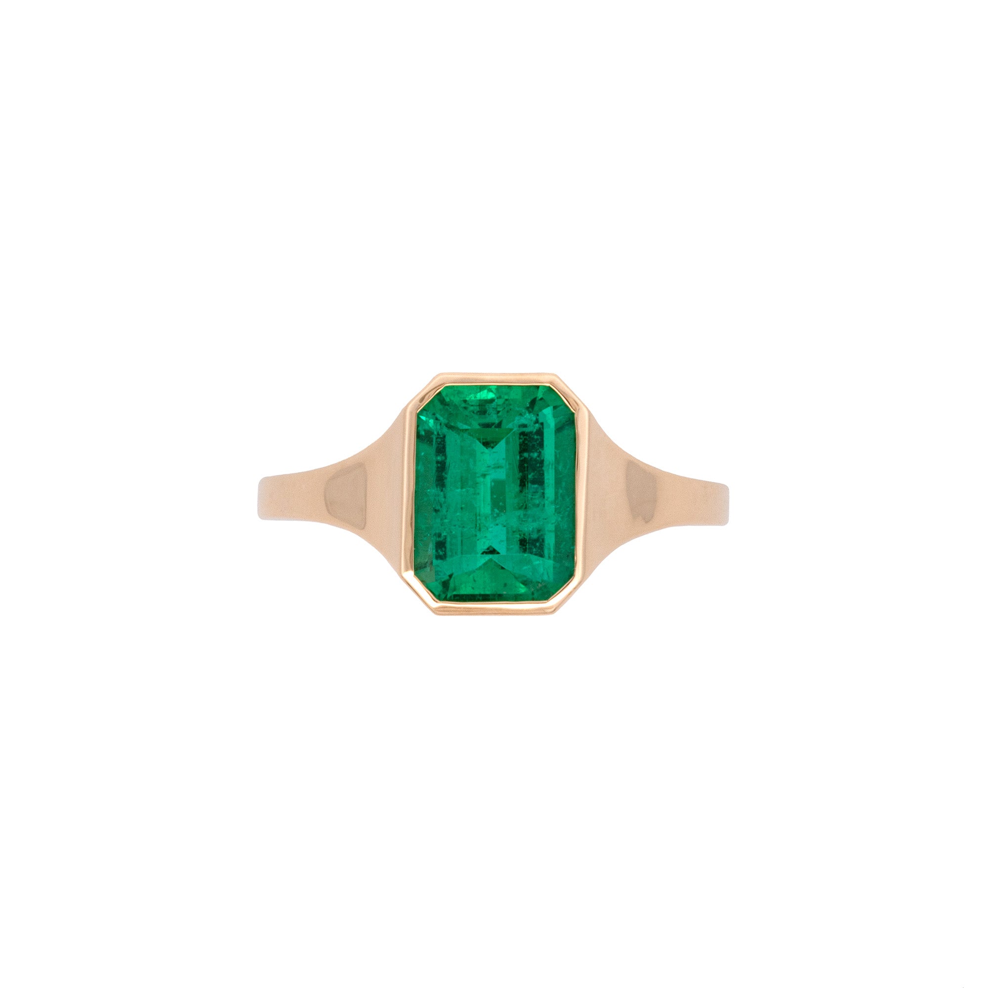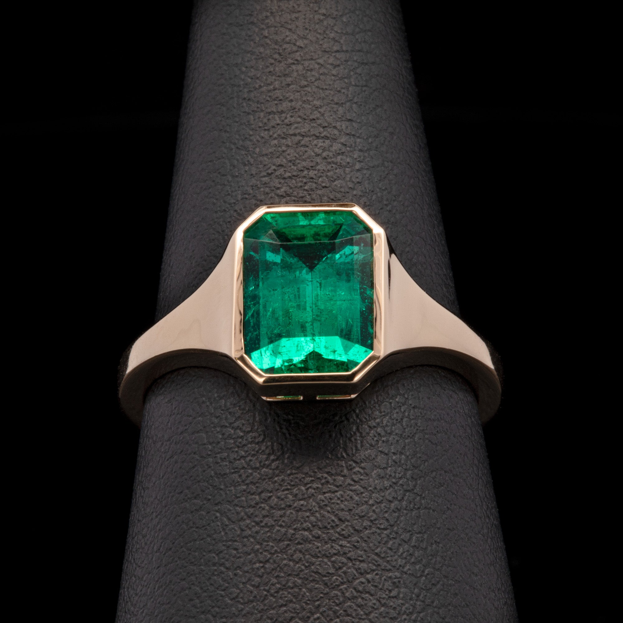 Custom 18K Yellow Gold Bezel Set Brazilian Emerald Cut Emerald Engagement Ring