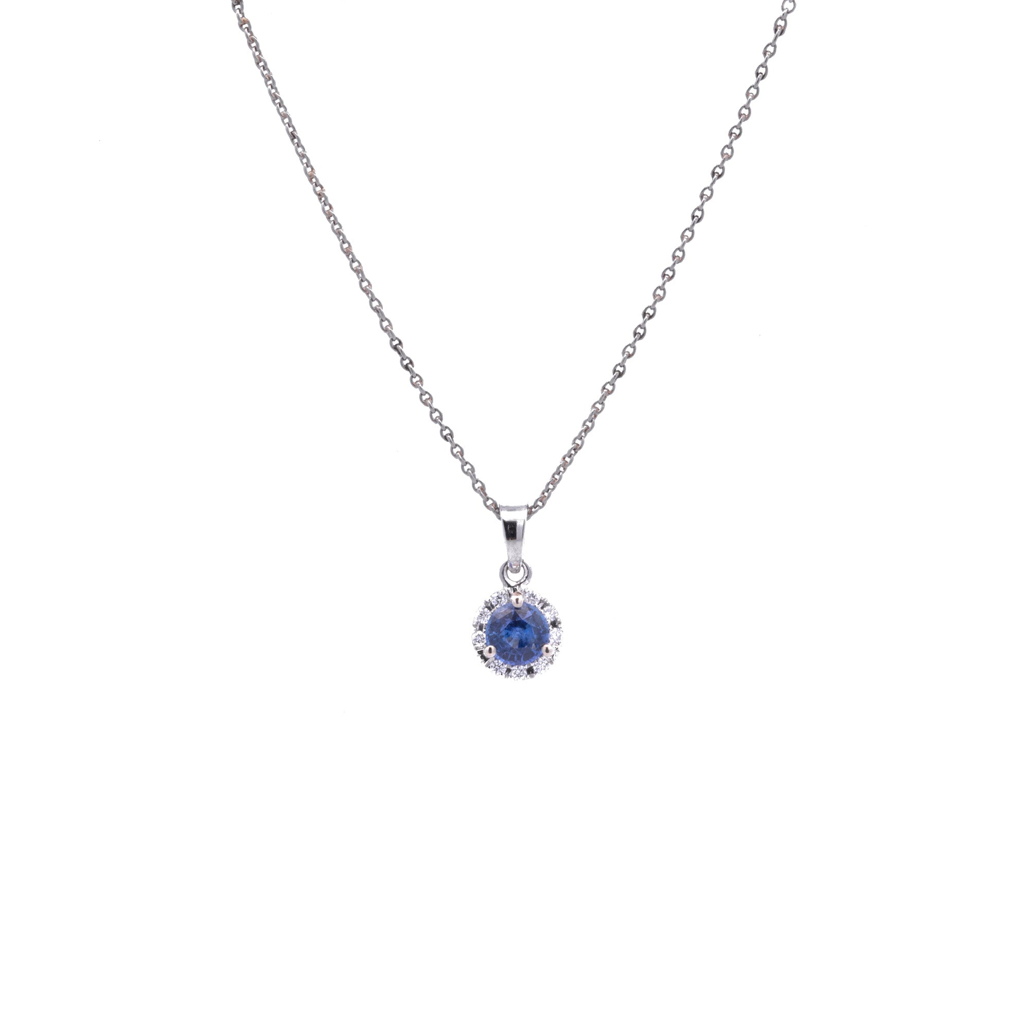 14K White Gold Ceylon Sapphire Pendant with Diamond Halo. The Sapphire Weighs 0.51 Carats. The Diamonds weigh a Total of 0.06 Carats.