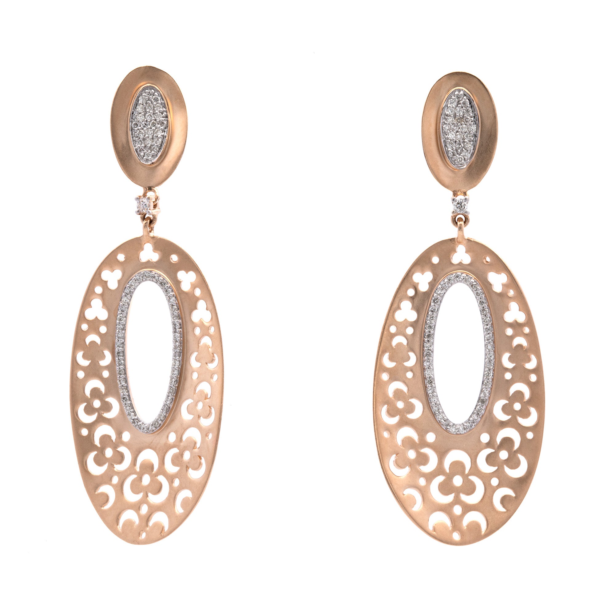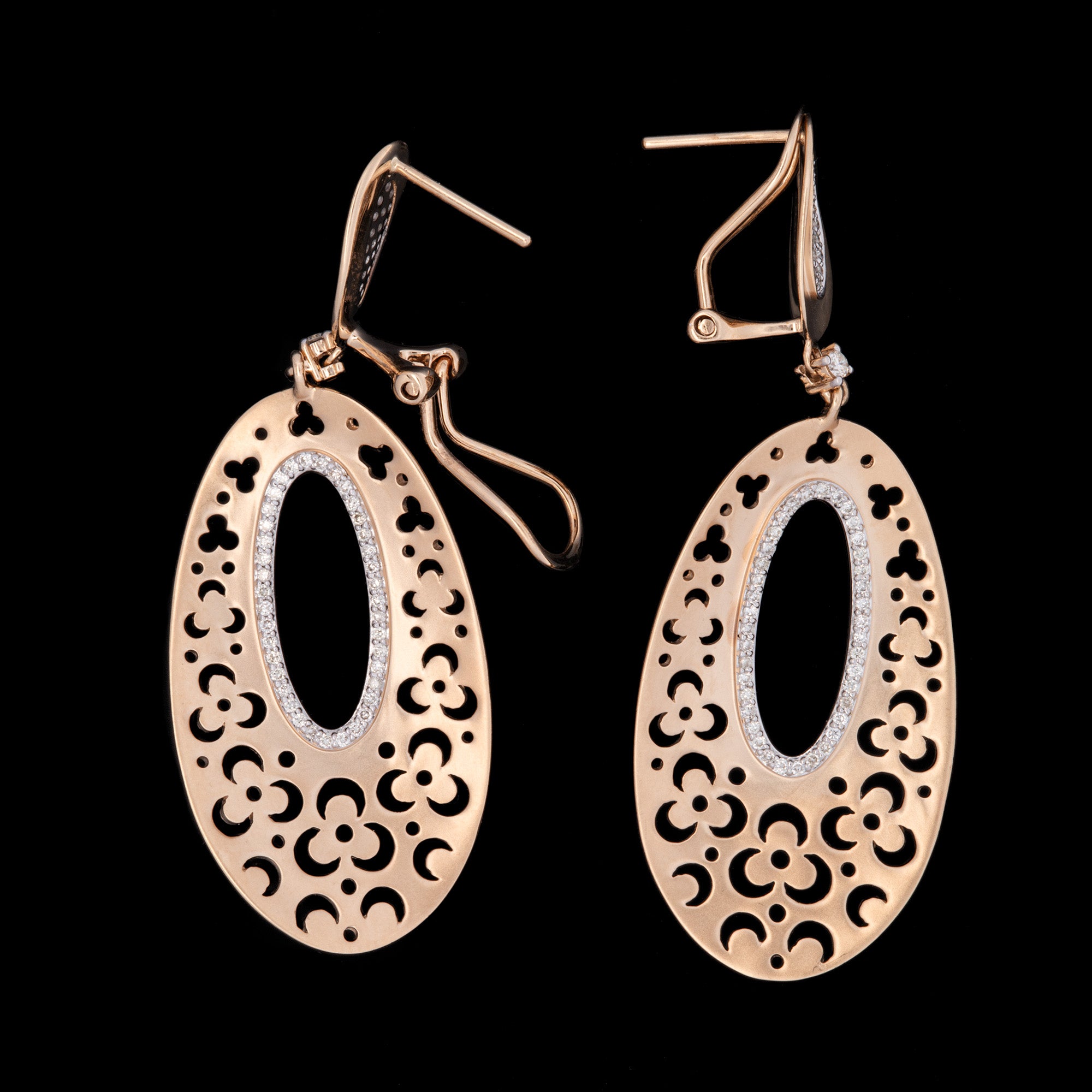 14K Yellow Gold Oval Open Work Drop Earrings With Diamond Accents