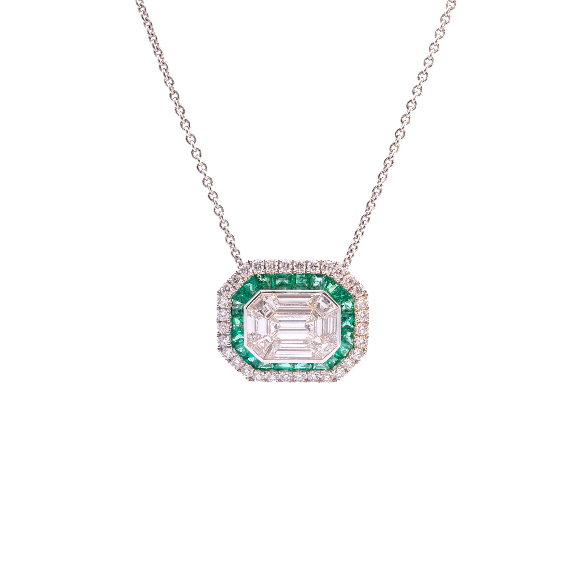 18K White Gold Emerald and Diamond Illusion Style Halo Pendant