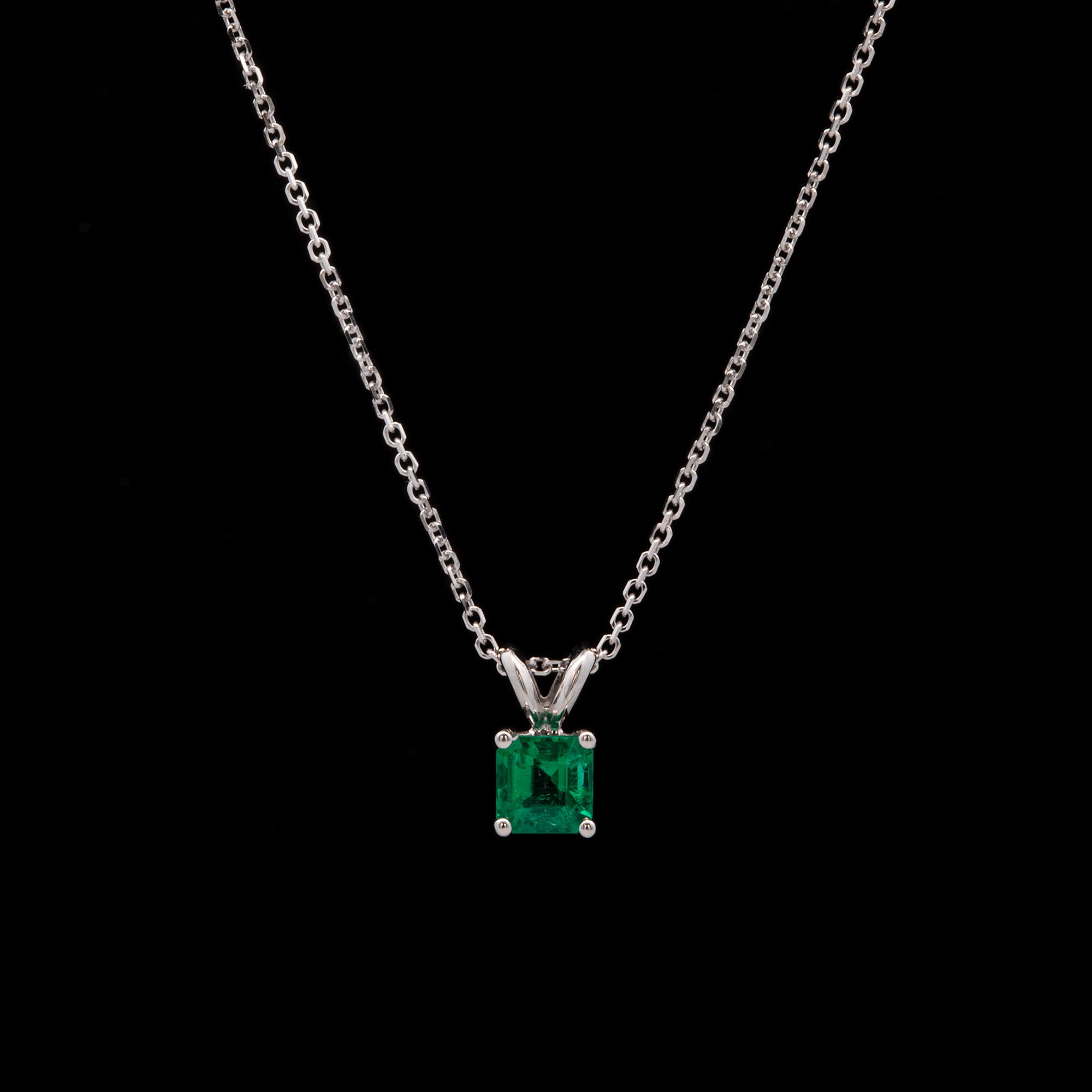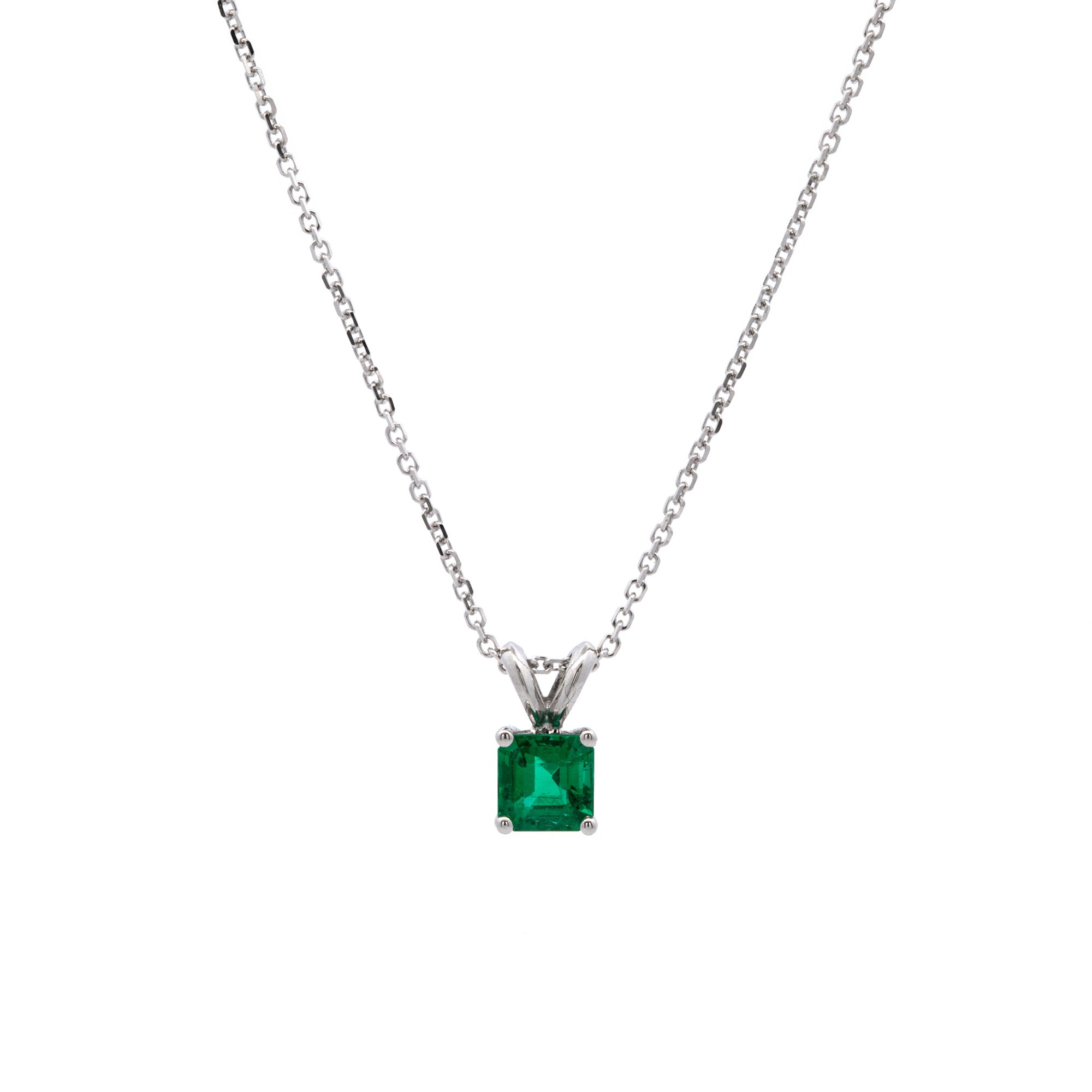 Custom 18K White Gold Square Emerald Pendant With 18 Inch Chain. Emerald Weighs 0.62 Carats.