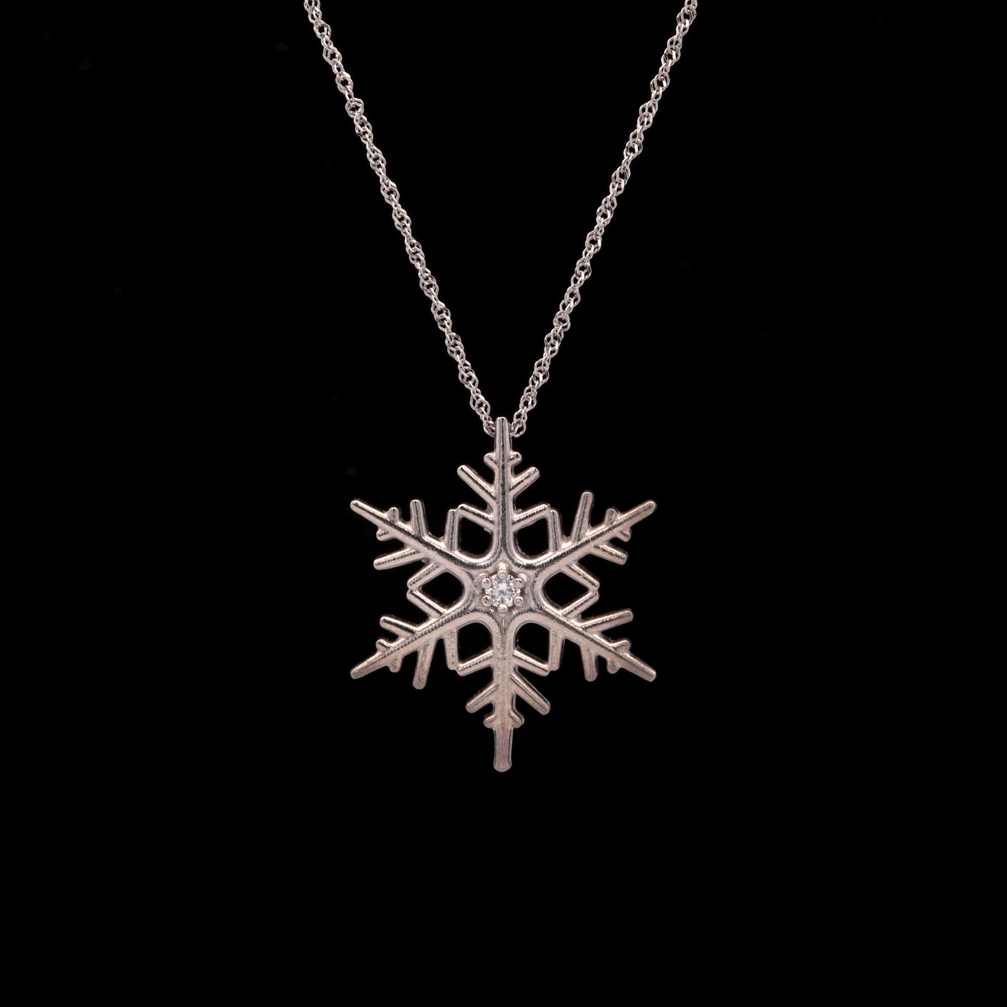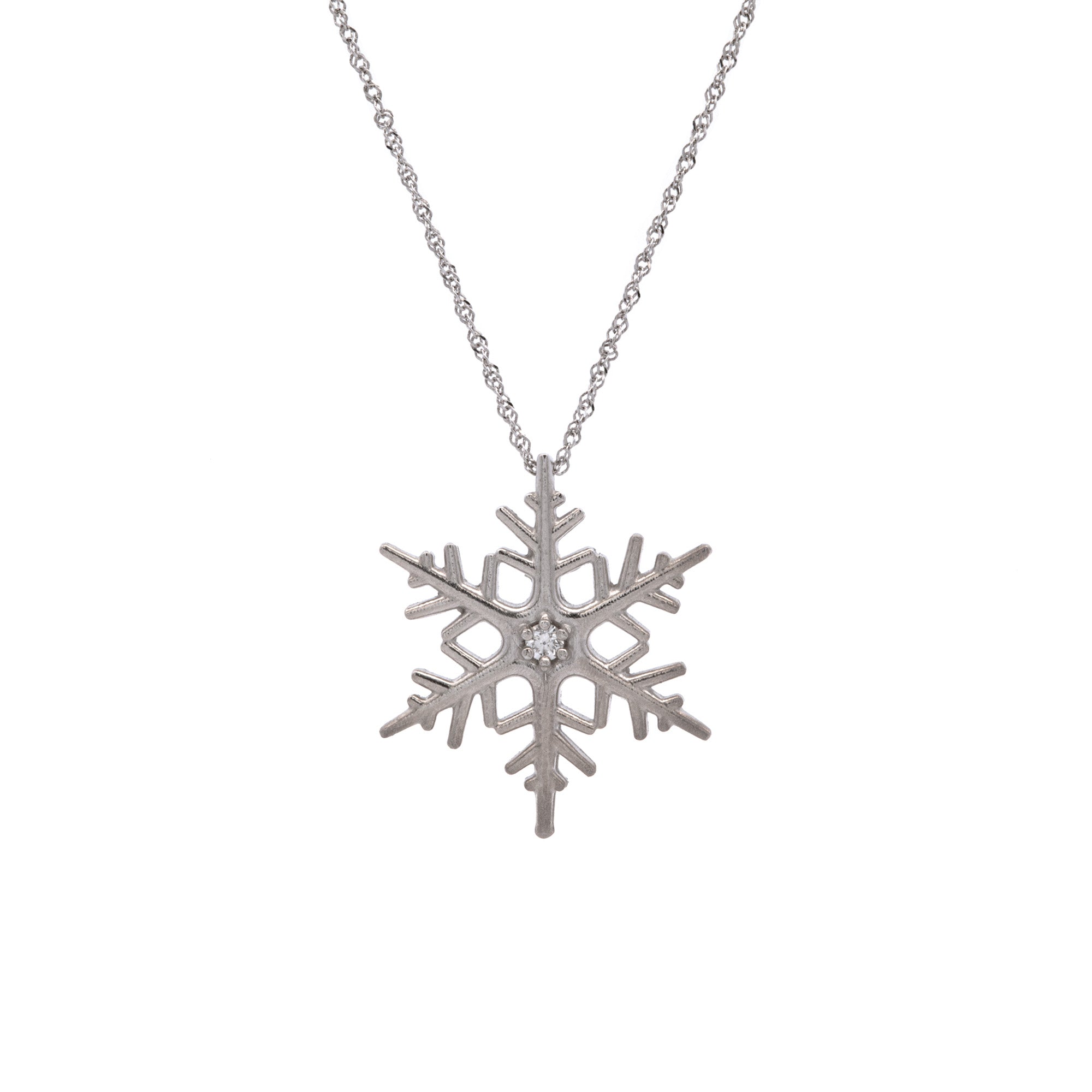 Norwich Diamond Snowflake Pendant with 18" Chain, 14K White Gold. Diamond Weighs 0.04 Carats and Have G-H Color, VS1 Clarity. Diameter Measures 19mm.