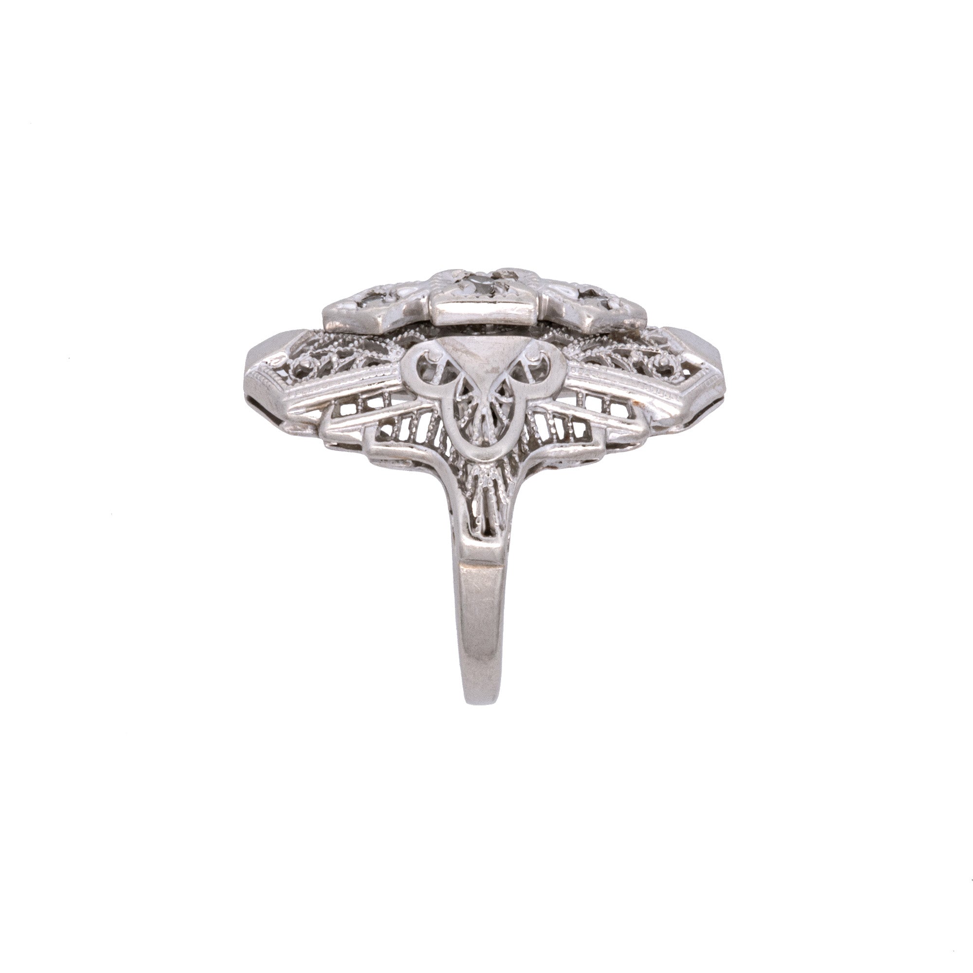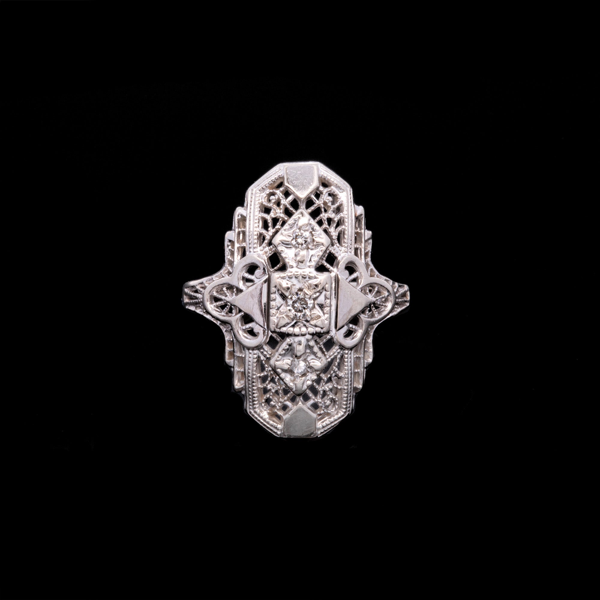 14K White Gold Art Deco Three Diamond Dinner Ring With Filigree