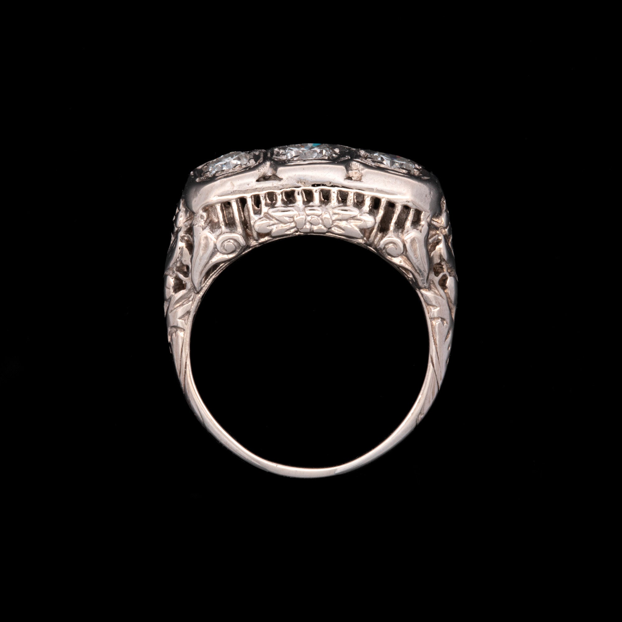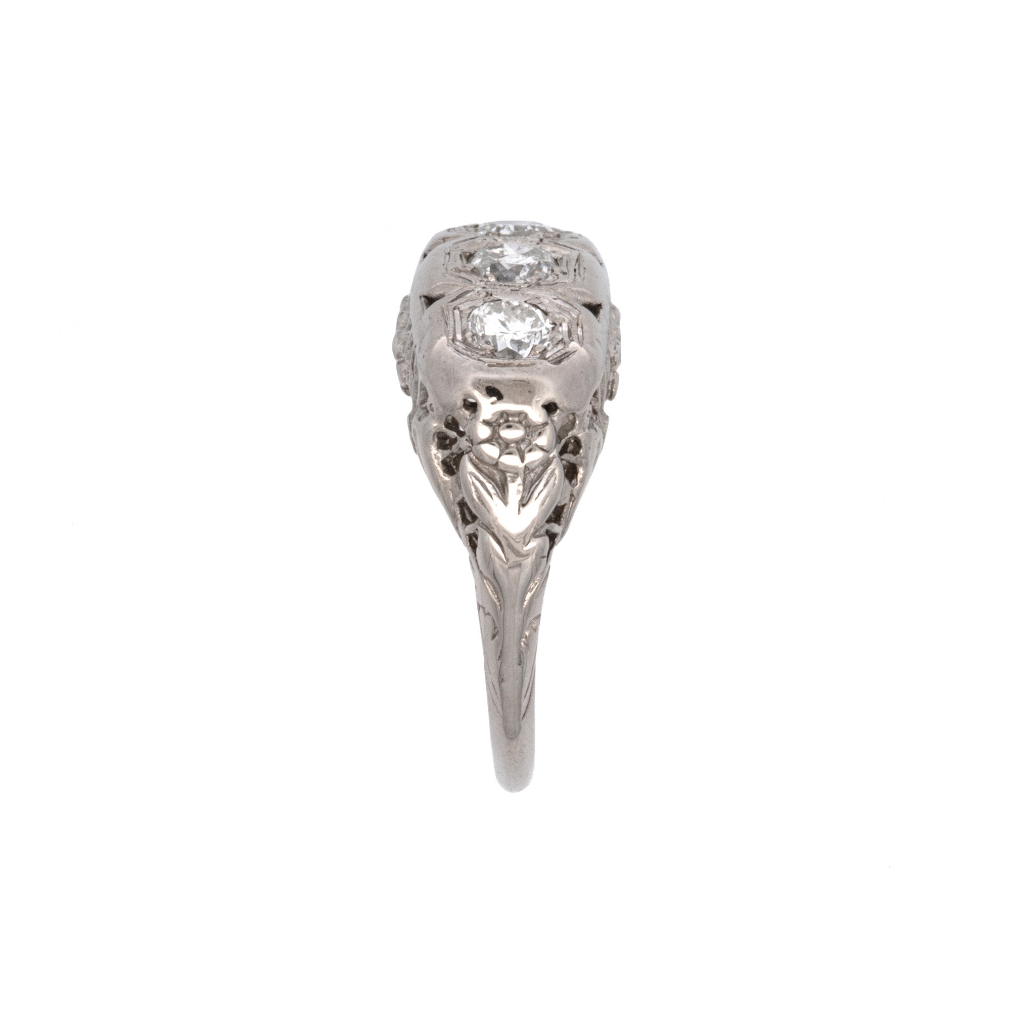 14K White Gold Art Deco Three Stone Diamond Ring. Three Diamonds Weigh A Total Of 0.77 Carats And Have H Color, SI1-SI2 Clarity. Sizing Available.