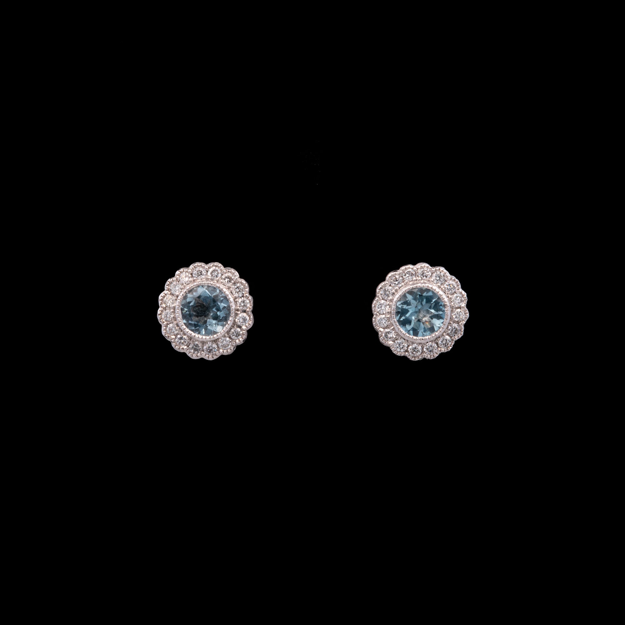 14K White Gold Bezel Set 0.50ctw Aquamarine And Diamond Halo Stud Earrings