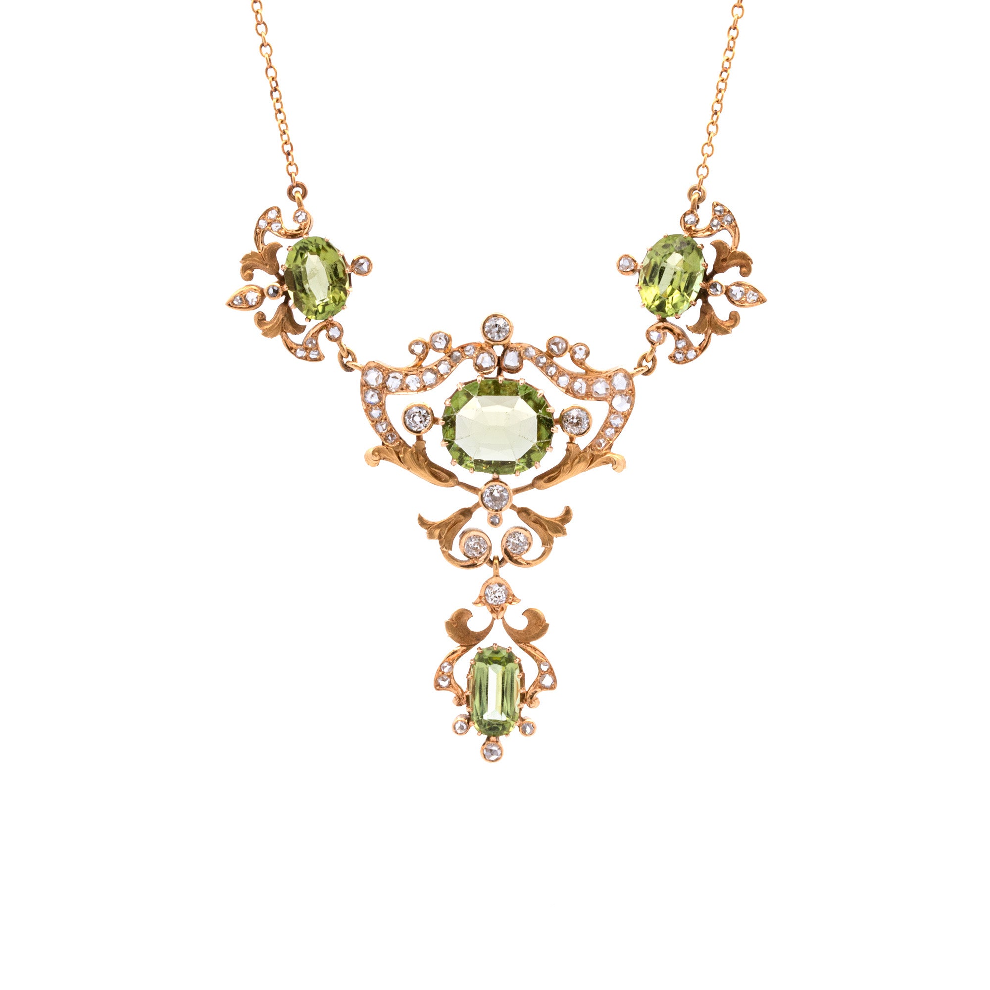 14K Yellow Gold Art Nouveau Peridot And Mixed Cut Diamond Necklace, 16 Inches
