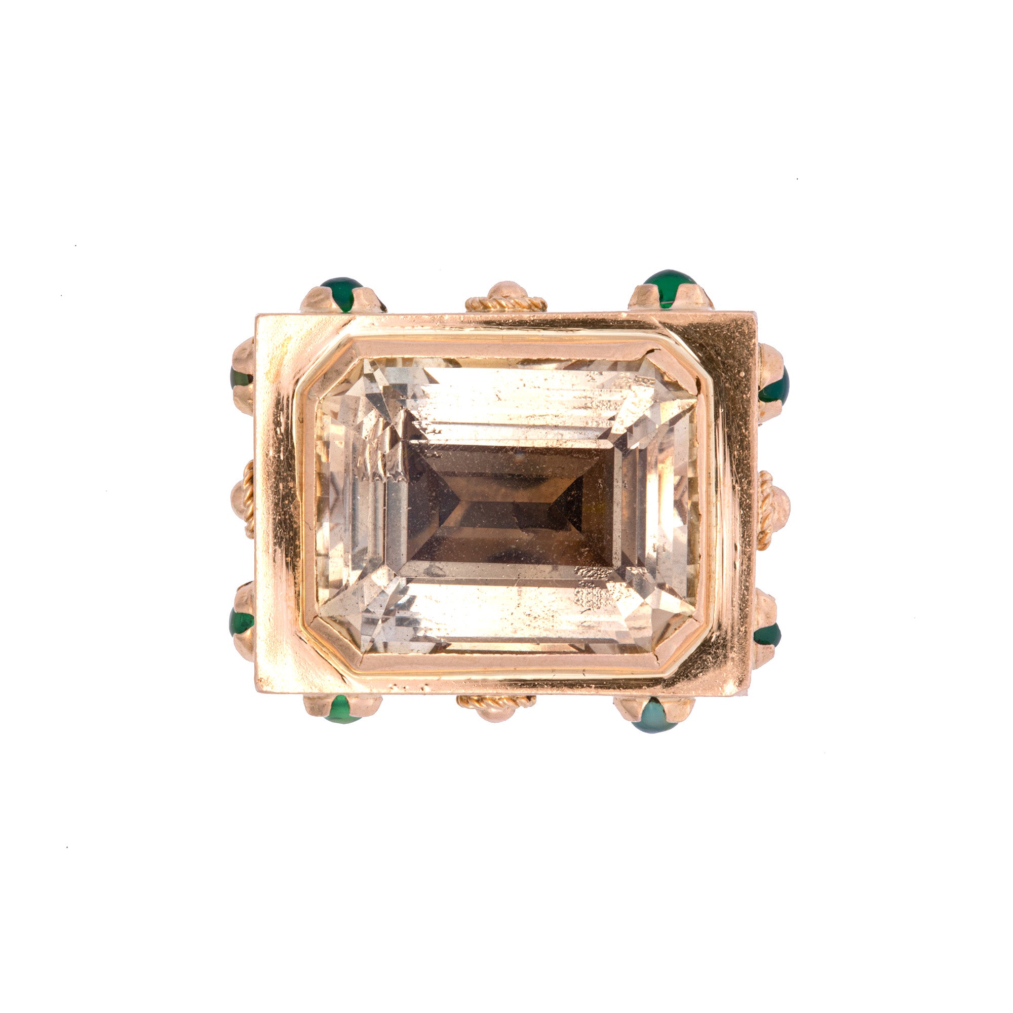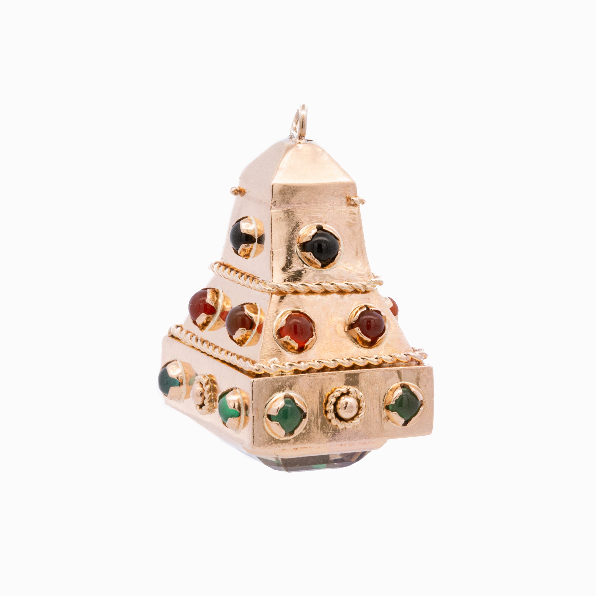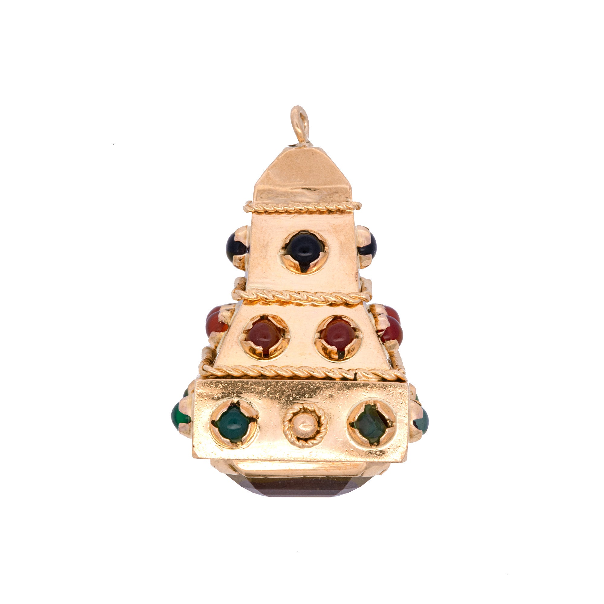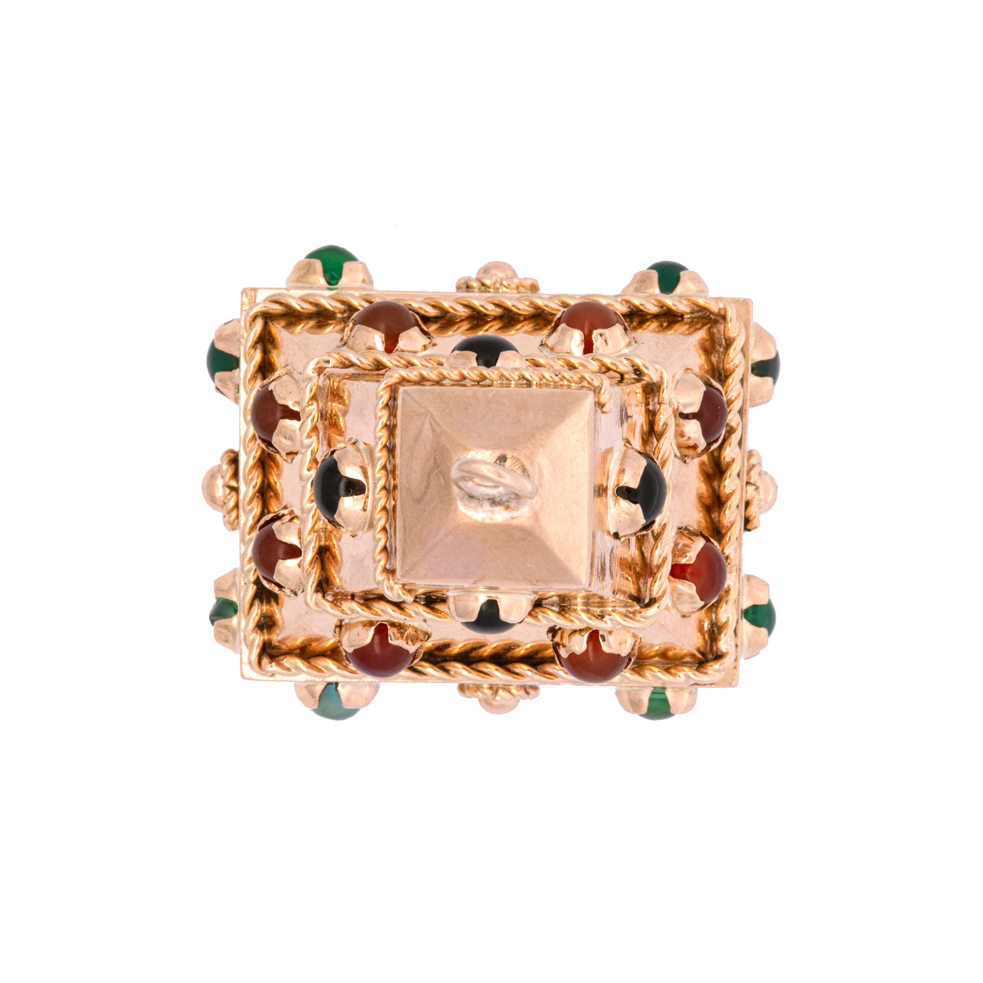 18K Yellow Gold Rectangular Four-Sided Cabochon Emerald, Smoky Quartz, Carnelian, and Onyx Vintage Charm