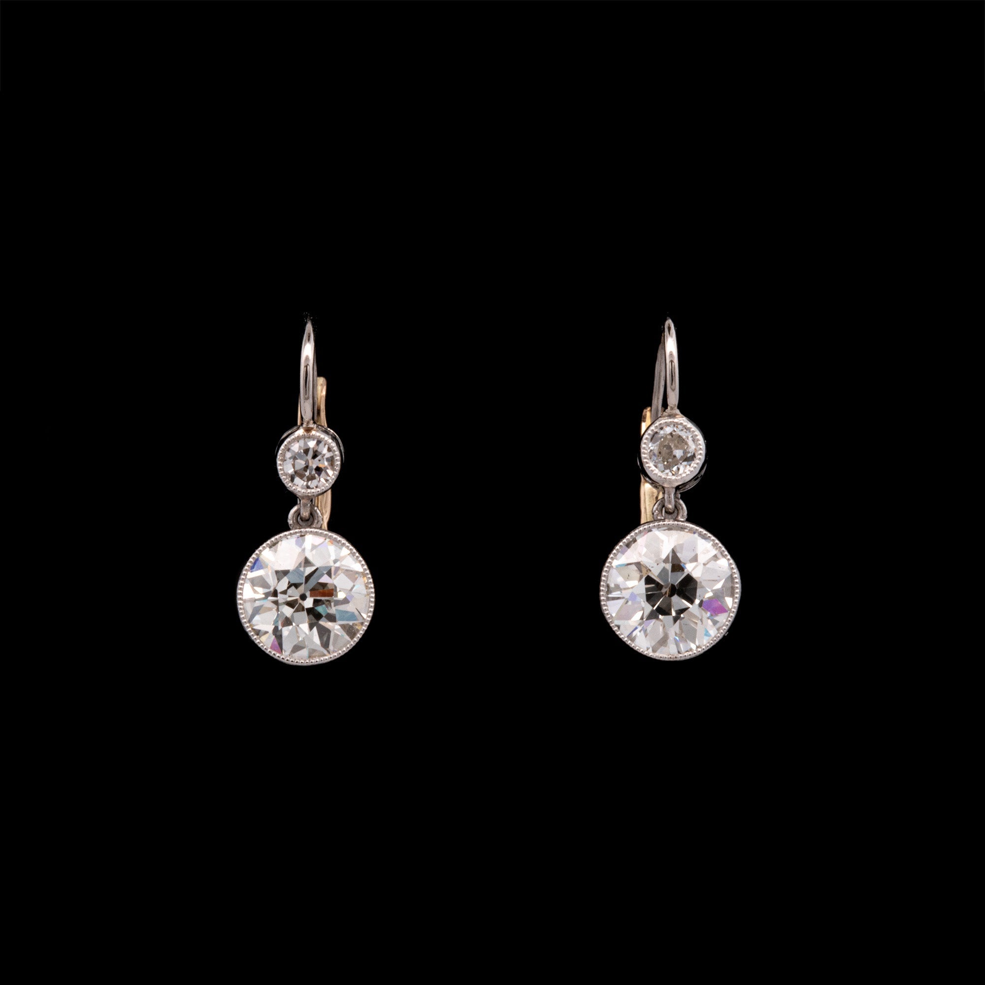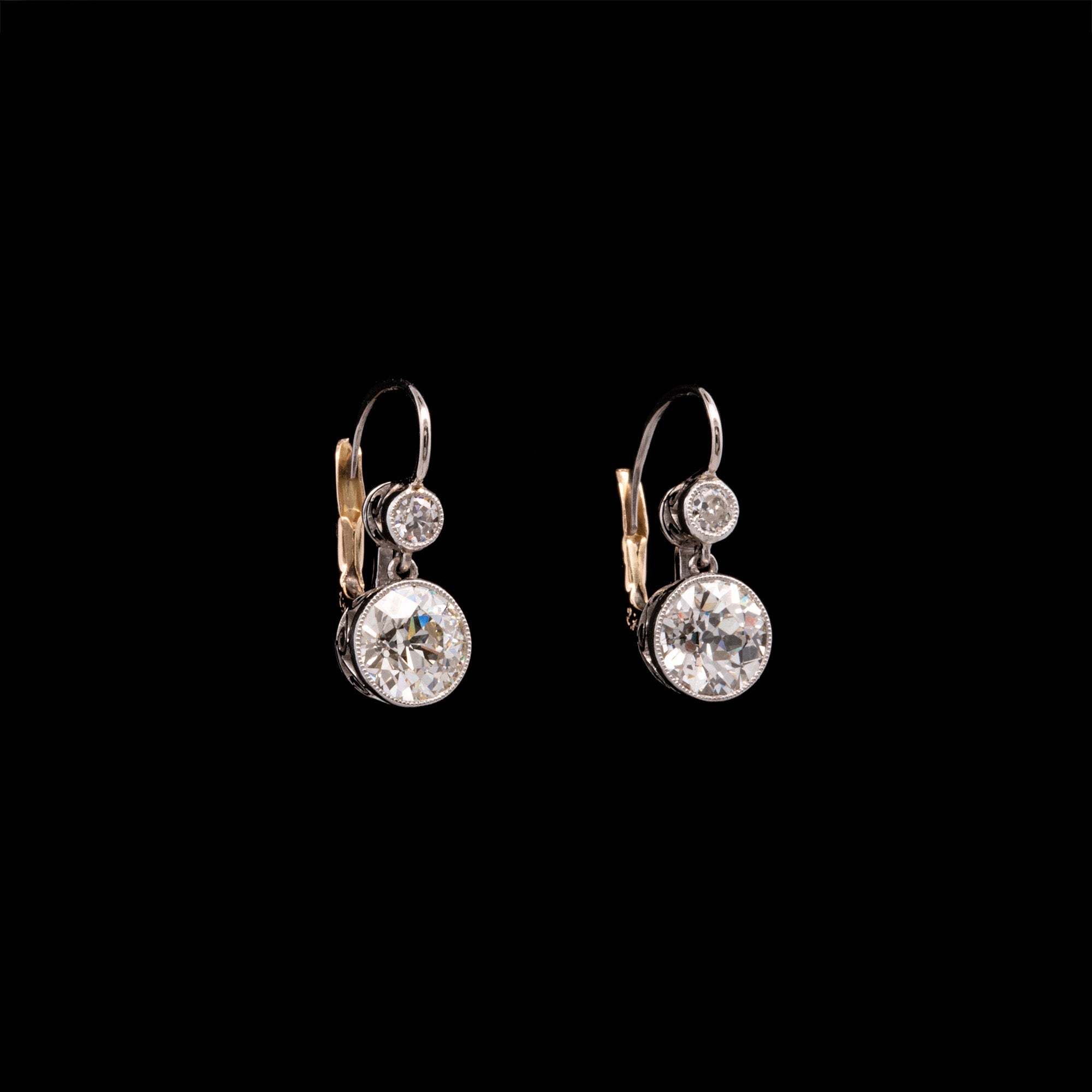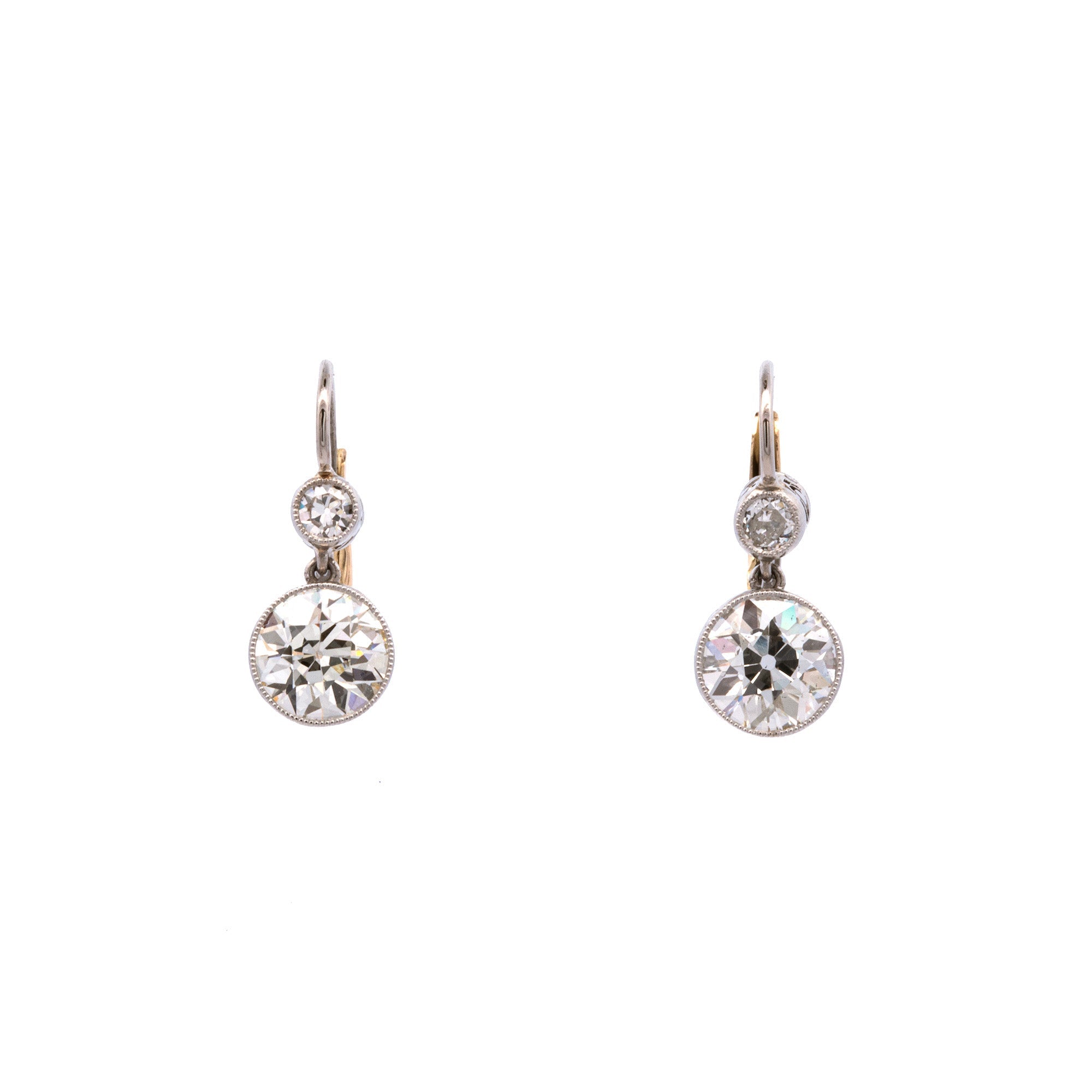 Platinum And 18K Yellow Gold Old Mine Cut Diamond Drop Earrings. Four Diamonds Weigh A Total Of 2.75 Carats And Have I-J Color, SI Clarity.
