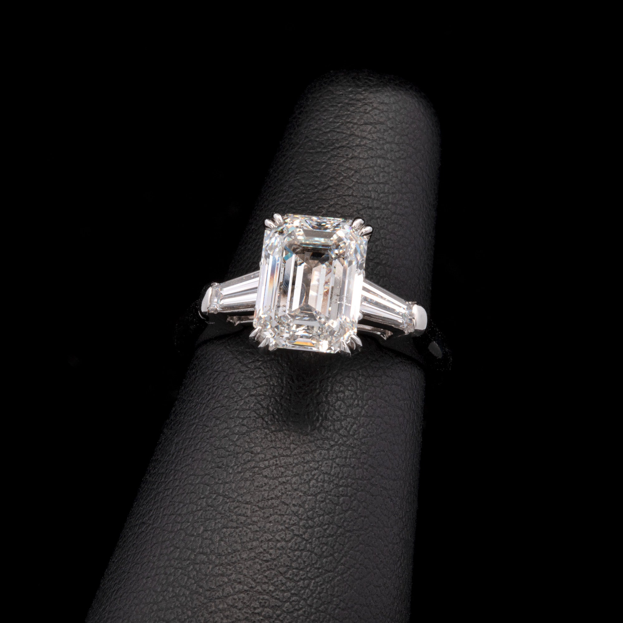 Platinum 3.02ctw Emerald Cut Diamond Engagement Ring With Tapered Baguettes. Emerald Cut Diamond Weighs 3.02 Carats And Has H Color, SI2 Clarity; GIA Certified. Two Tapered Baguette Diamonds Weigh A Total Of 0.40 Carats. Sizing Available.