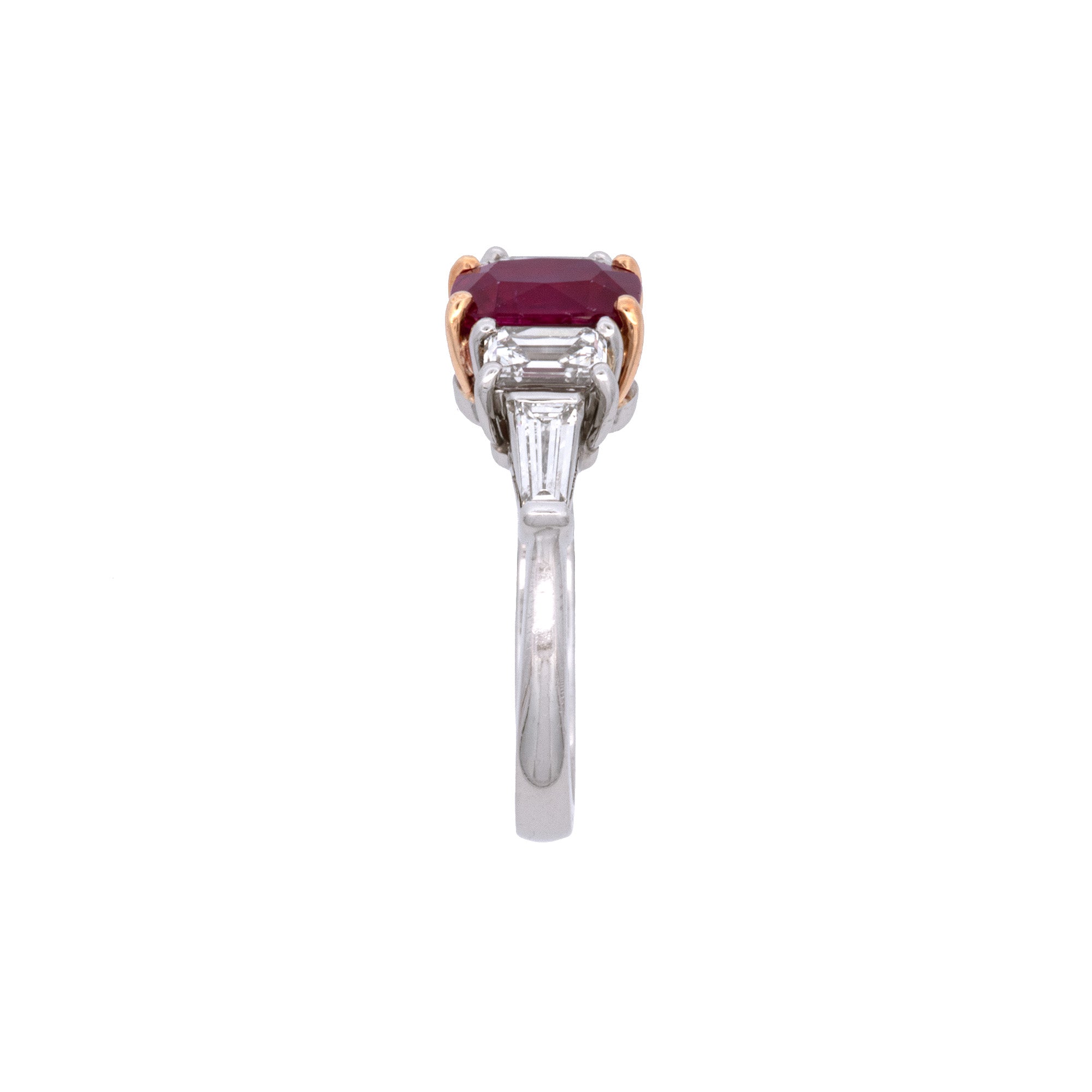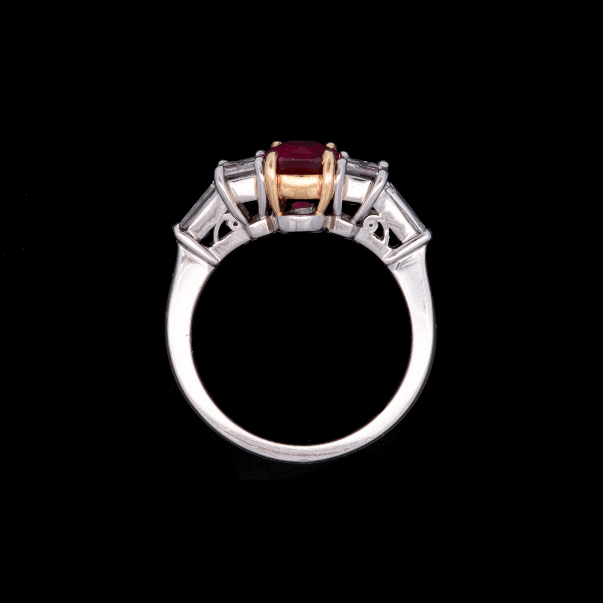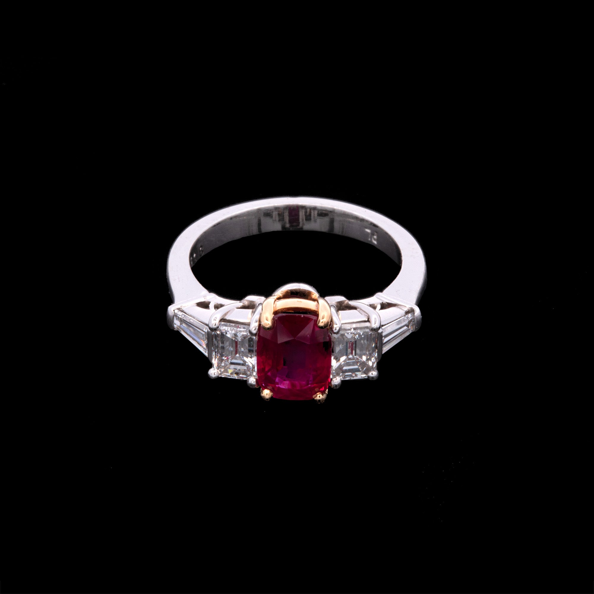 Platinum And 18K Yellow Gold Cushion Cut Ruby And Diamond Ring. Ruby Weighs 1.72 Carats. Diamonds Weigh A Total Of 0.89 Carats And Have D-F Color, VVS Clarity. Sizing Available.