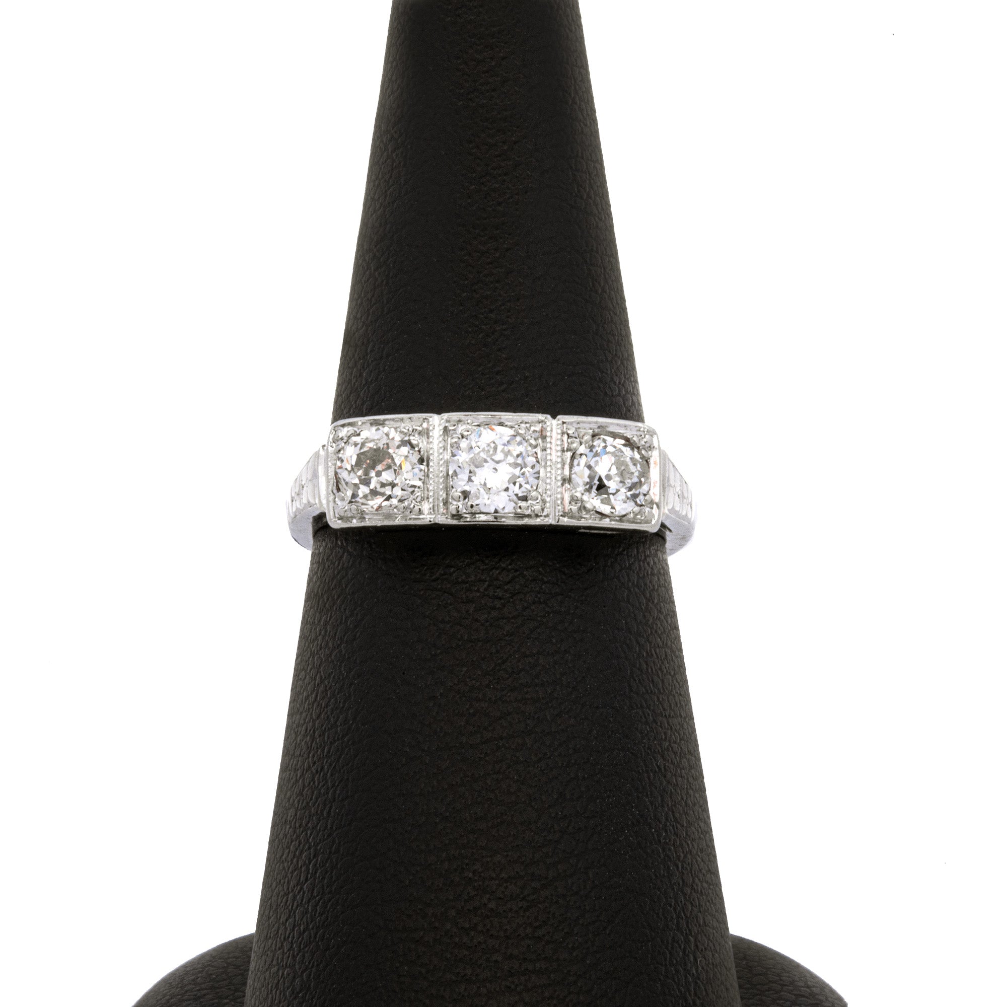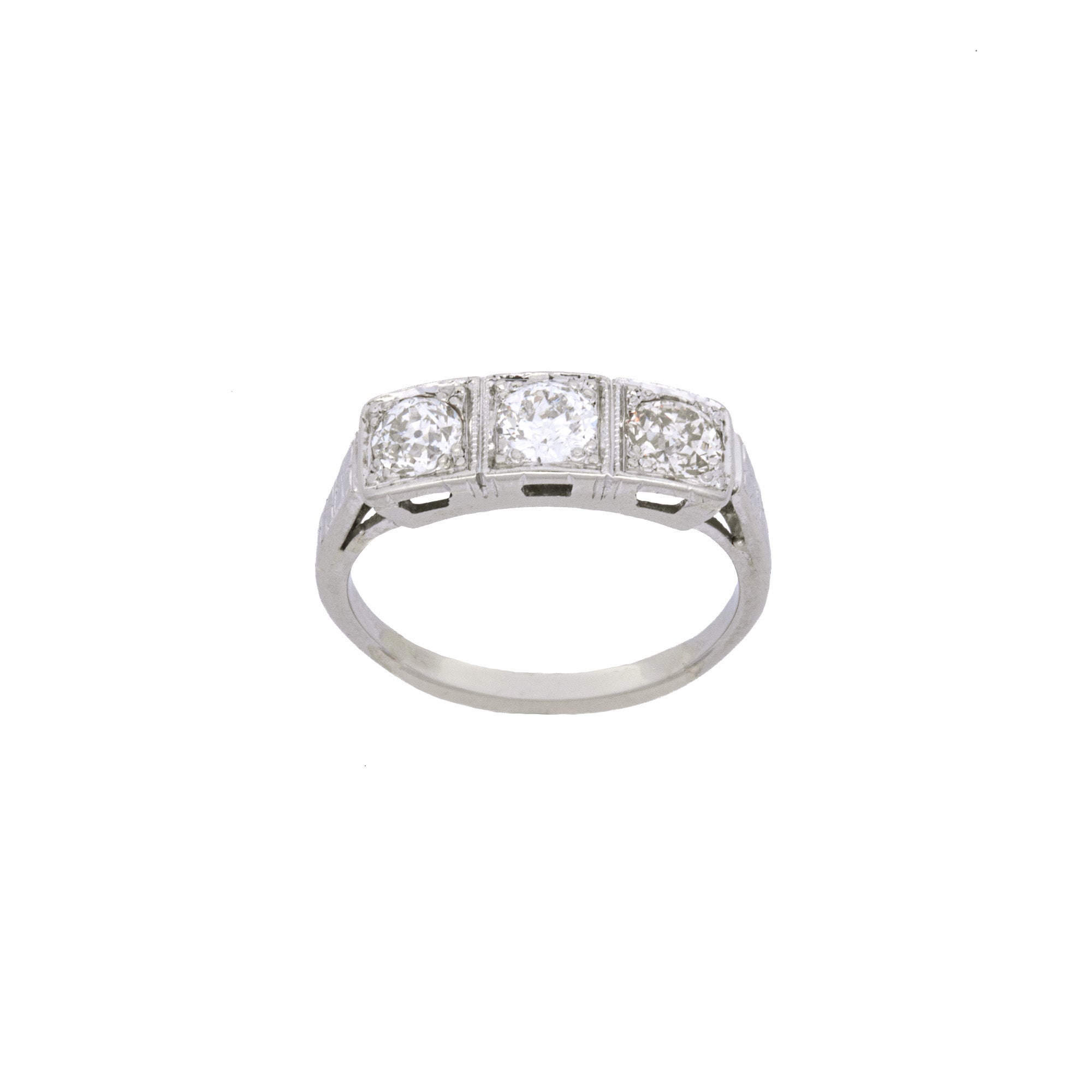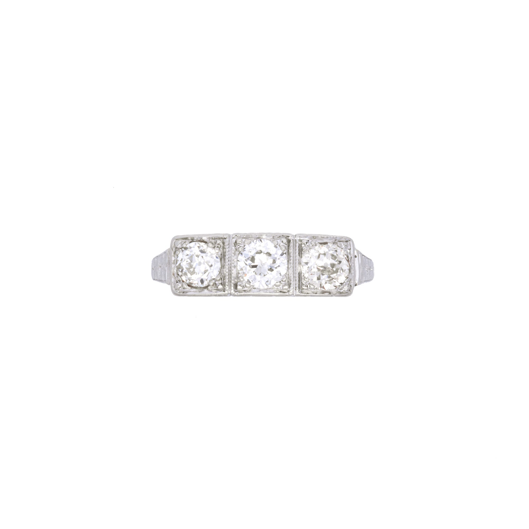 Platinum Art Deco 3 Old European Cut Diamond Ring. The Old European Cut Diamonds Weigh A Total Of 0.75 Carats And Have H-K Color And SI Clarity. The Ring Can Be Sized.