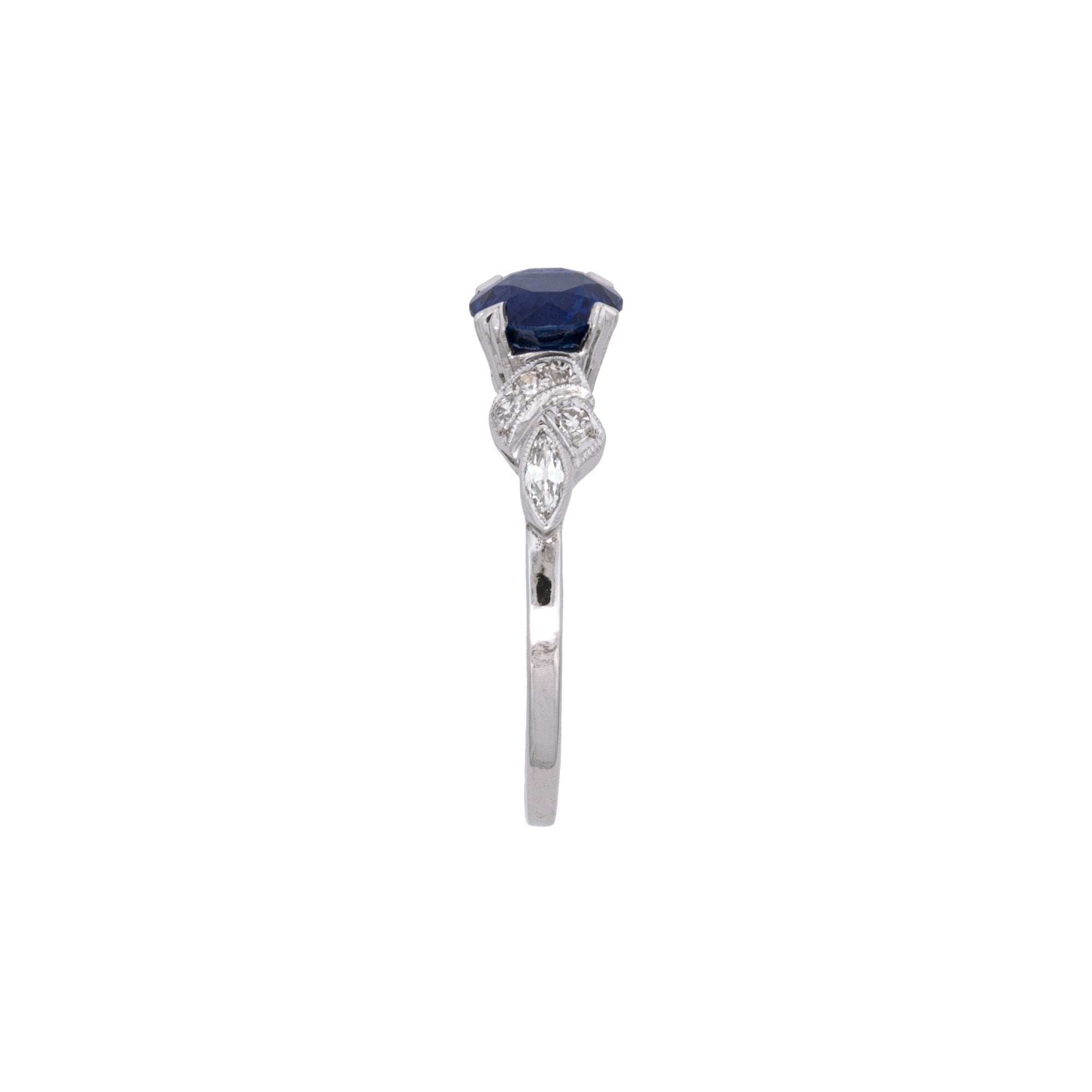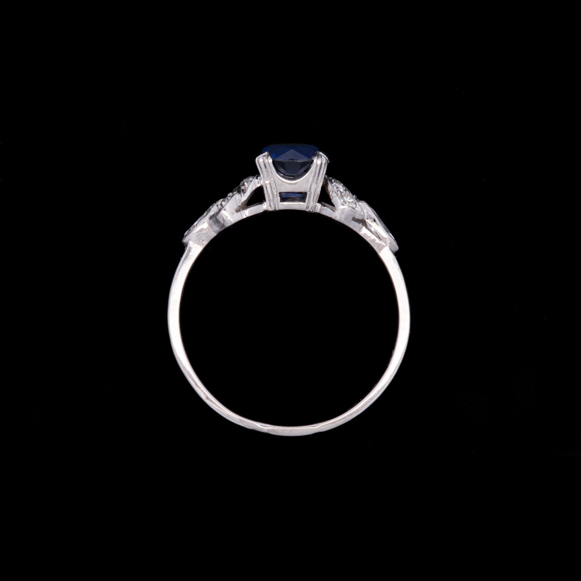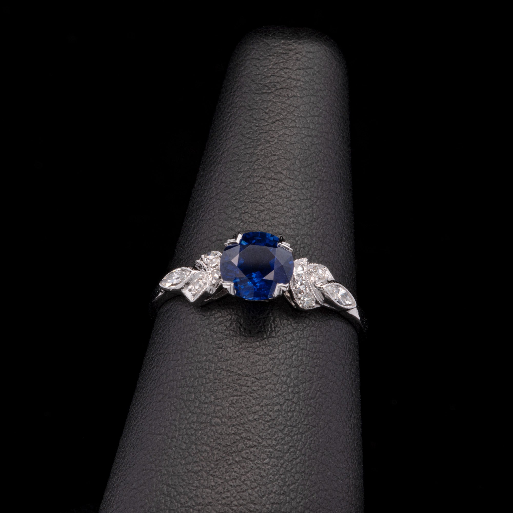 Platinum Art Deco Sapphire And Diamond Ring. Sapphire Weighs 1.14 Carats. Ten Diamonds Weigh A Total Of 0.22 Carats And Have G-H Color, VS2-SI1 Clarity. Sizing Available.