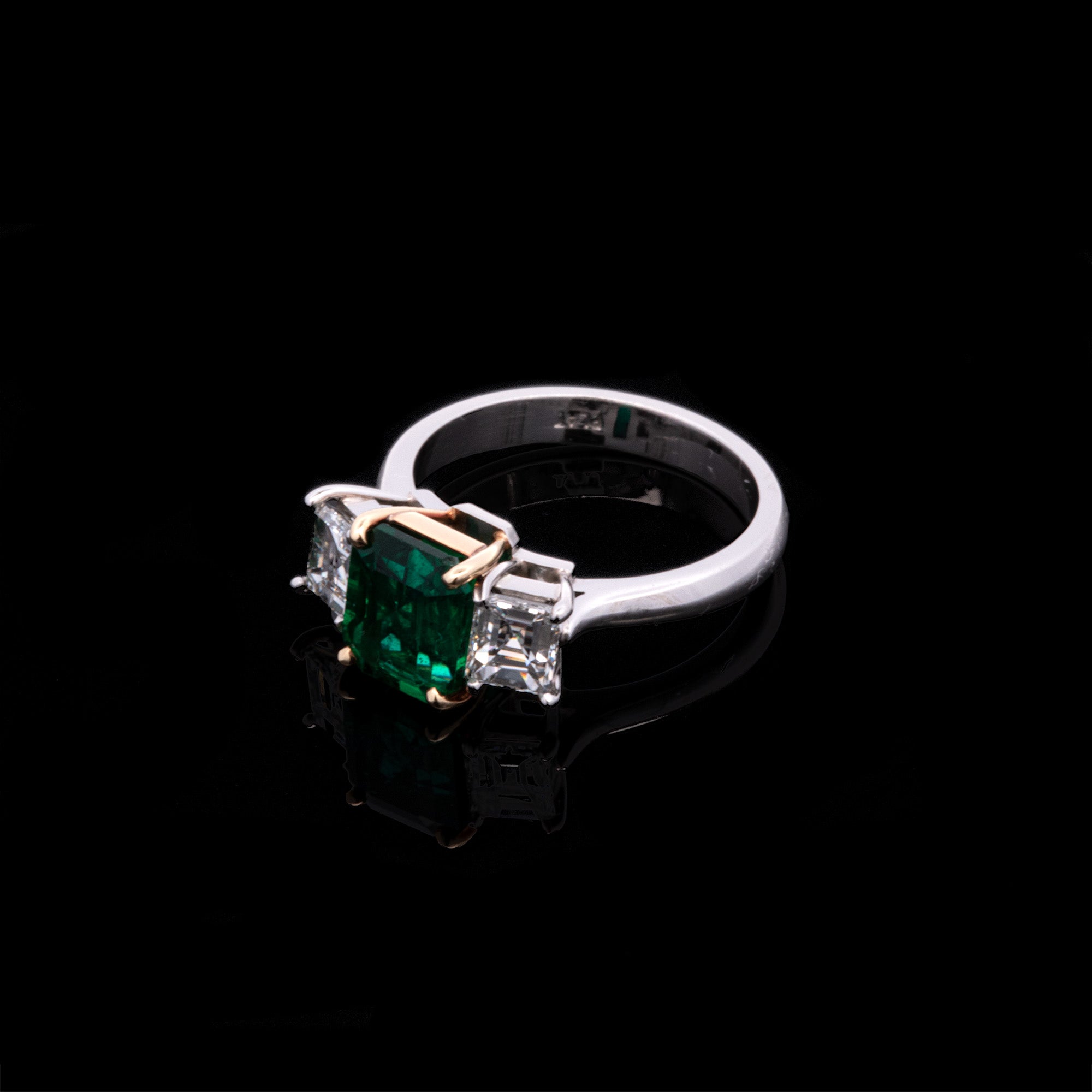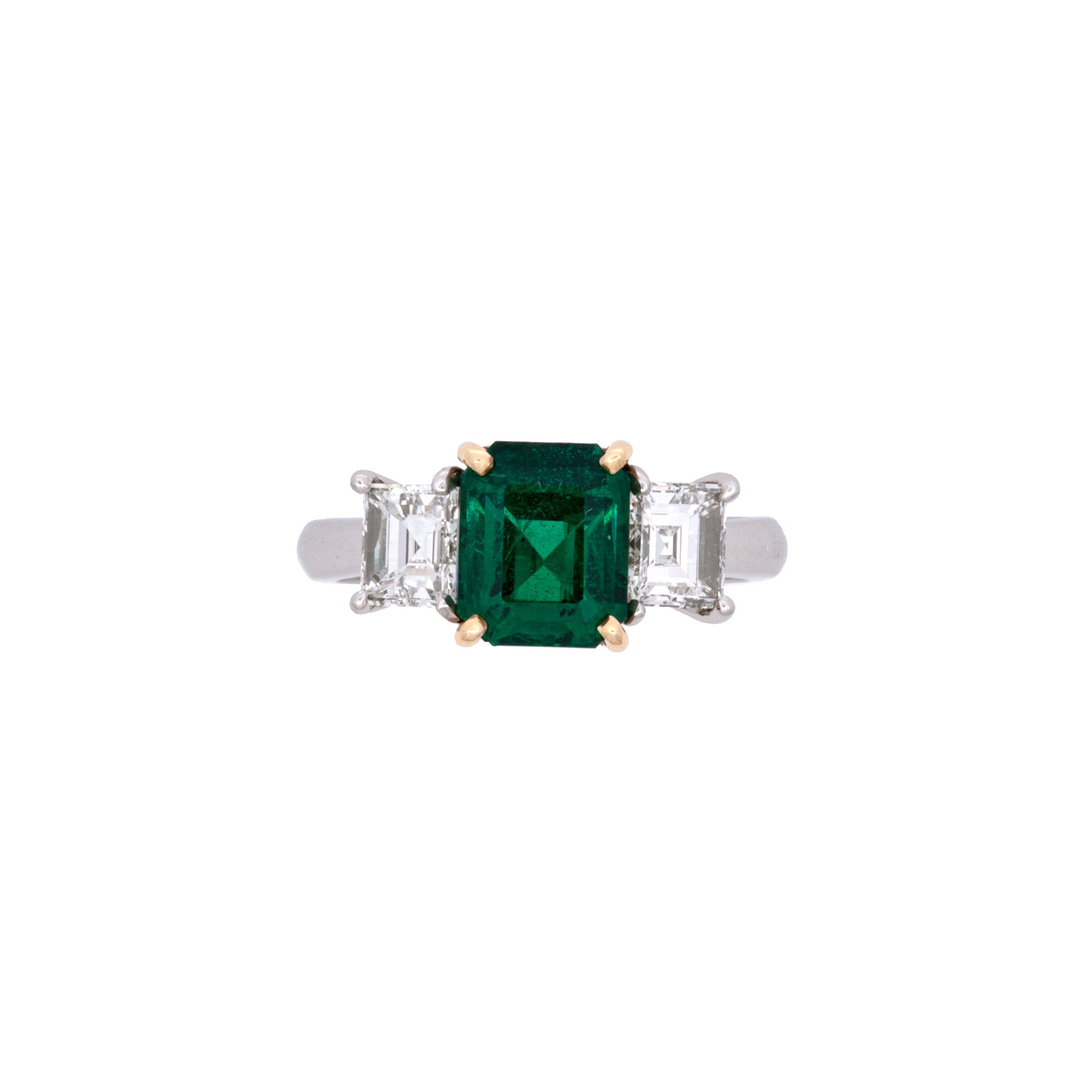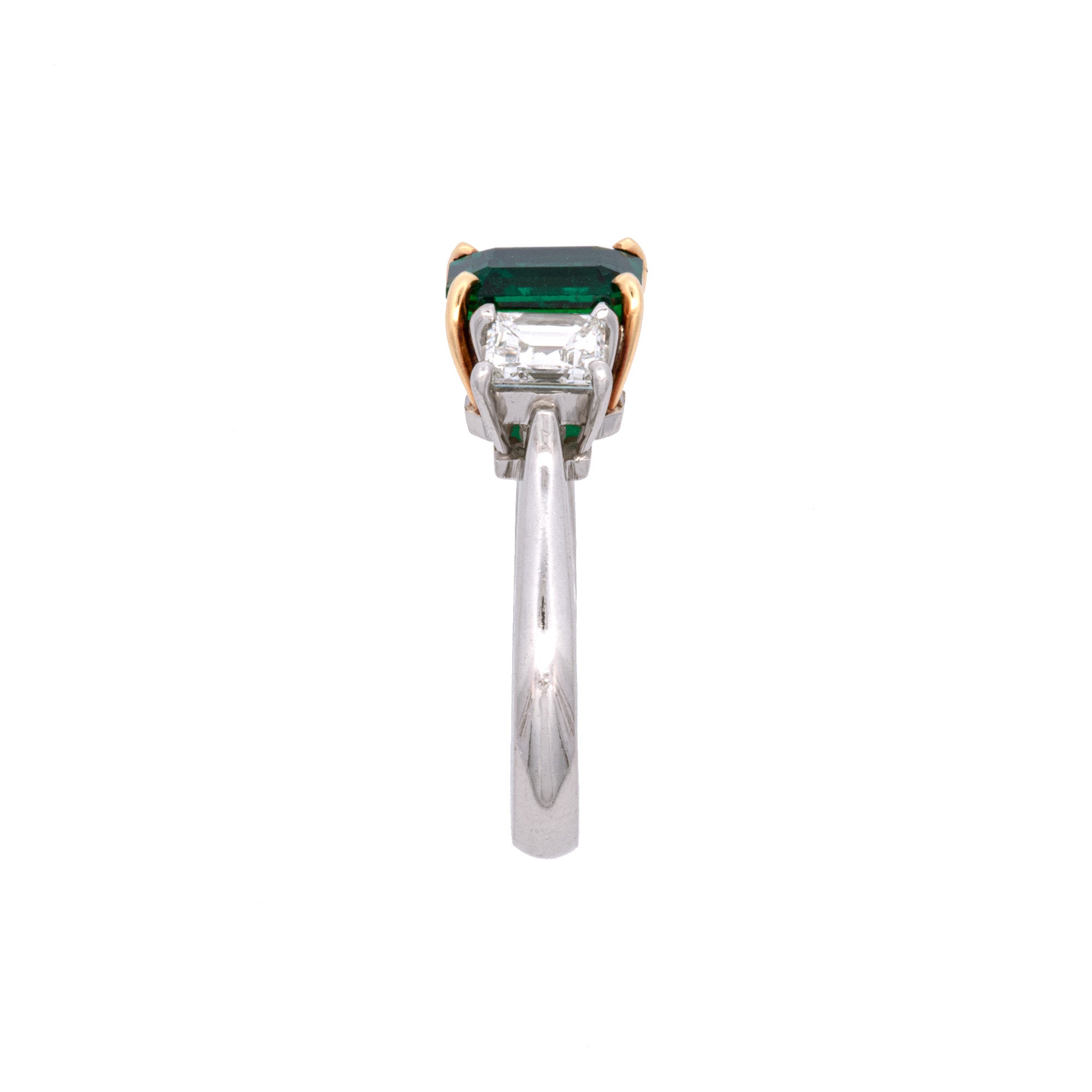 Platinum Emerald With 18K Yellow Gold Mounting And Rectangular Cut Diamond Ring. Emerald Weighs 1.75 Carats. Diamonds Weigh A Total Of 0.98 Carats. Sizing Available.