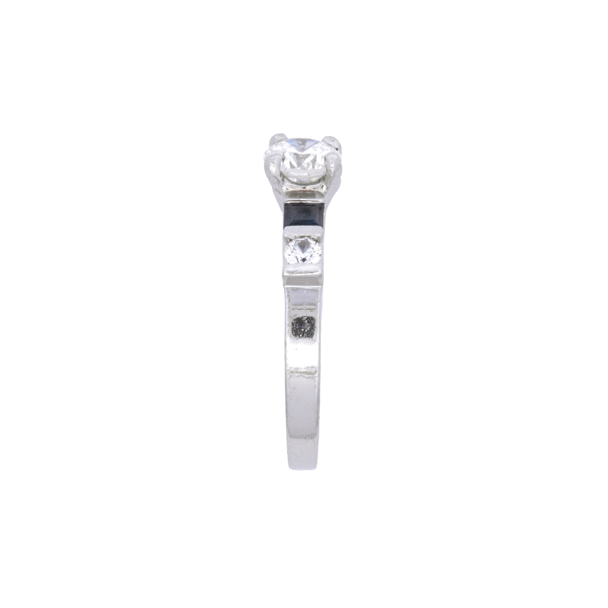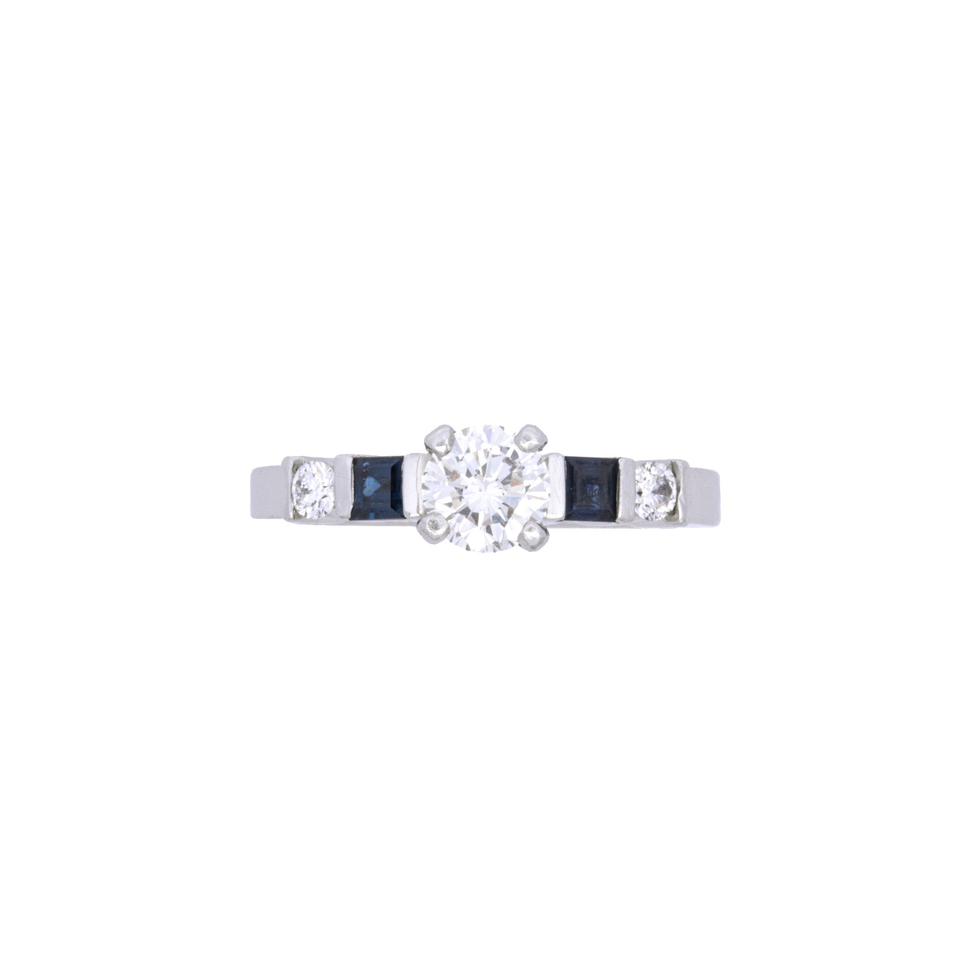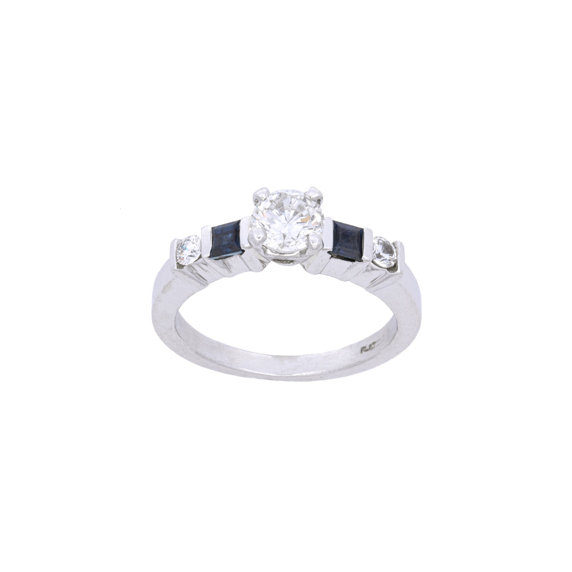 Platinum Sapphire And Diamond Engagement Ring. The Main Diamond Weighs 0.70 Carats And Has H Color And SI2 Clarity. The Other Diamonds Weigh A Total Of 0.11 Carats. The Sapphires Weigh A Total Of 0.30 Carats. The Ring Can Be Sized.
