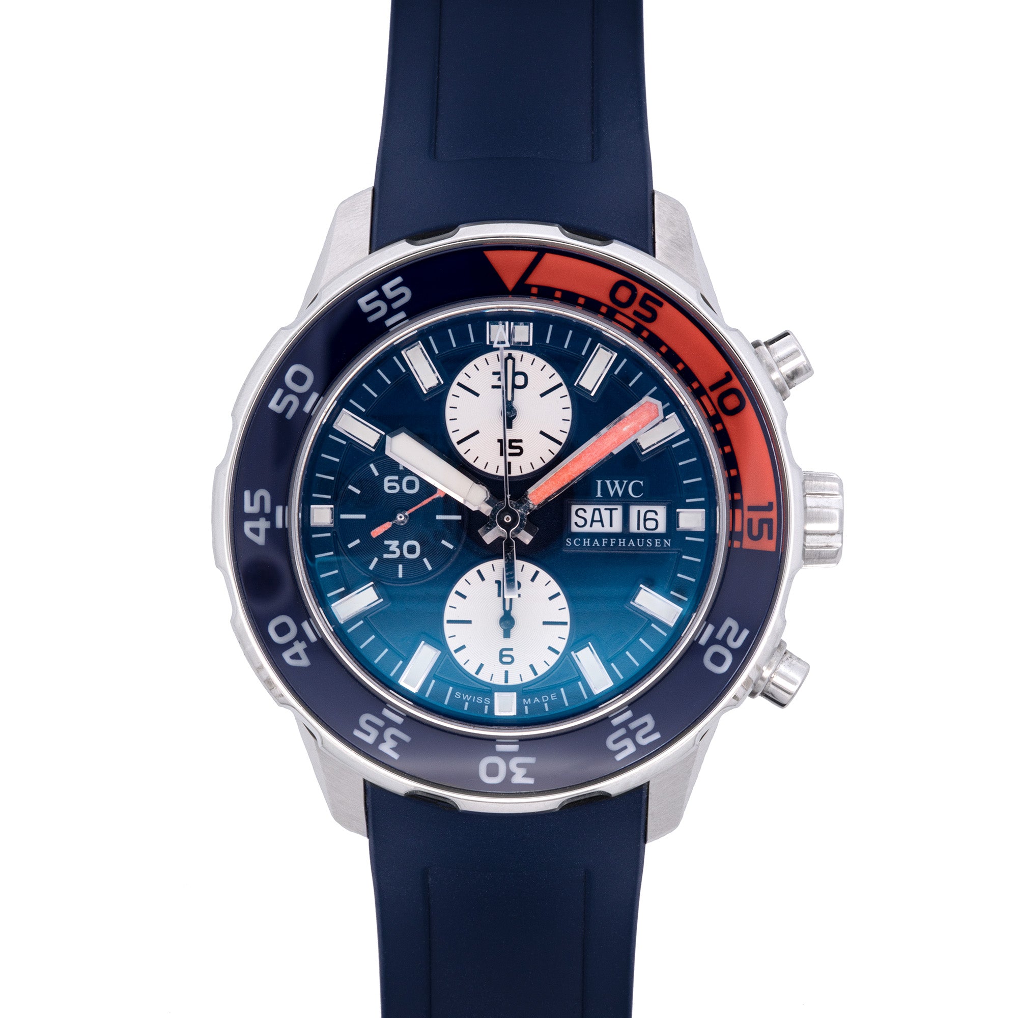 47mm Stainless Steel "International Watch Co." Aquatimer Chronograph Watch With Blue Rubber Strap. Comes With Box And Papers.