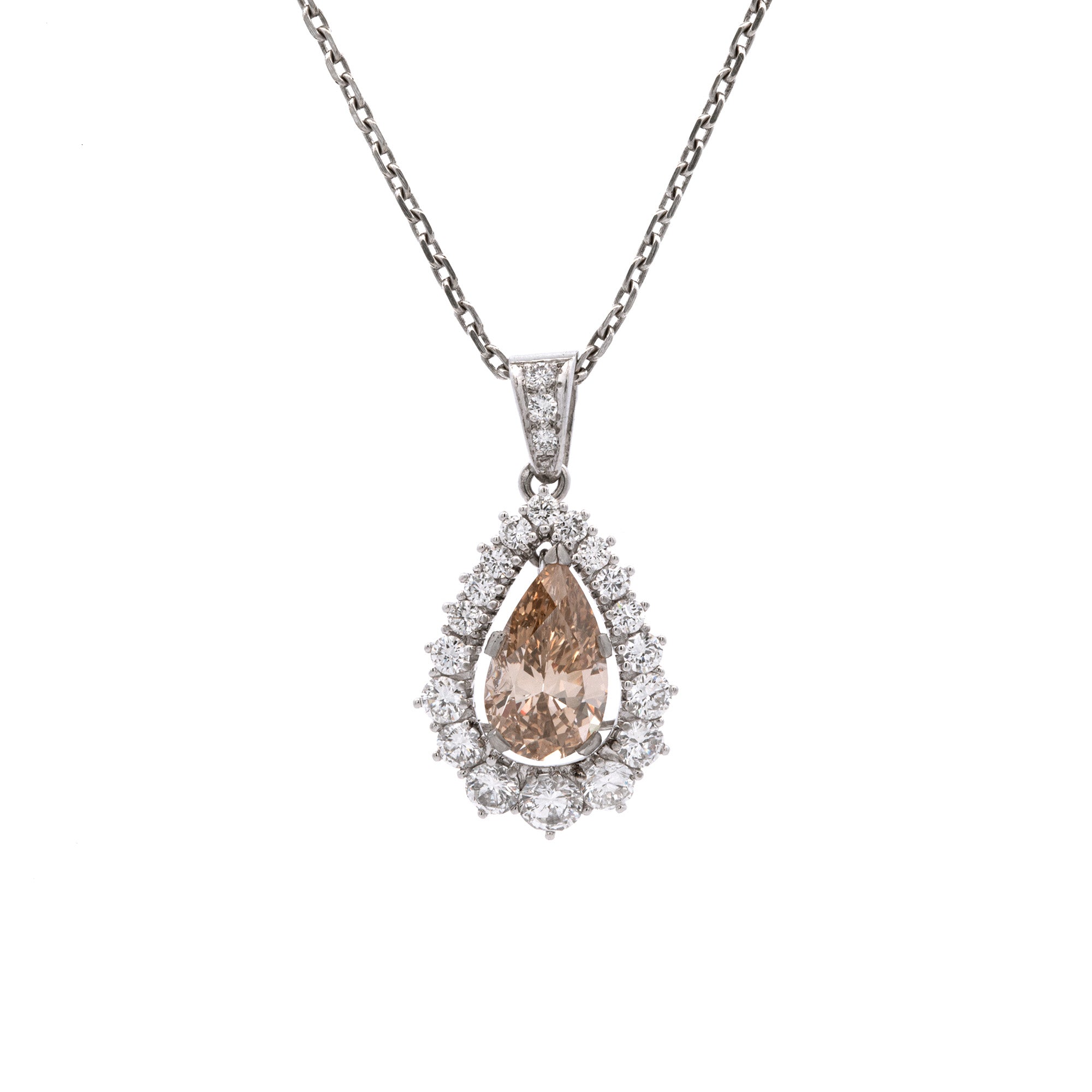 18K White Gold French Fancy Brown-Yellow Pear Cut Diamond Pendant With Diamond Halo