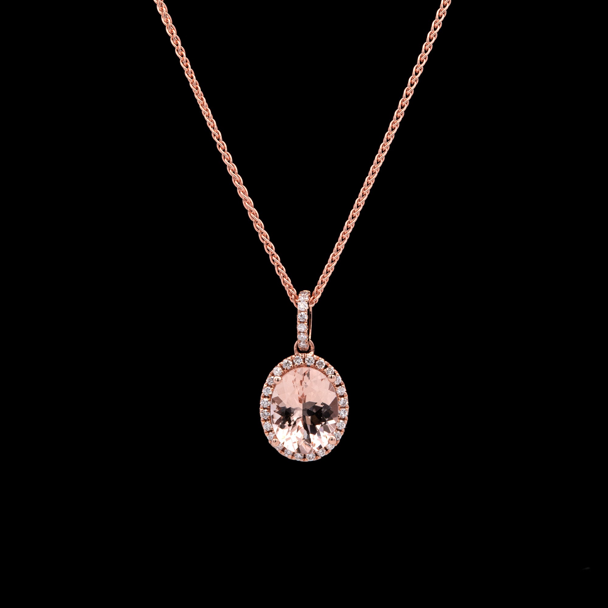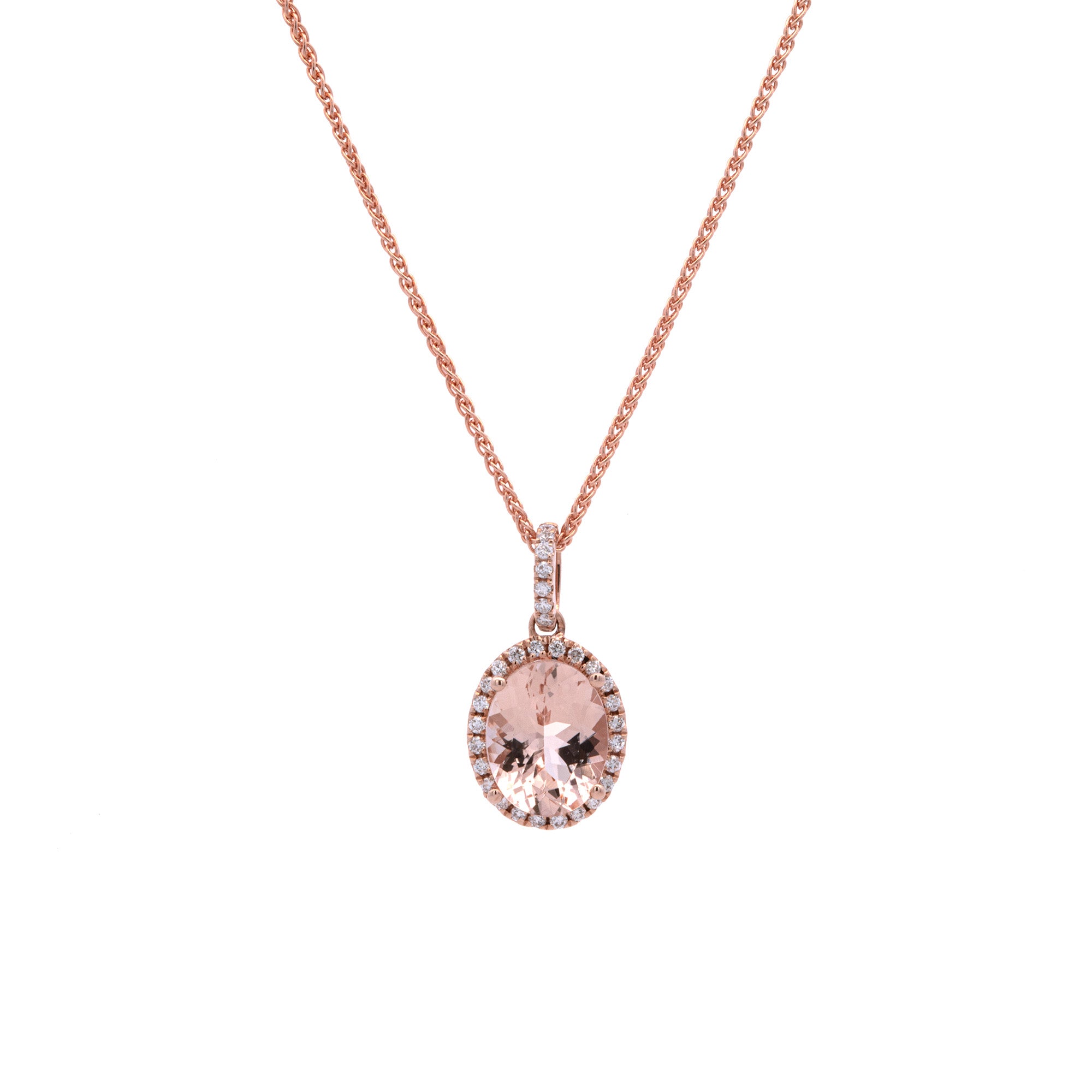 14K Rose Gold Morganite And Diamond Halo Pendant With 18 Inch Wheat Chain