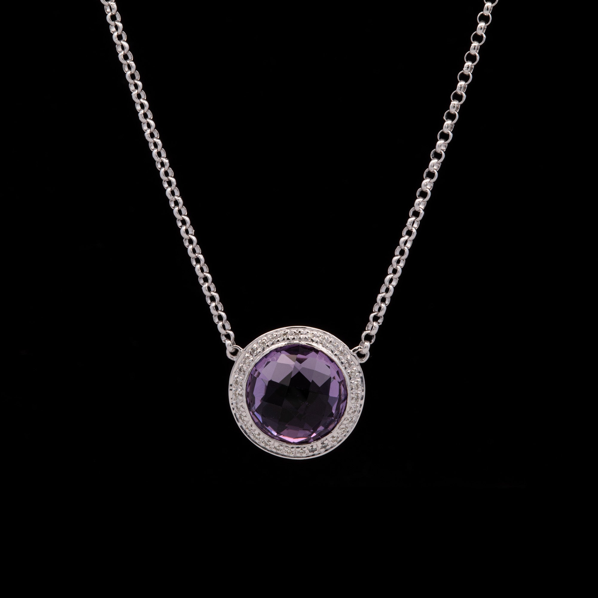 14KW Amethyst and Diamond Halo Pendant and Chain. A: 4.00cts; D: 0.08ctw