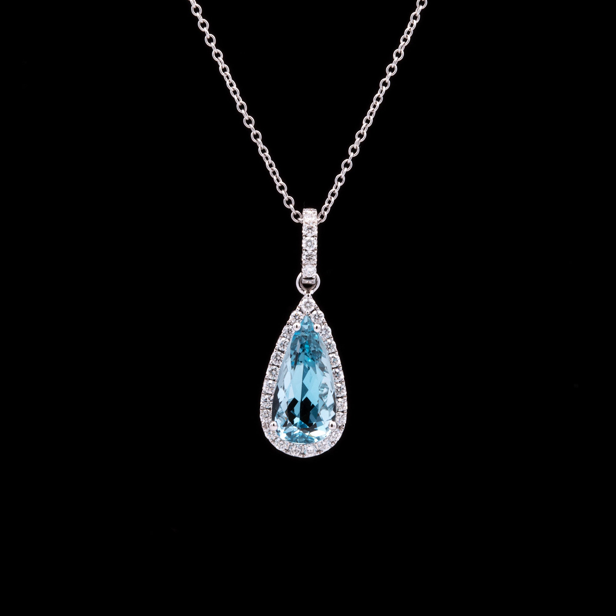 14K White Gold Aquamarine And Diamond Halo Pendant With 15 Inch Diamond Cut Cable Chain. Aquamarine Weighs 2.55 Carats. Diamonds Weigh A Total Of 0.35 Carats.