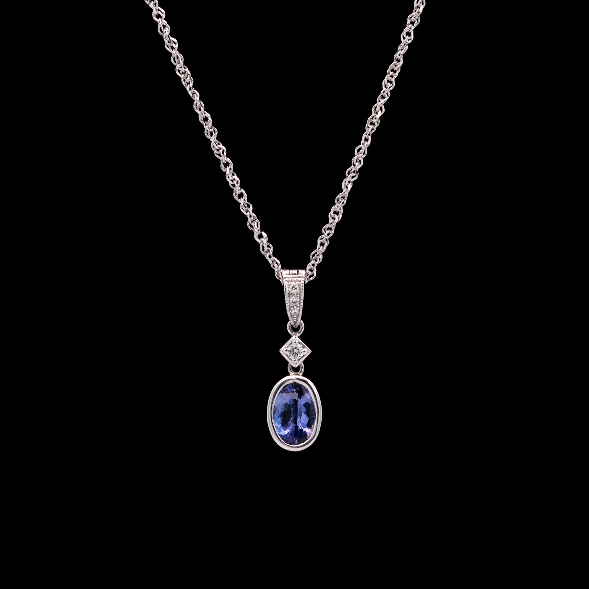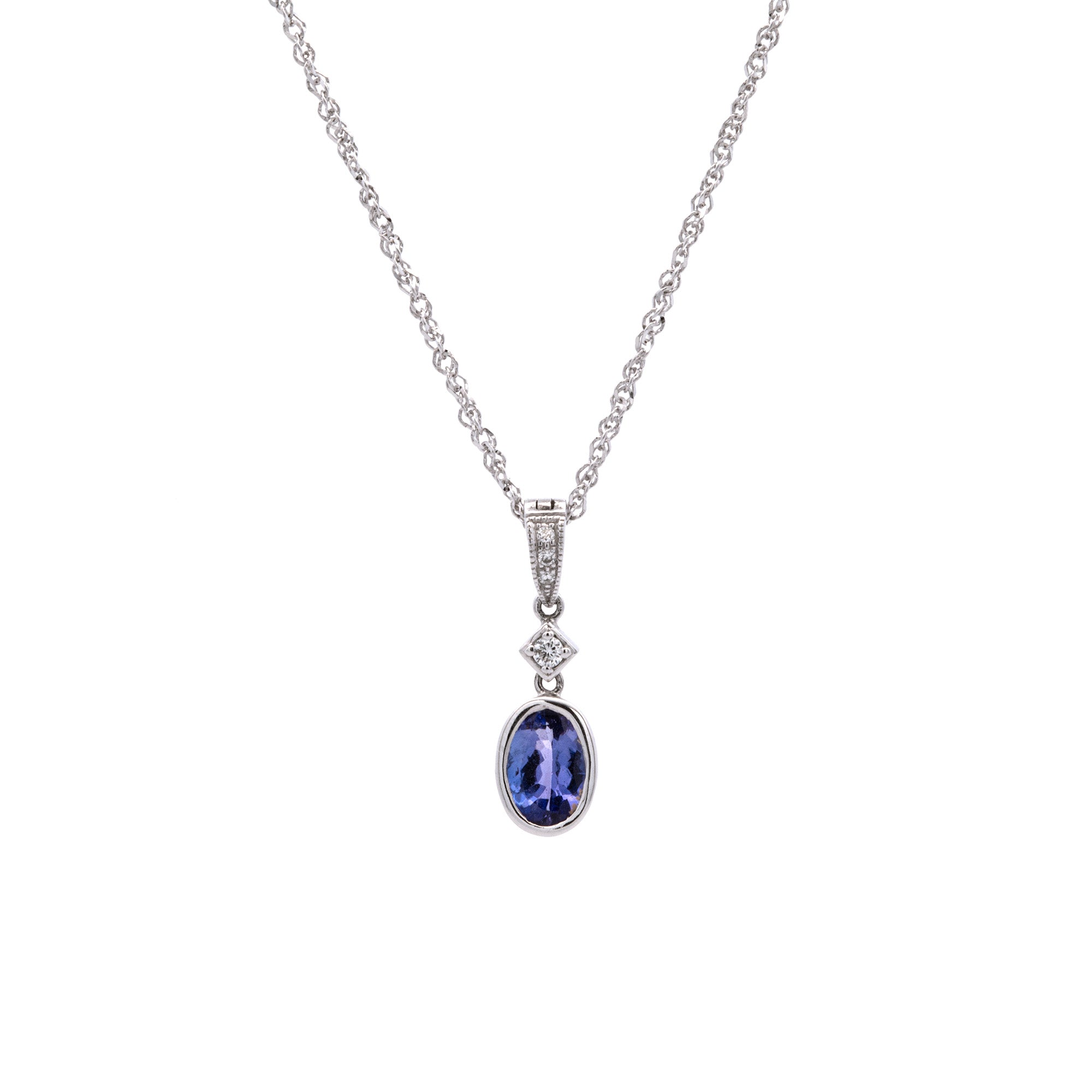14K White Gold Bezel Set Tanzanite And Diamond Pendant With 18 Inch Cable Chain
