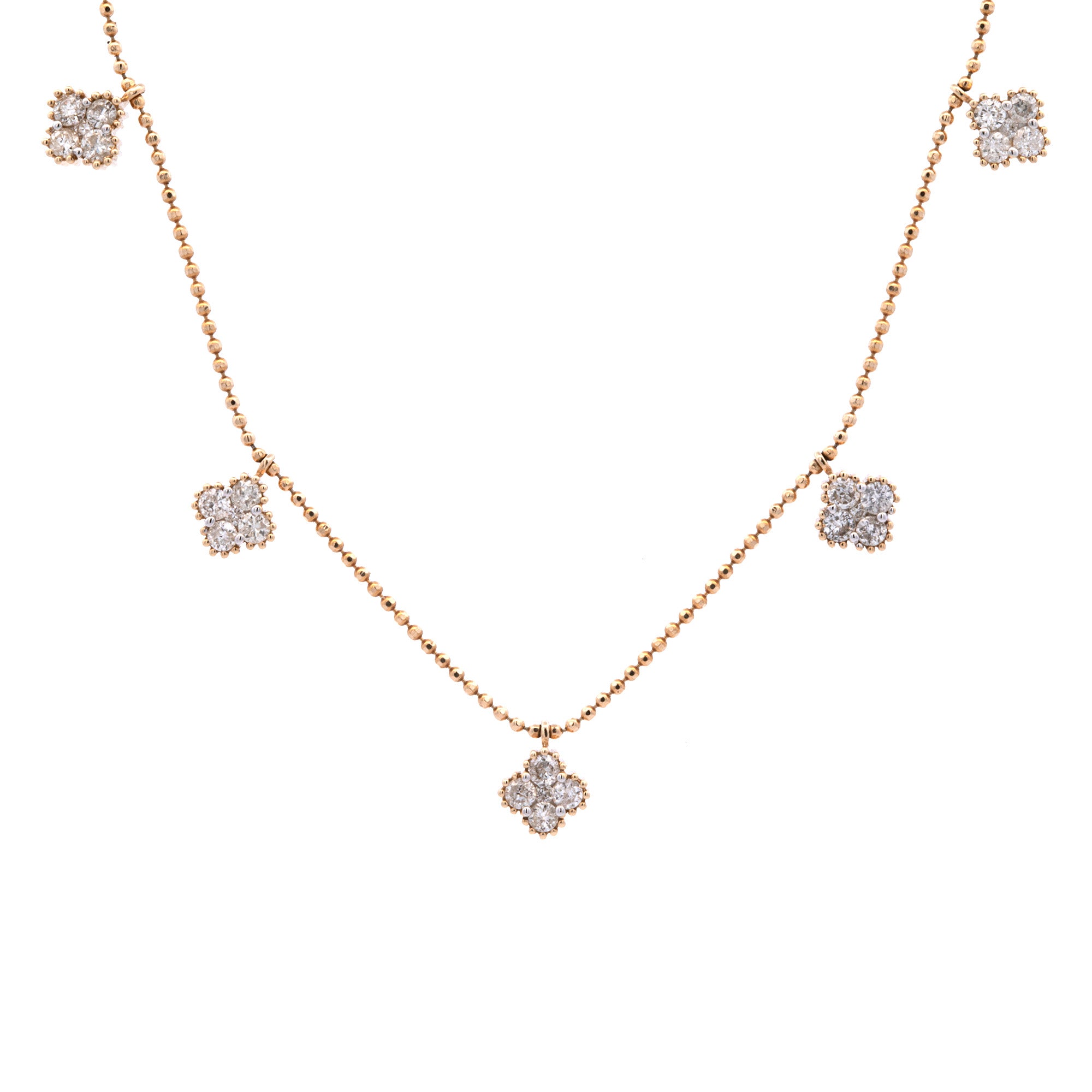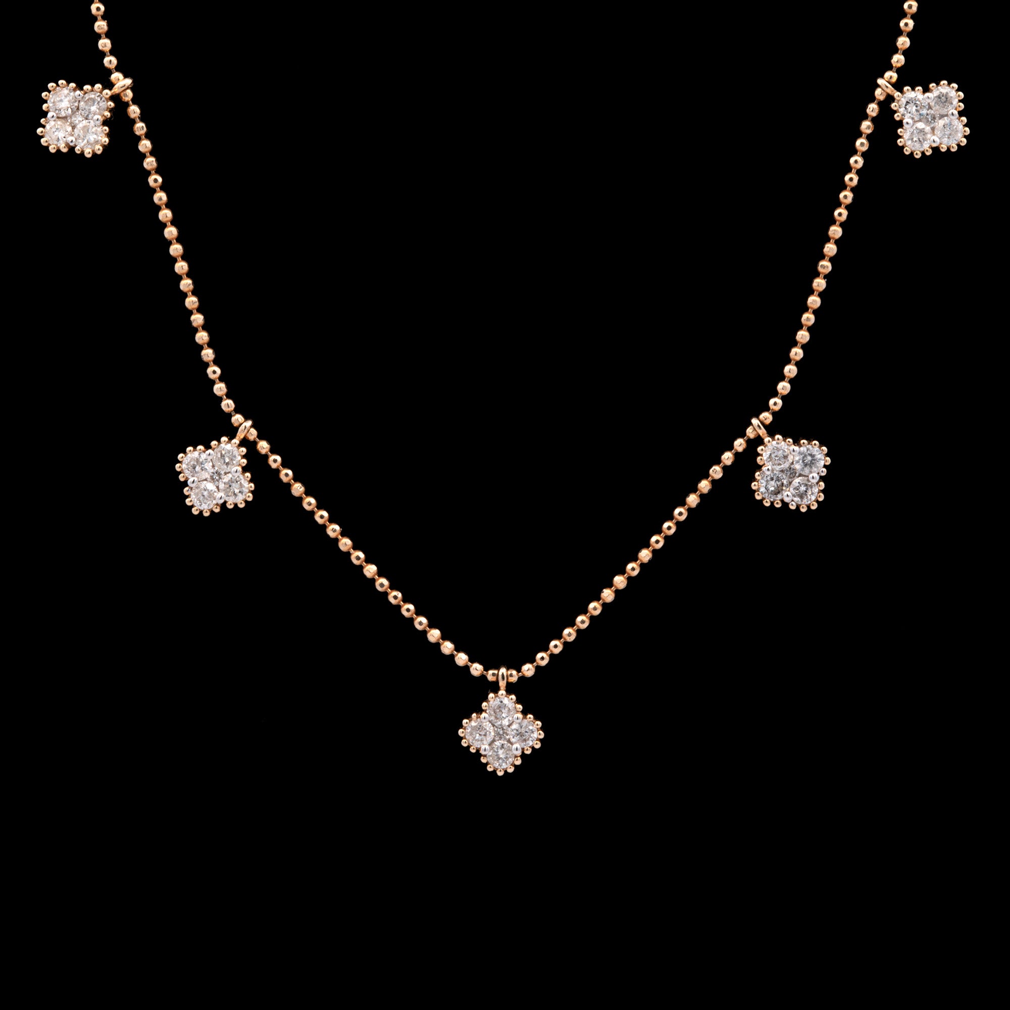 14K Yellow Gold Seven Station Diamond Clover Necklace, Adjustable 18 Inch Chain. Diamond Weigh A Total Of 1.06 Carats