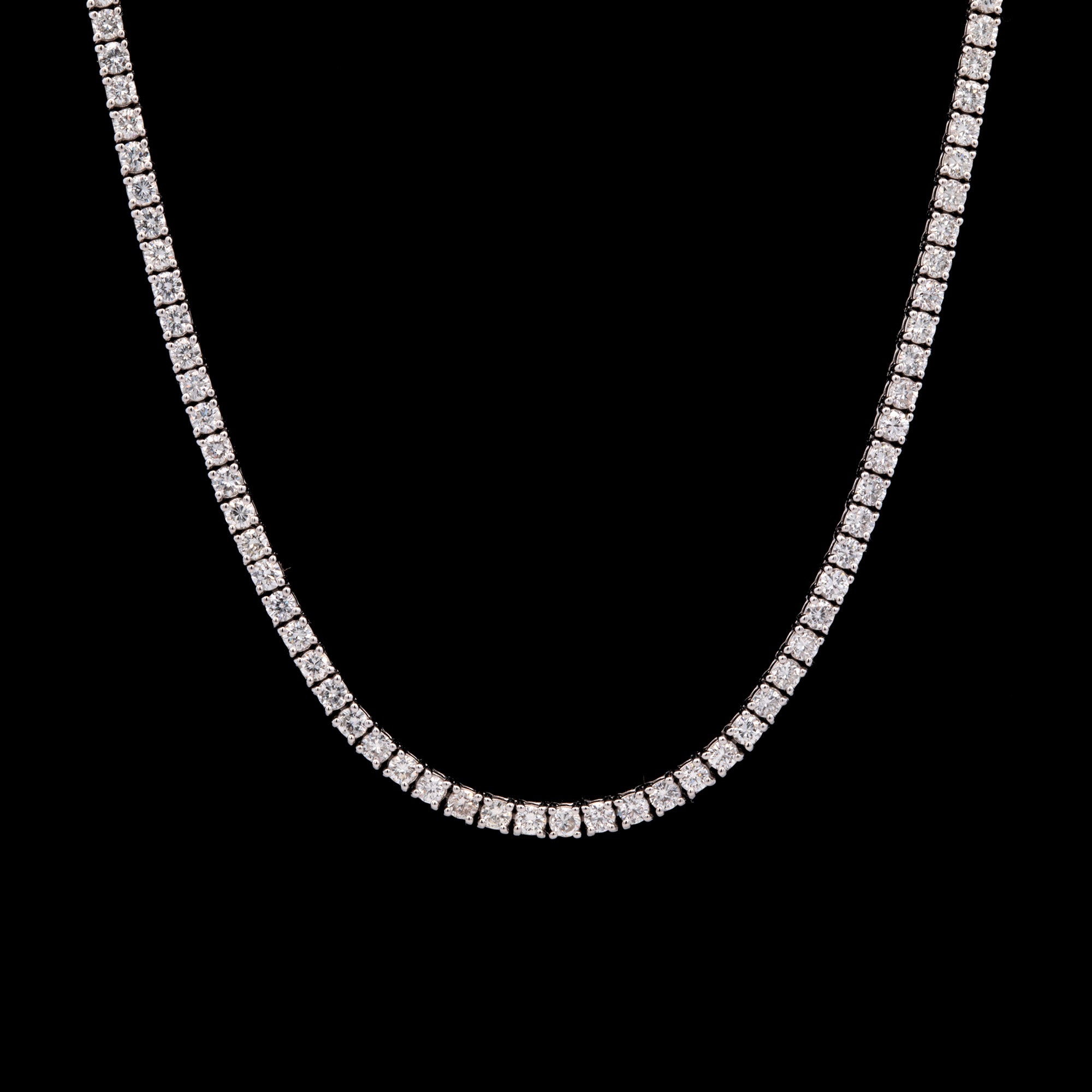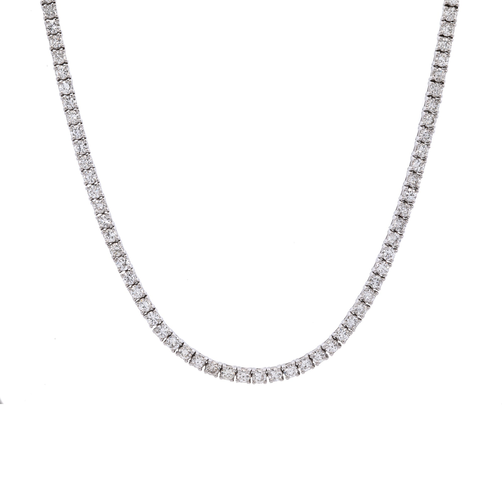 18K White Gold 11.60ctw Diamond Line Necklace, 17 Inches. One Hundred Six Diamonds Weigh A Total Of 11.60 Carats and have H-I Color, VS2 Clarity.