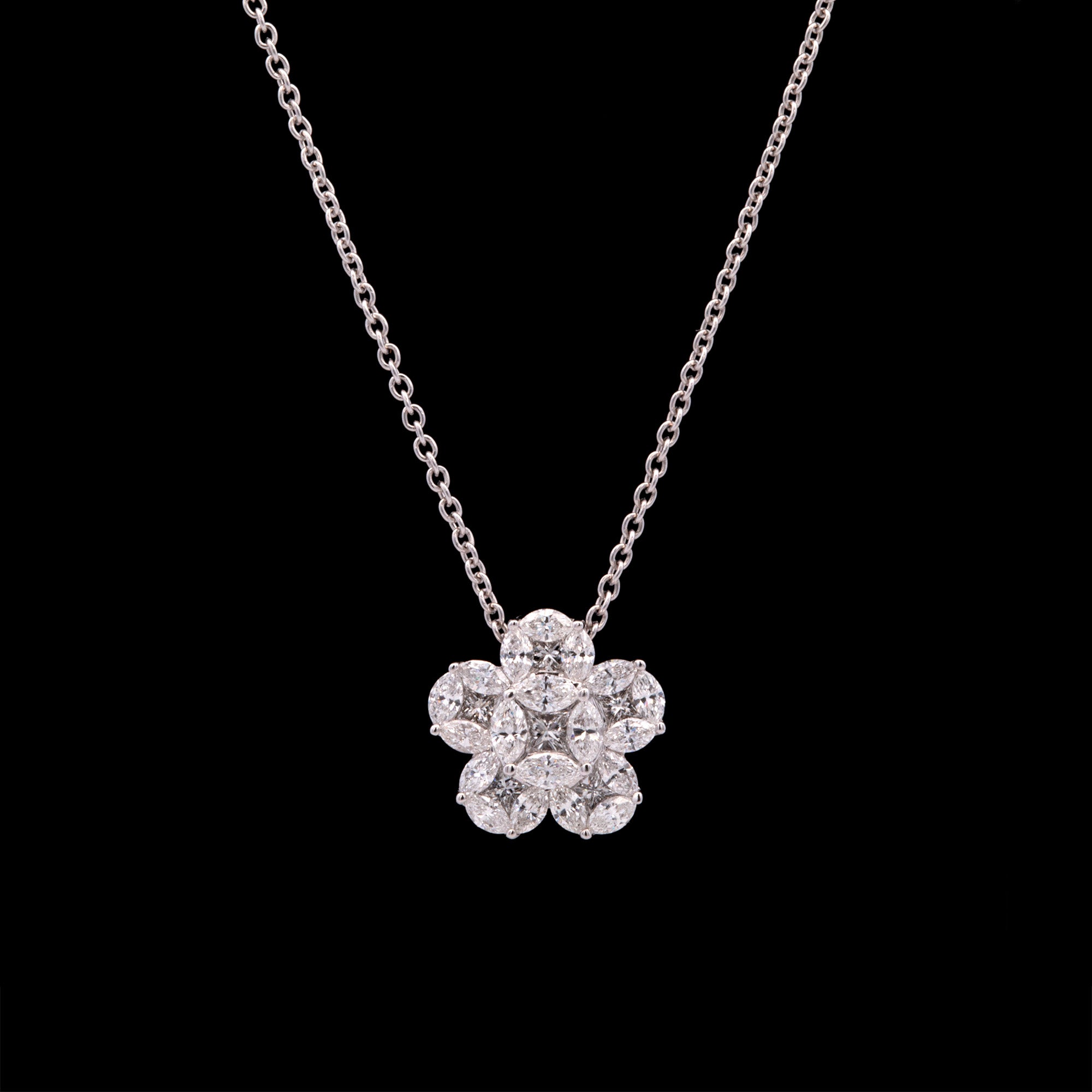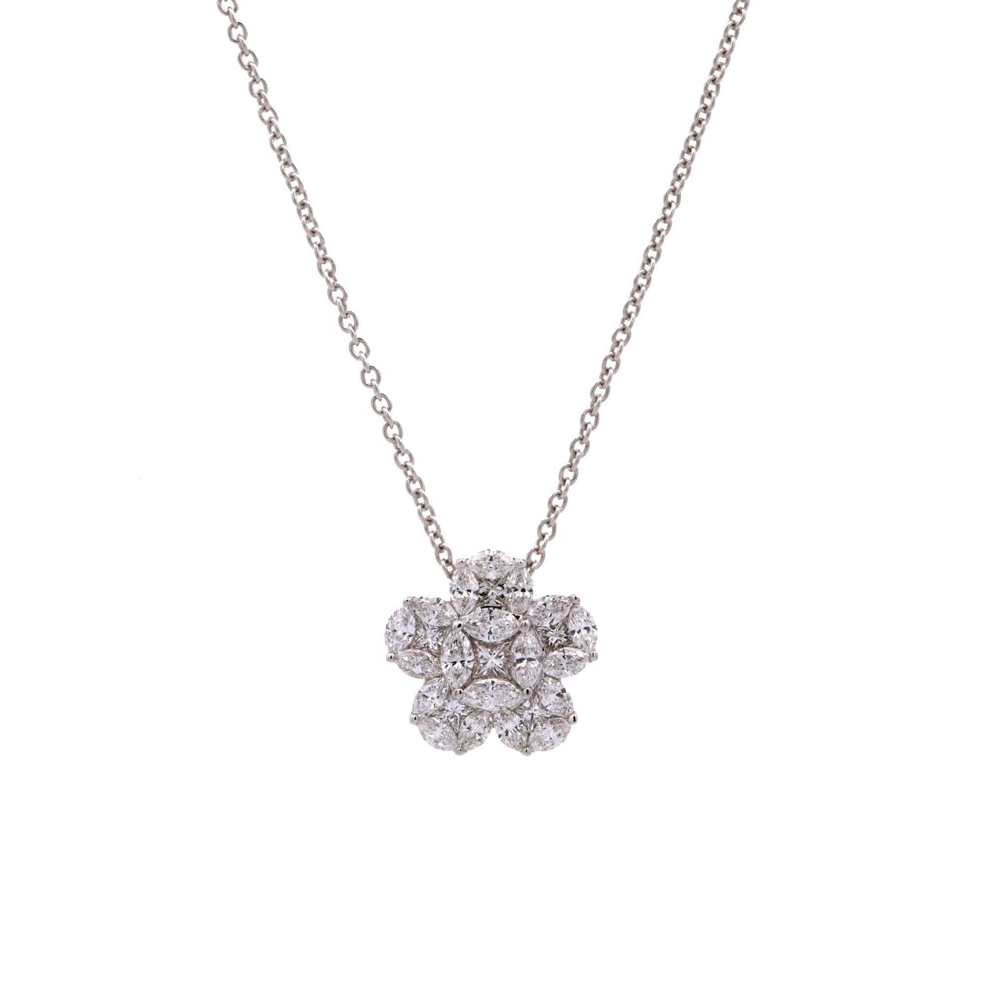 18K White Gold Illusion Set Diamond Flower Pendant And Chain