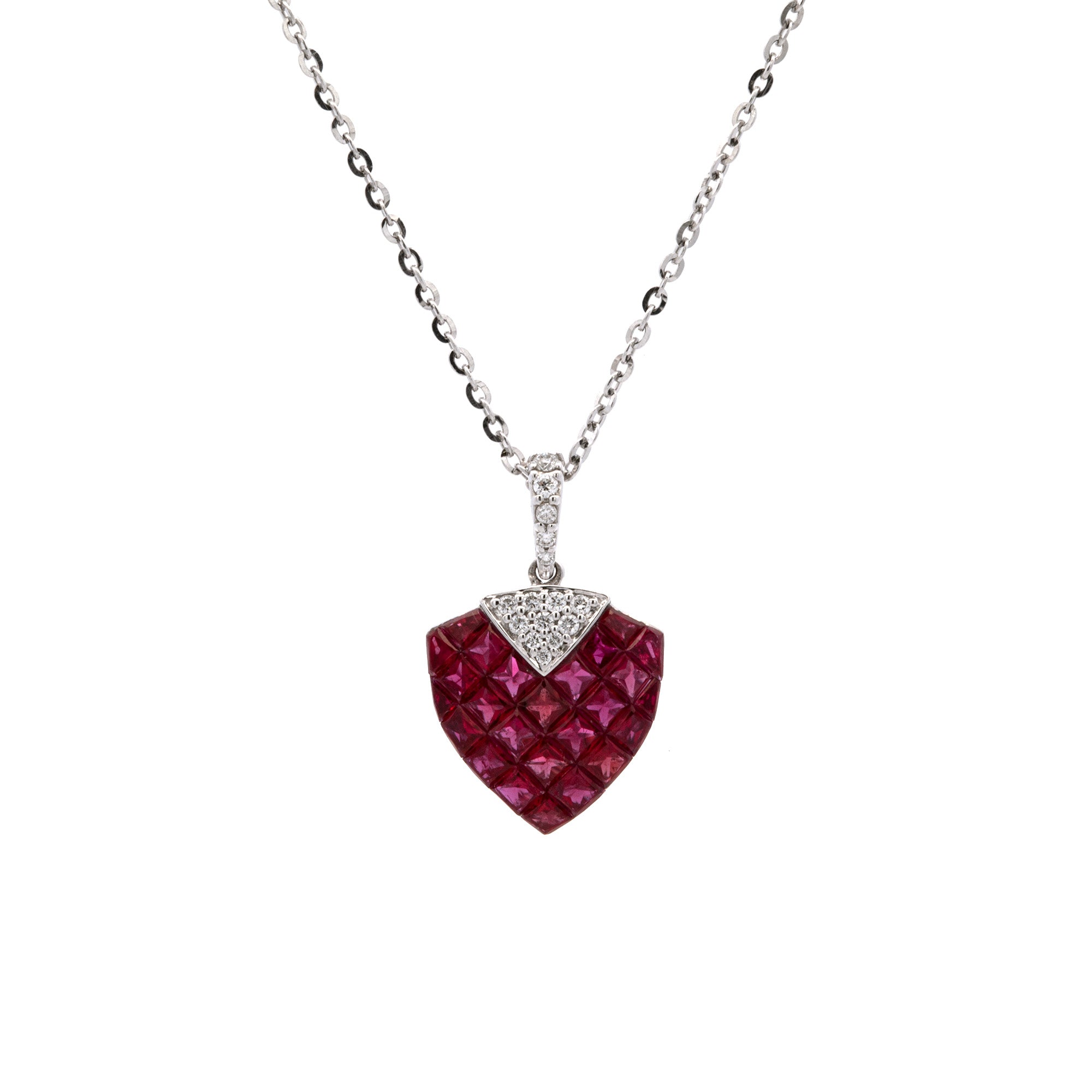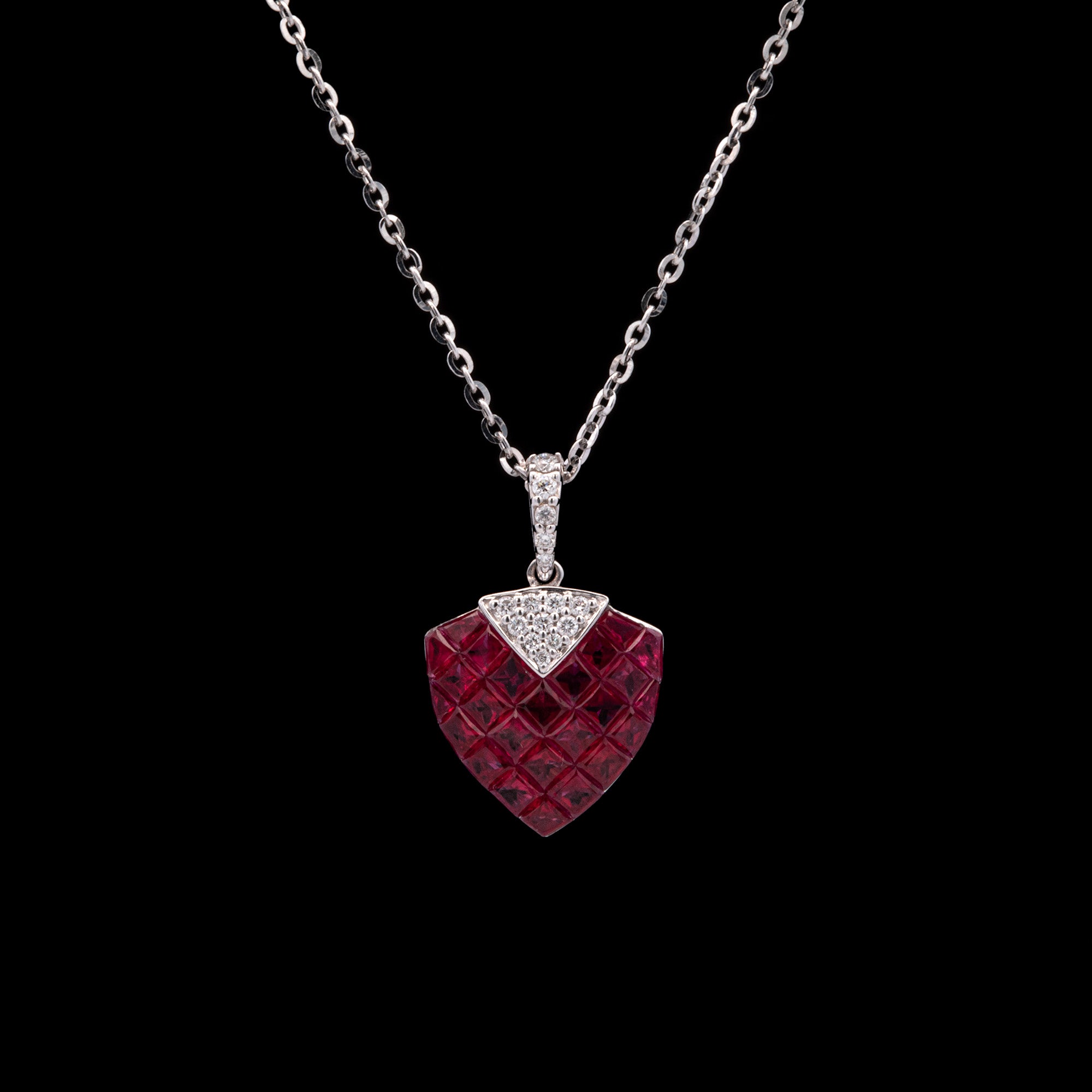 18K White Gold Invisible Set Ruby And Diamond Pendant With 18 Inch Chain