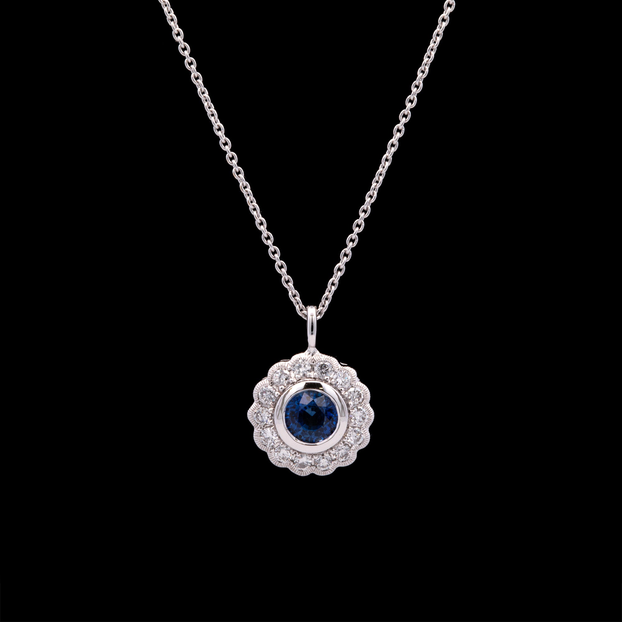 18K White Gold Sapphire And Diamond Floral Pendant With 16 Inch Chain