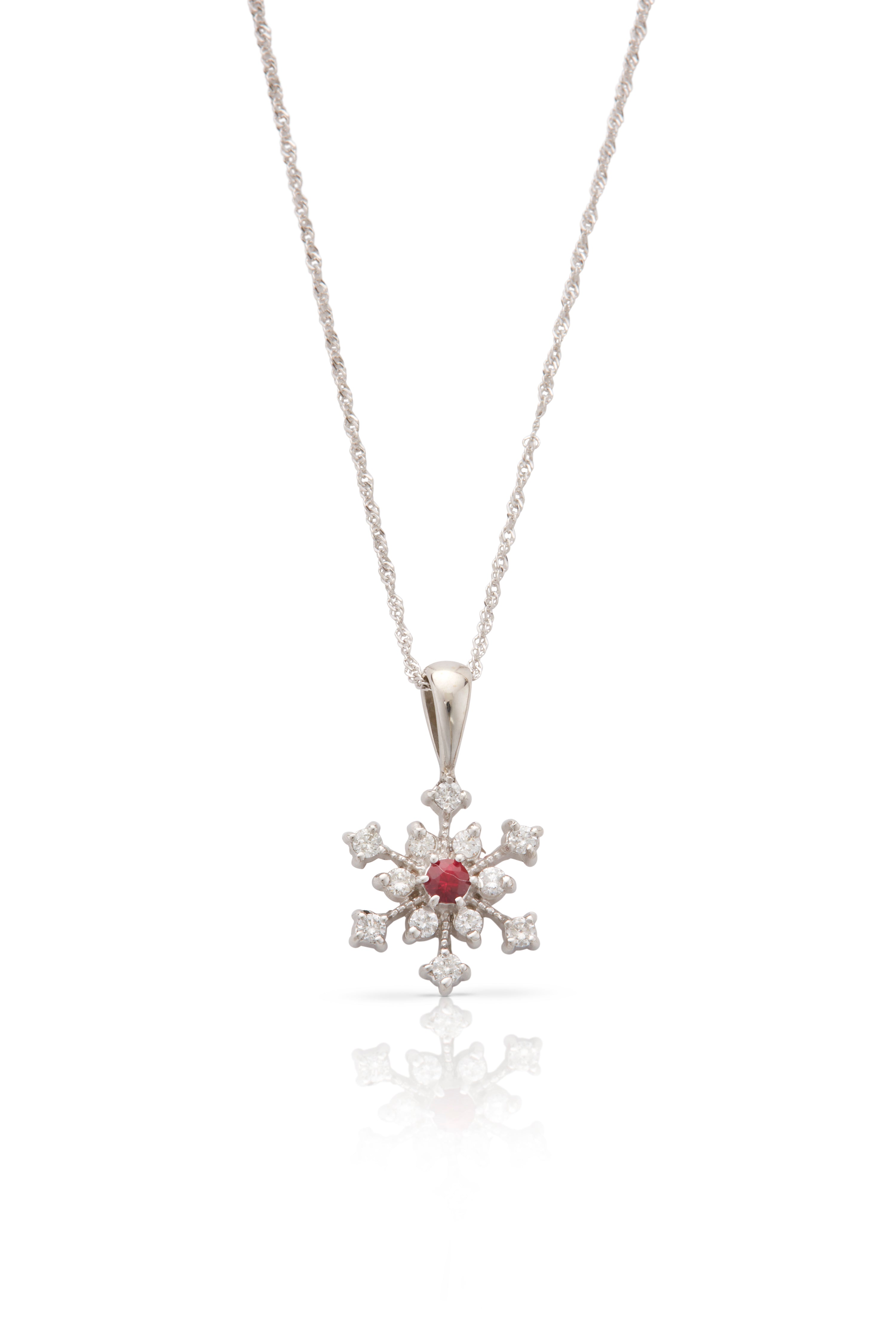 14K White Gold Waitsfield Diamond and Ruby Snowflake Pendant With 18" Chain. The Diamonds Weigh A Total of 0.27 Carats. The Ruby Weighs 0.12 Carats.