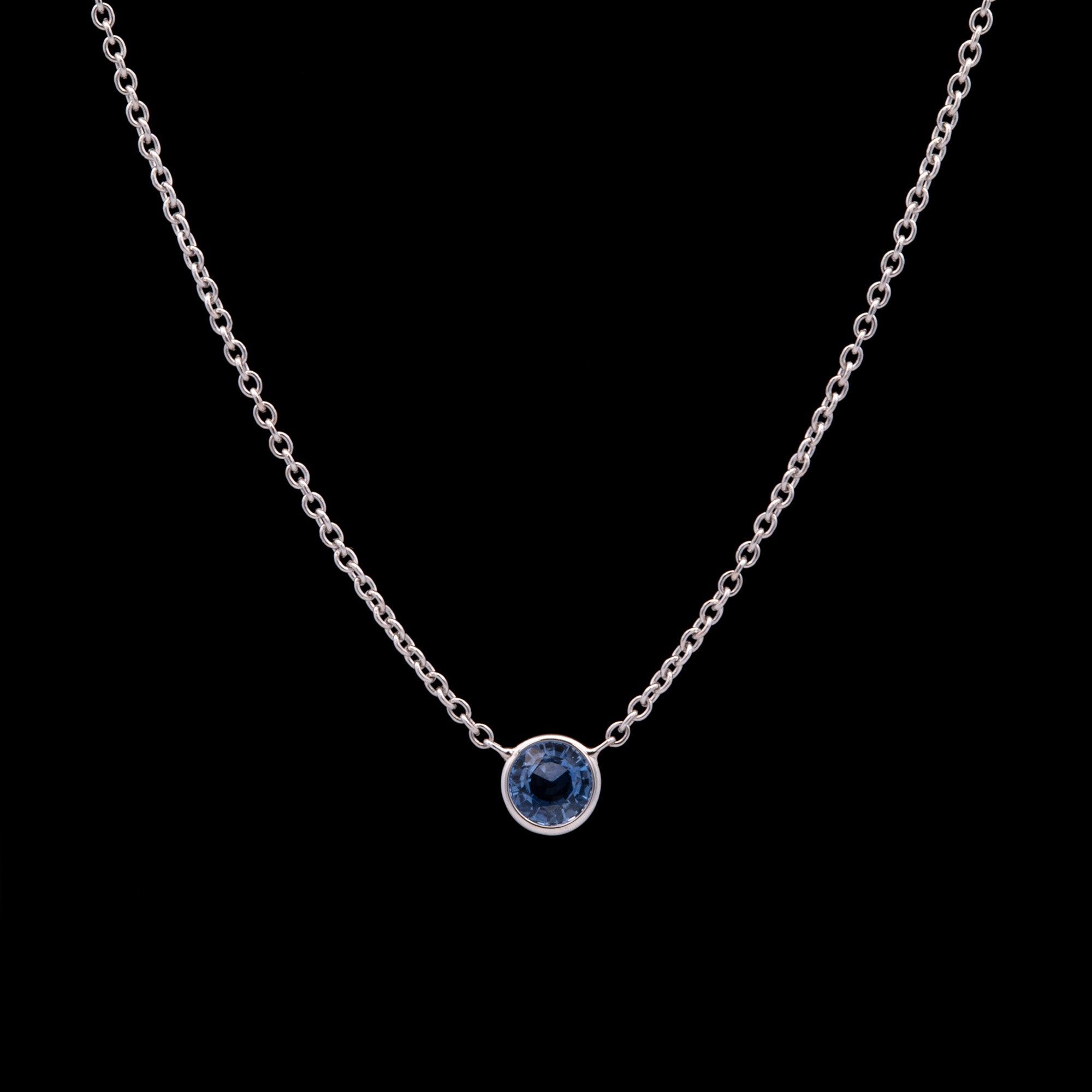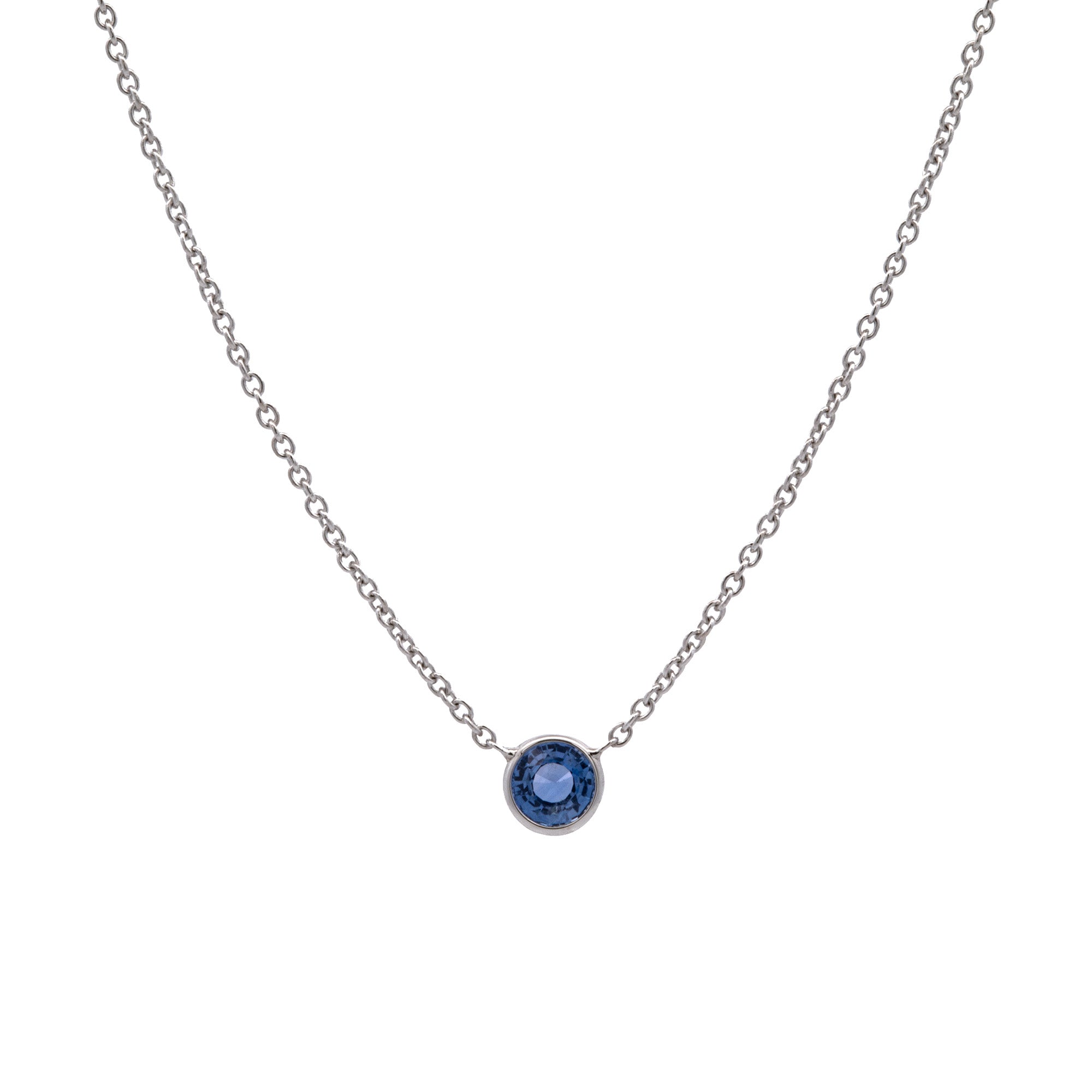 Custom 14K White Gold Bezel Set Cornflower Blue Sapphire Necklace, 18 Inch Cable Chain