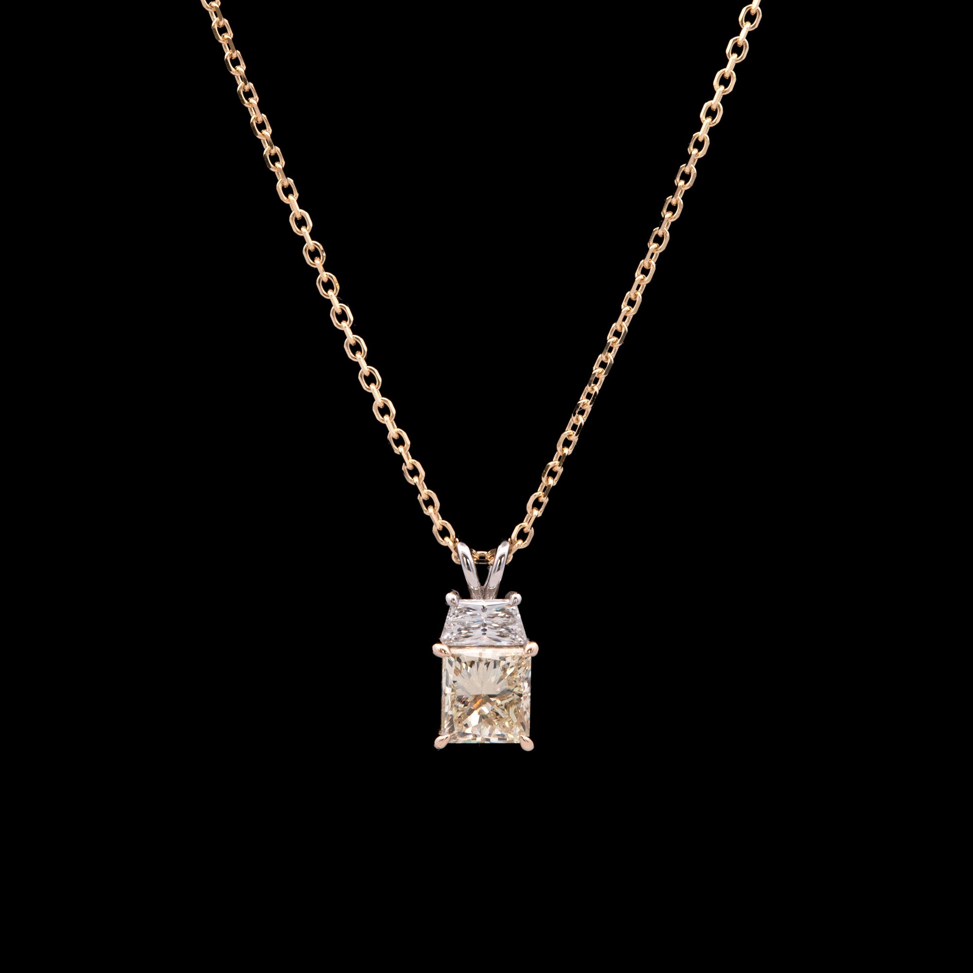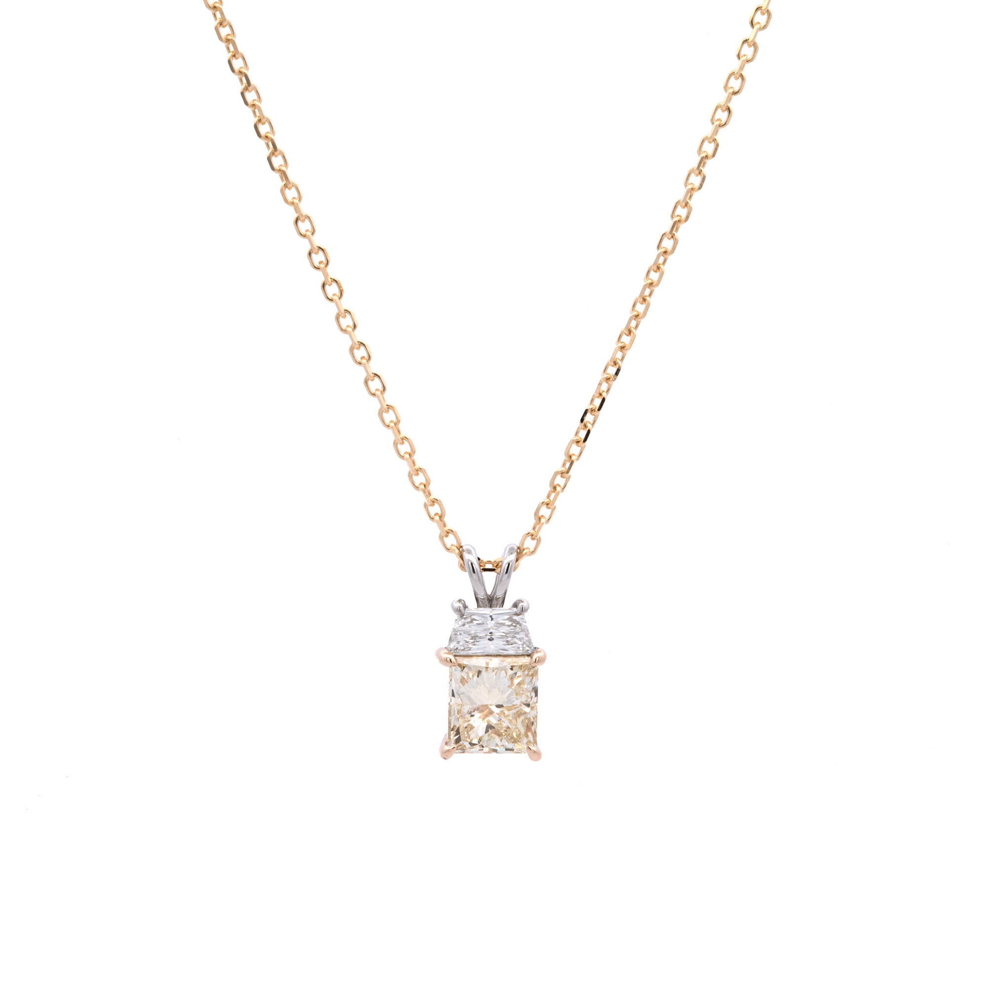 Custom 14K Yellow And White Gold Fancy Yellow Rectangular Radiant Cut Diamond And White Trapezoid Cut Diamond Pendant. Cable Chain Measures 20 Inches With Jump Ring At 18 Inches. Fancy Yellow Rectangular Radiant Cut Diamond Weighs 1.53 Carats. White Trapezoid Cut Diamond Weighs 0.28 Carats And Has G Color, VS1 Clarity.