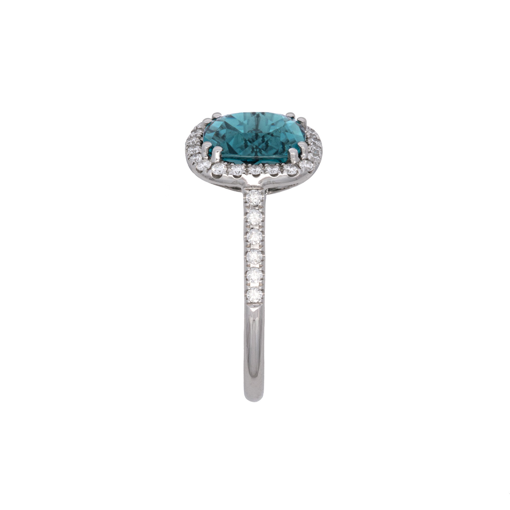 Platinum Indicolite Tourmaline And Diamond Halo Ring. Indicolite Weighs 2.85 Carats. Diamond Weighs 0.31 Carats. Sizing Available.