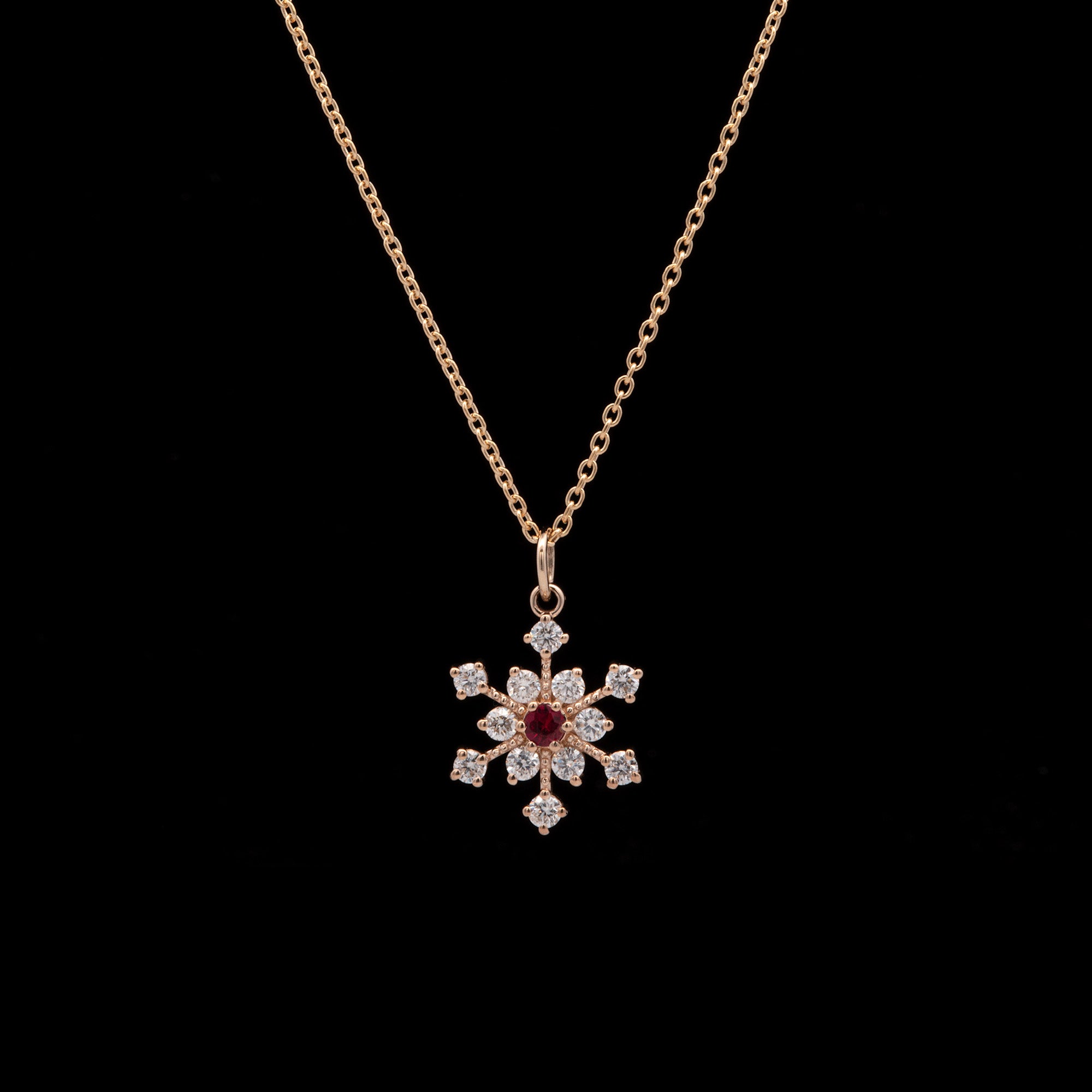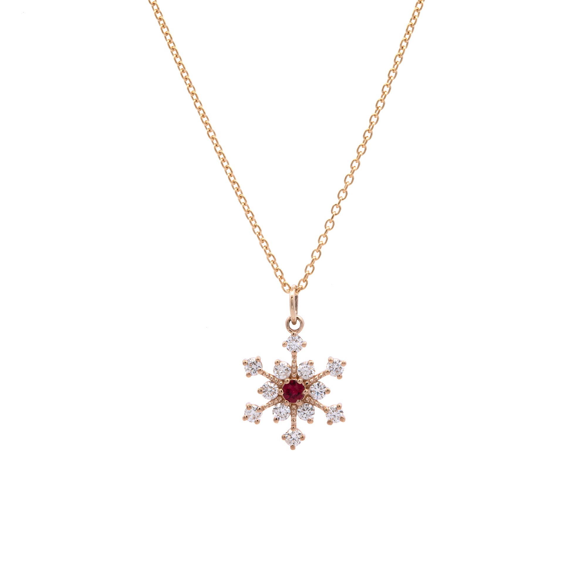 Waitsfield Ruby And Diamond Snowflake Pendant With 18 Inch Chain, 14K Yellow Gold