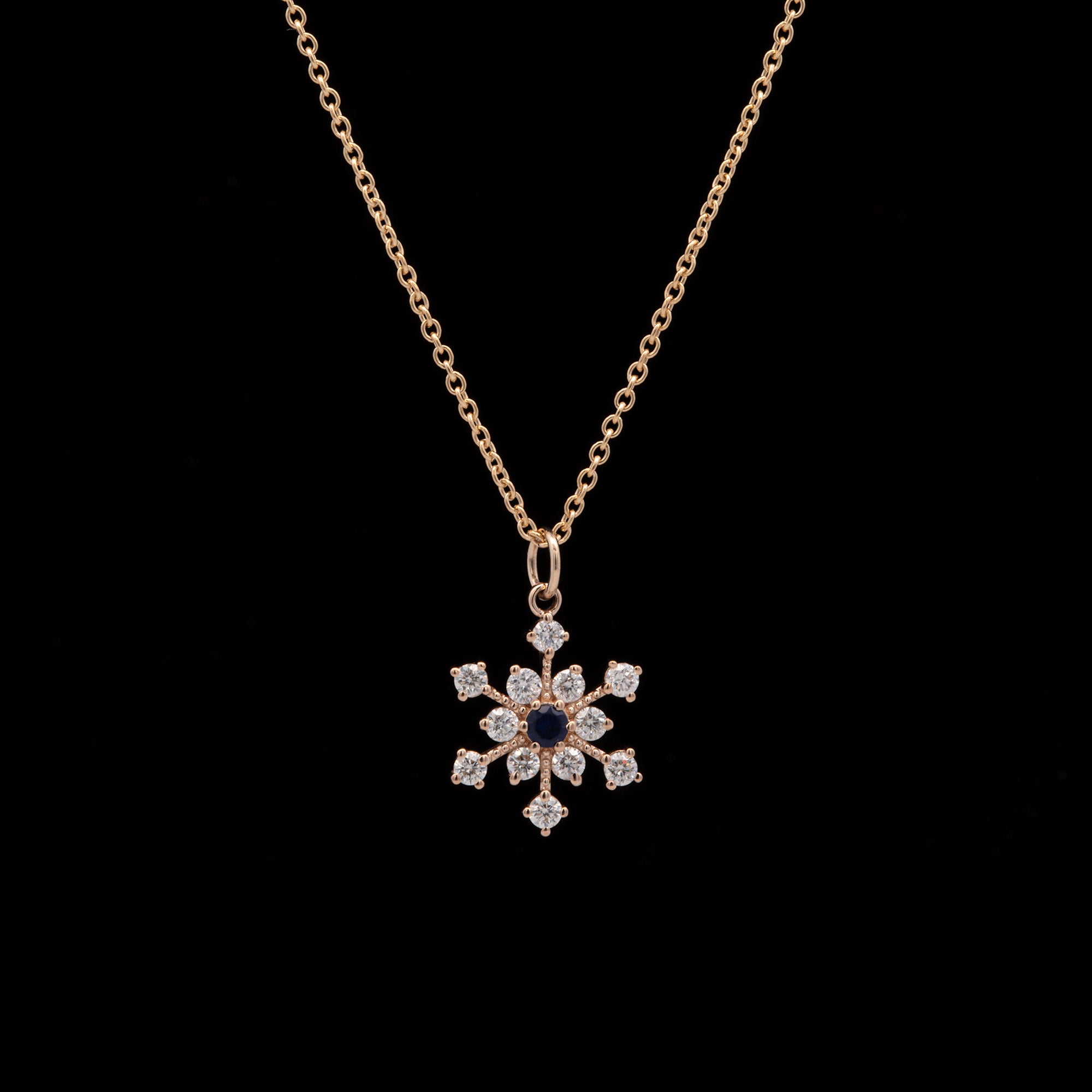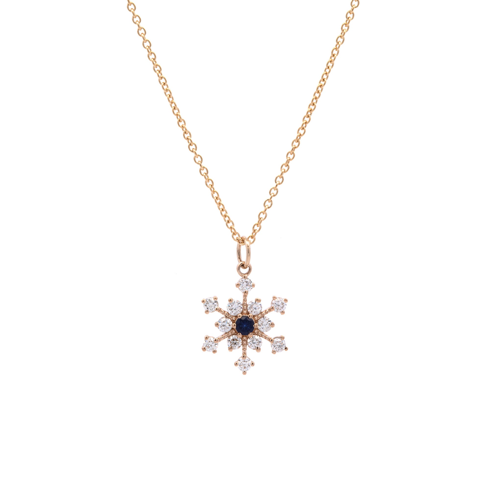 Waitsfield Sapphire And Diamond Snowflake Pendant With 18 Inch Chain, 14K Yellow Gold