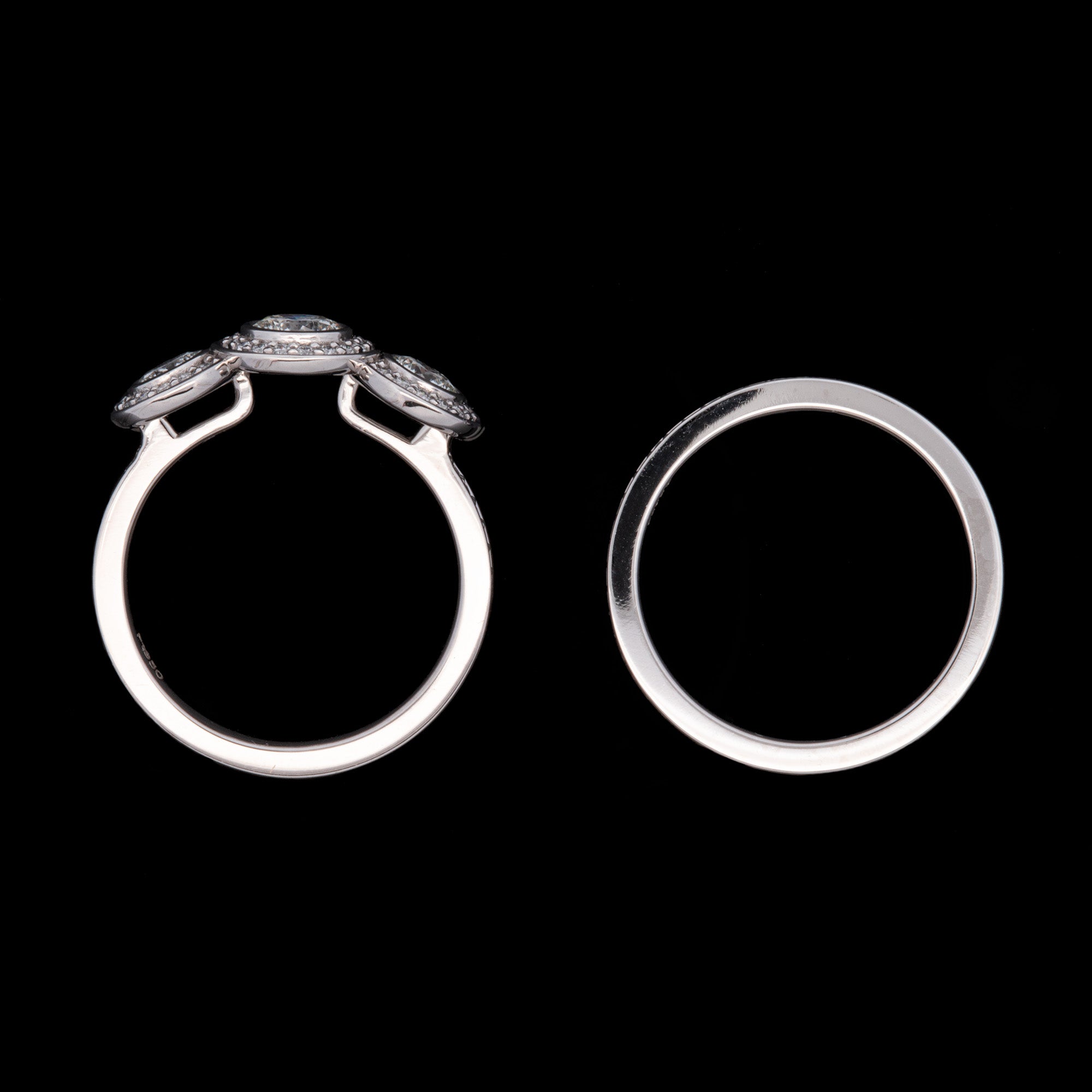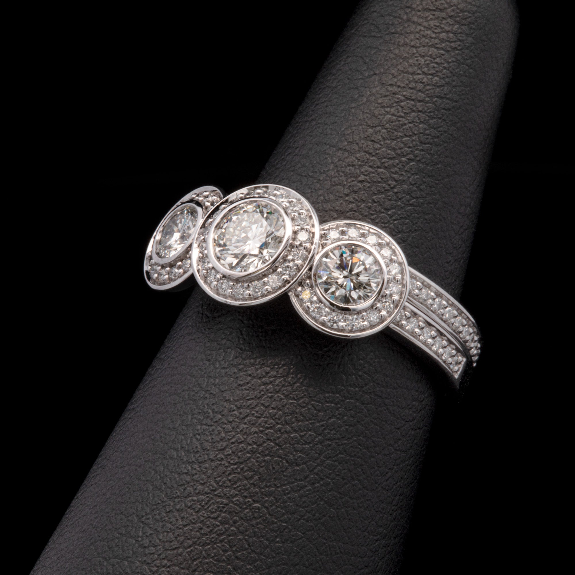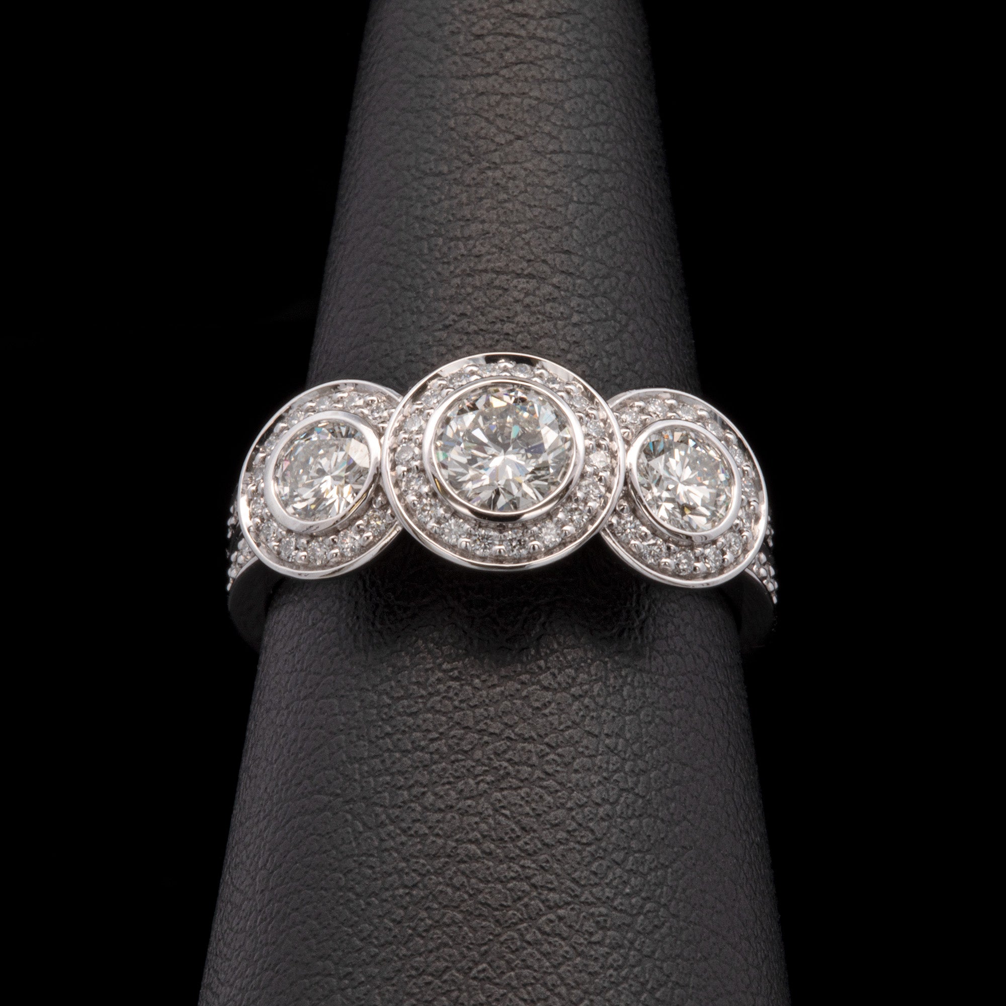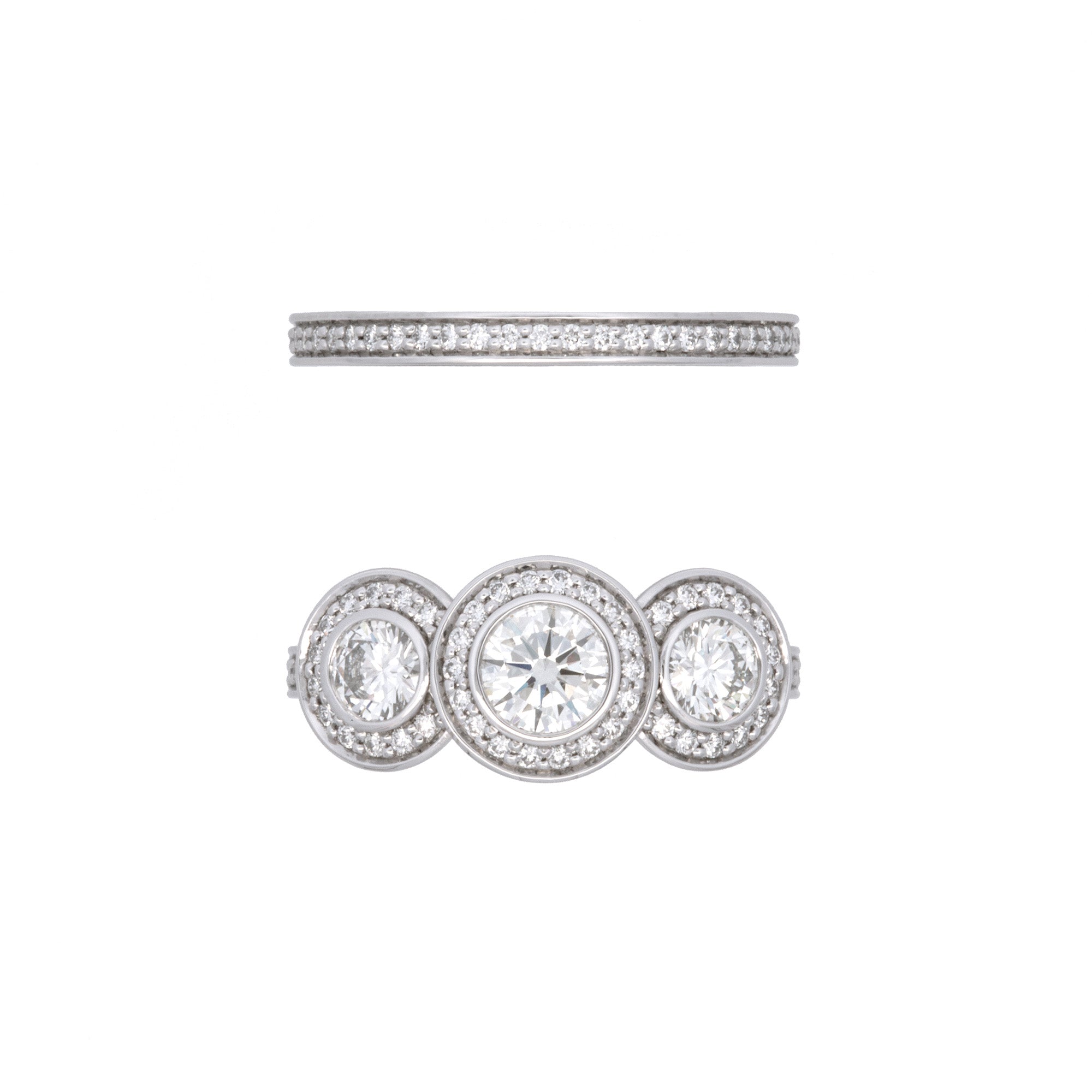 Custom Platinum Bezel Set Three Stone Engagement Ring With Diamond Halos And Matching Eternity Band