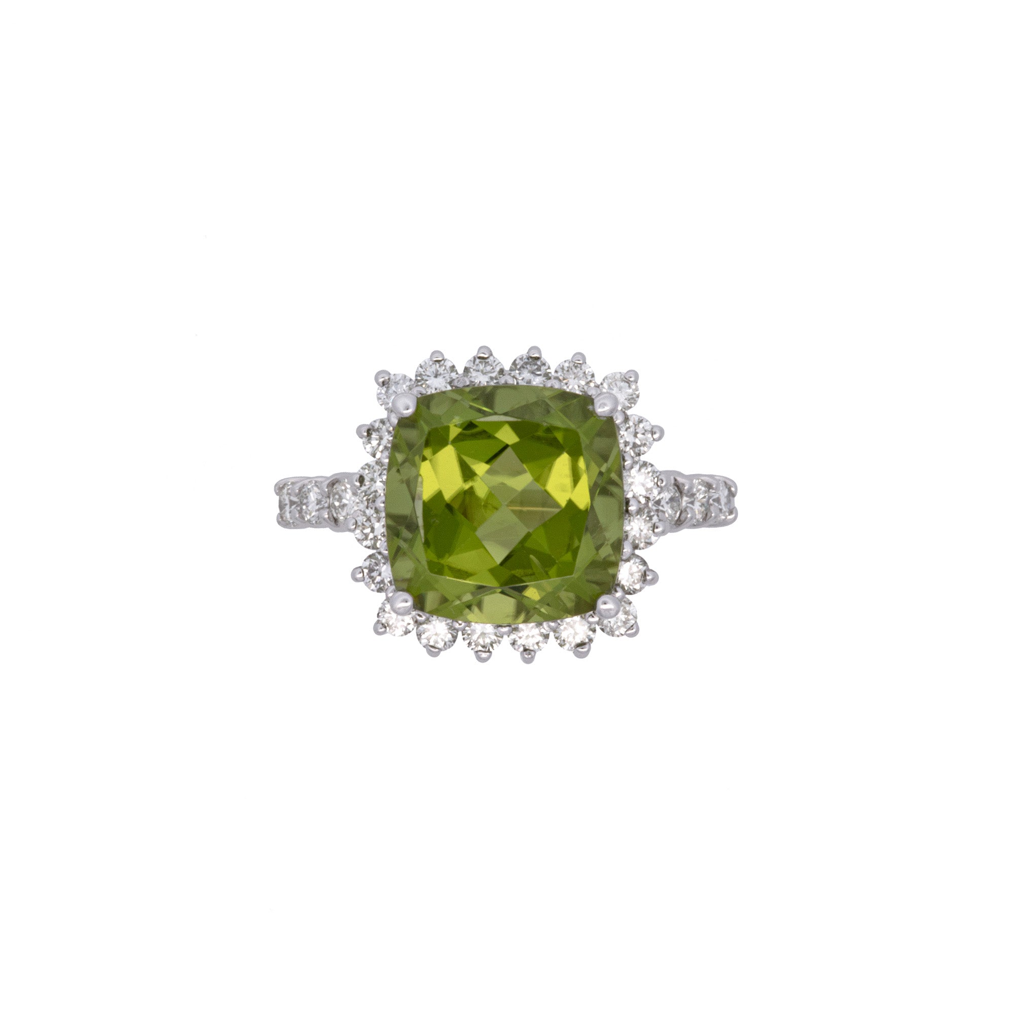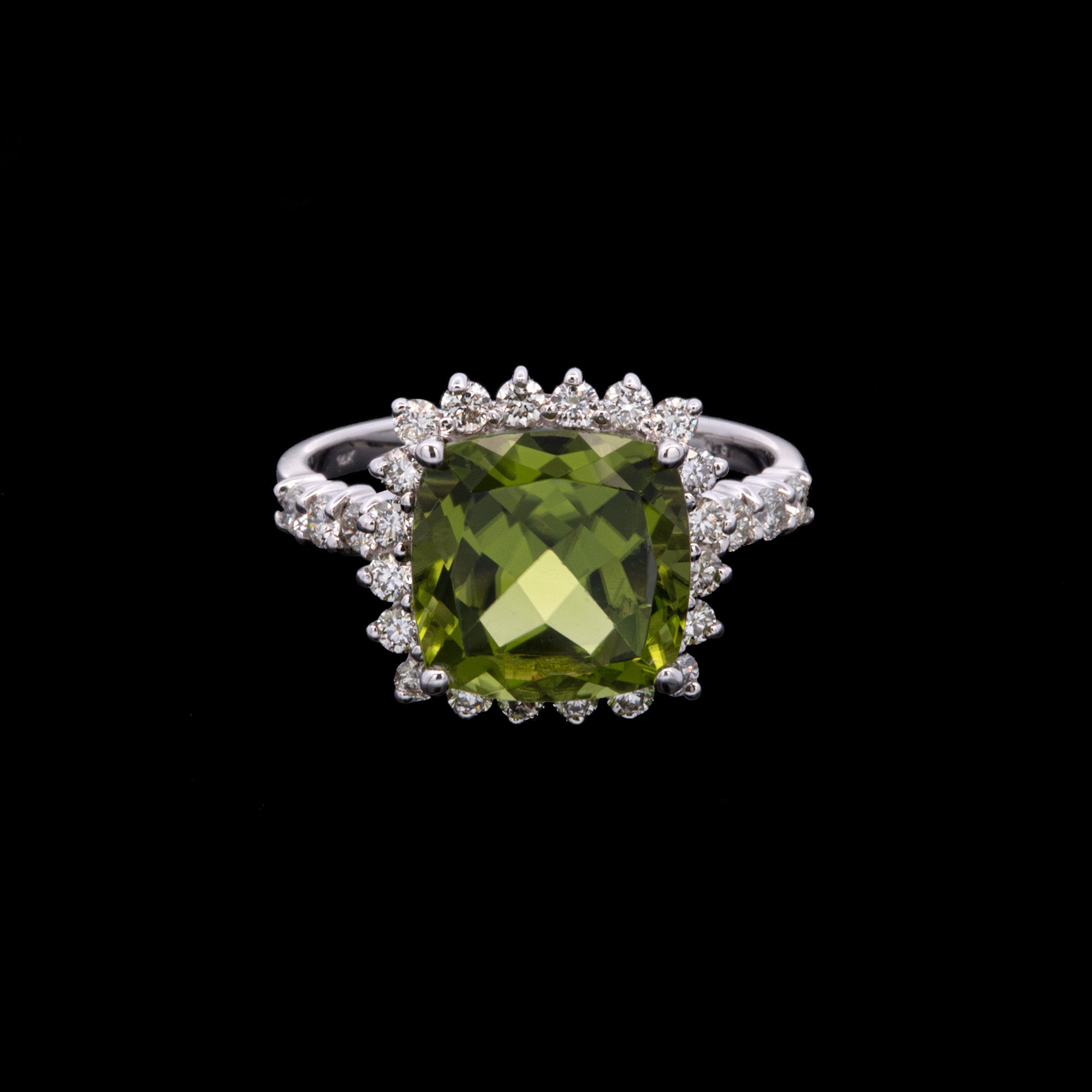 14K White Gold Cushion Cut Peridot And Diamond Halo Ring. Peridot Weighs 4.20 Carats. Diamonds Weigh A Total Of 0.65 Carats. Sizing available.