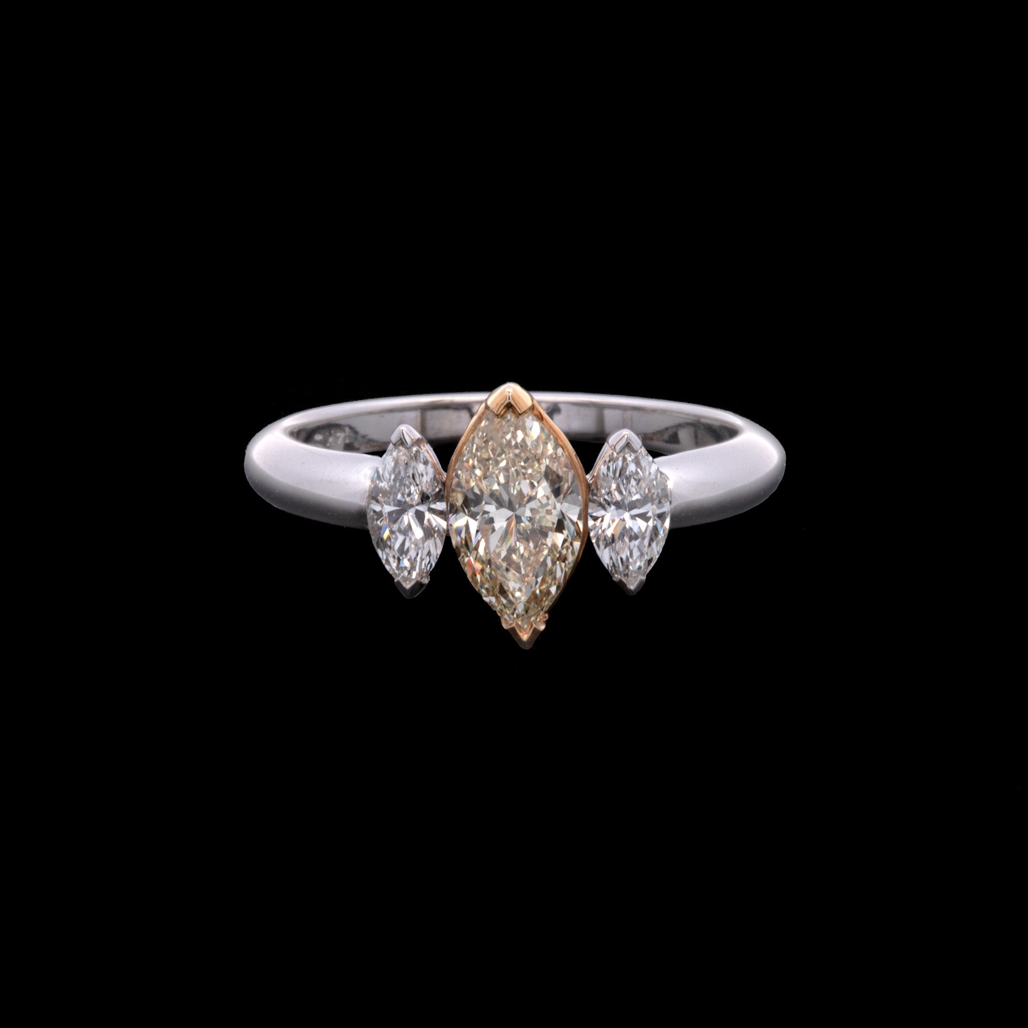 14K White Gold Fancy Yellow Marquise Diamond And White Marquise Diamond Three Stone Ring