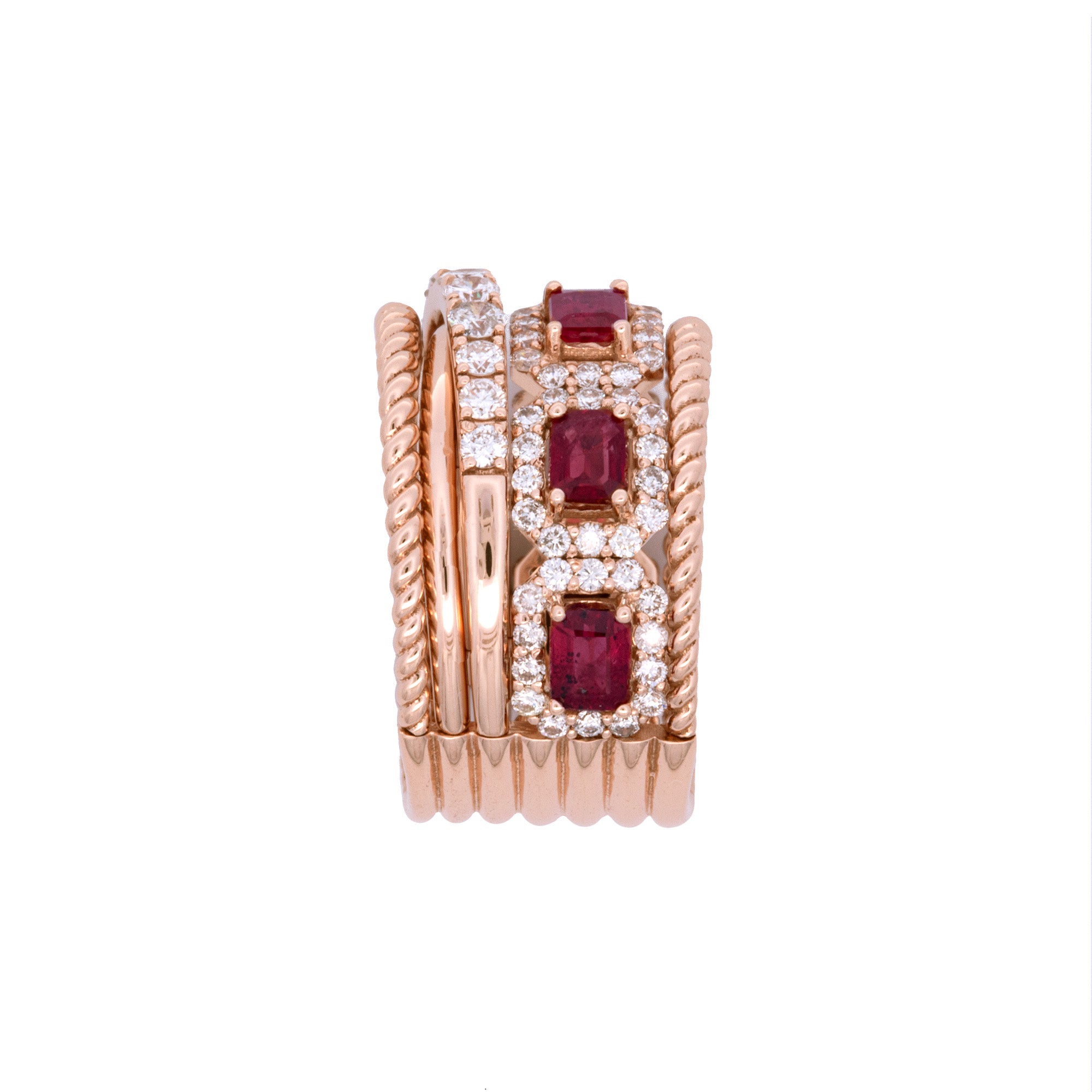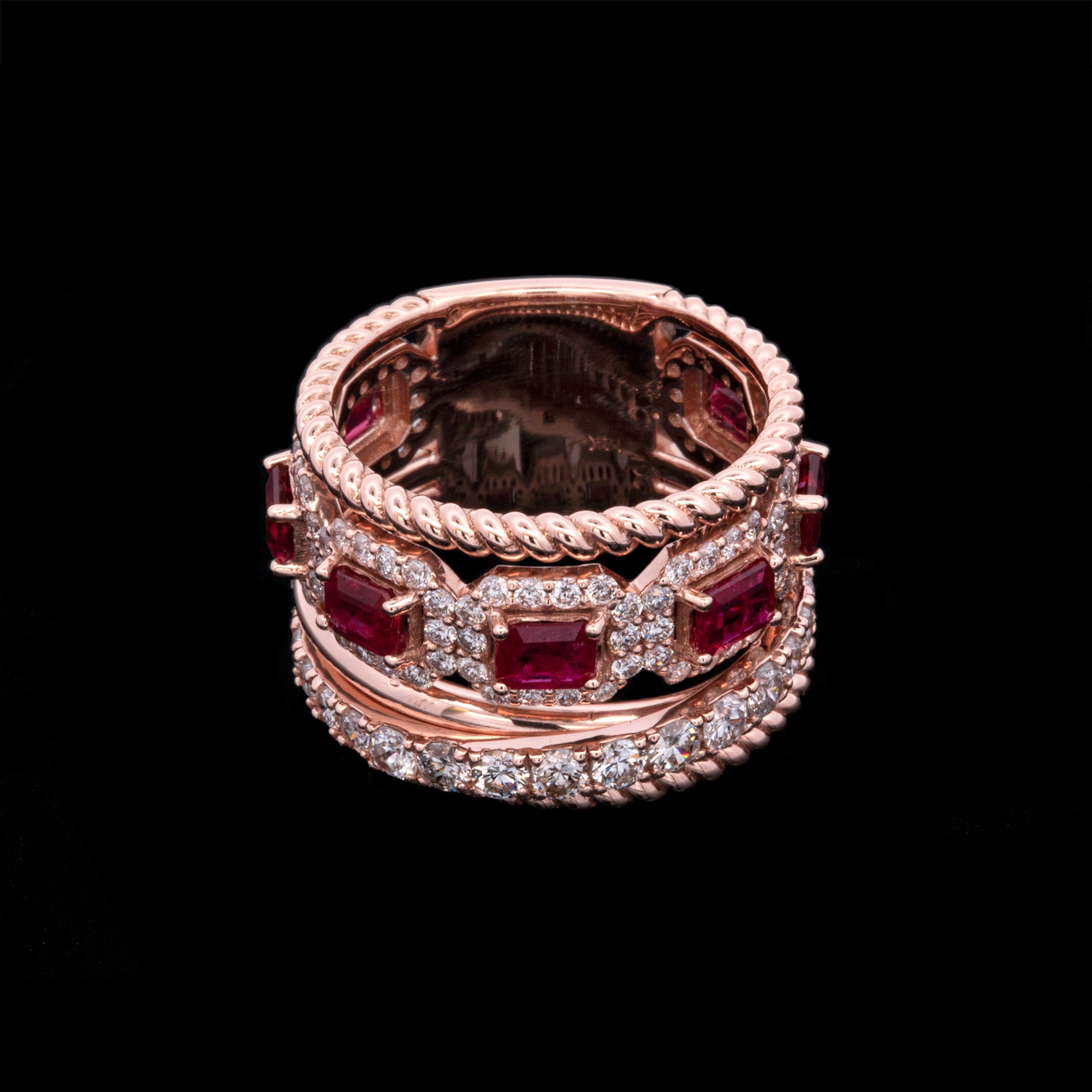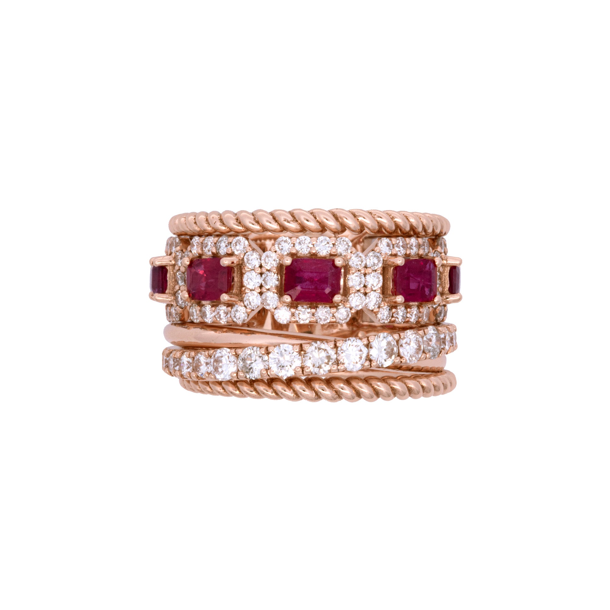 14K Yellow Gold Ruby And Diamond Multi Band. Seven Rubies Weigh A Total Of 1.87 Carats. One Hundred Thirteen Diamonds Weigh A Total Of 1.67 Carats. Sizing Available.