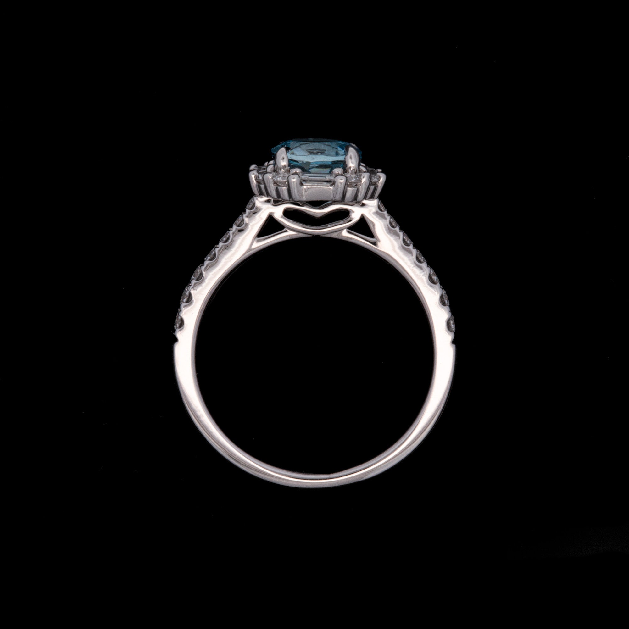 18K White Gold Aquamarine And Diamond Ring. Aquamarine Weighs 0.86 Carats. Twenty-Two Round Diamonds Weigh A Total Of 0.33 Carats And Have G-H Color, VS2-SI1 Clarity. Four Baguette Diamonds Weigh A Total Of 0.17 Carats And Have G-H Color, VS2- SI1 Clarity. Sizing Available.