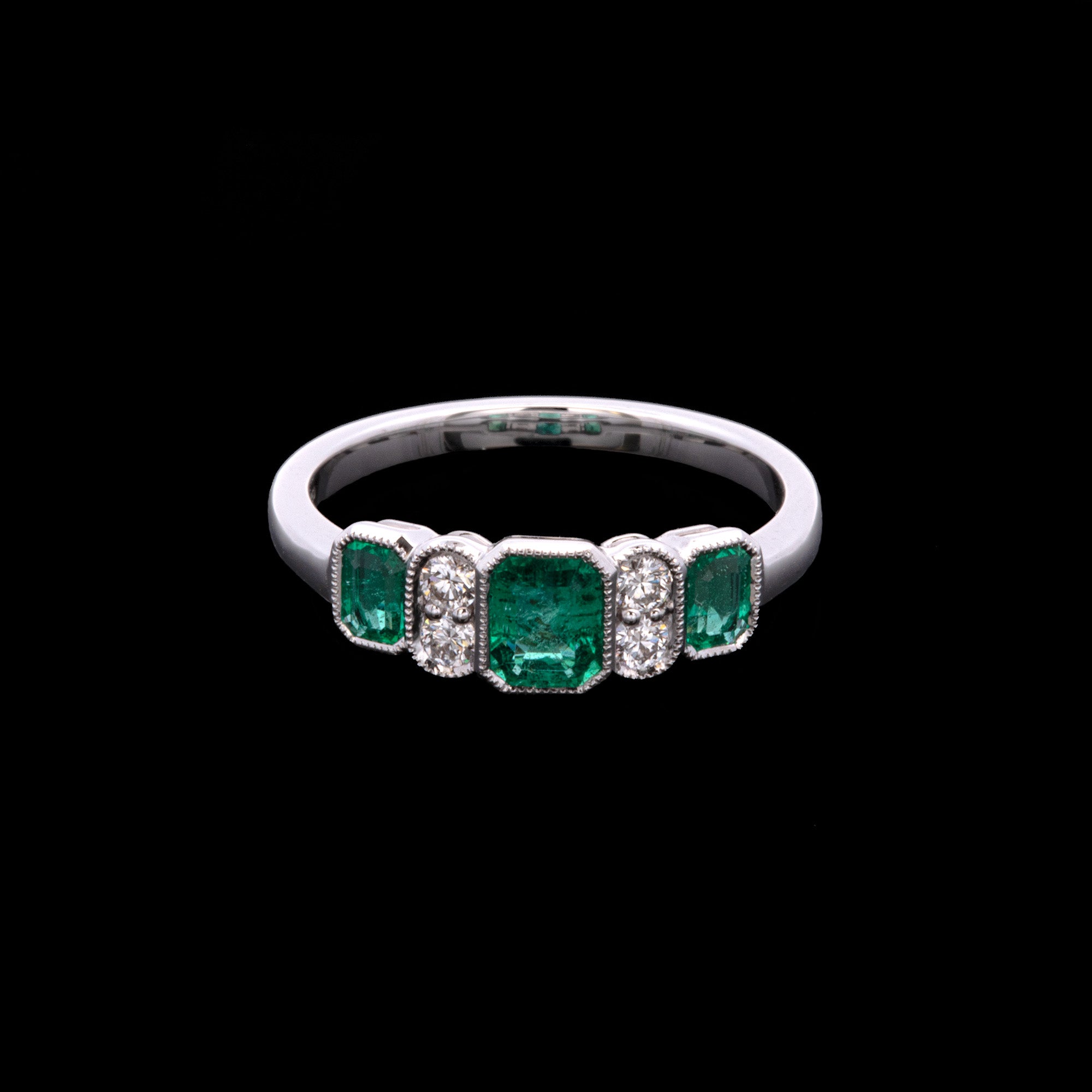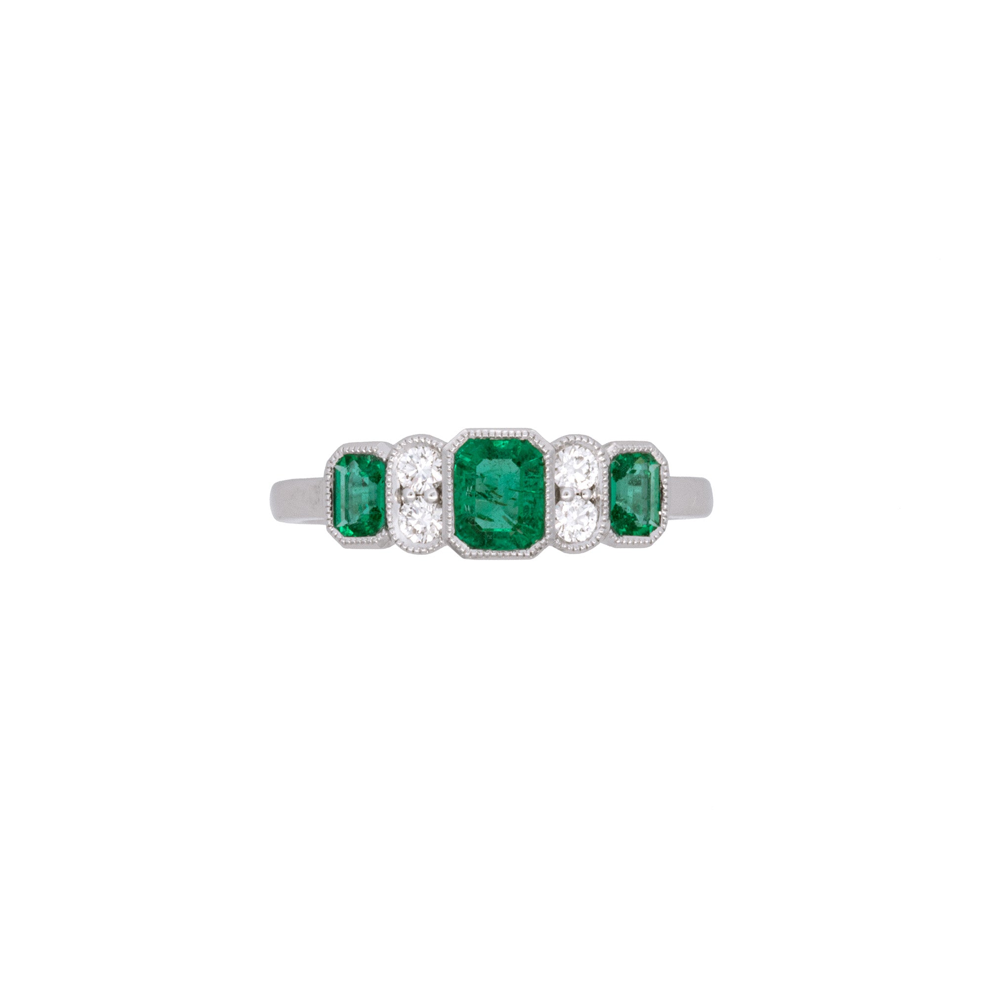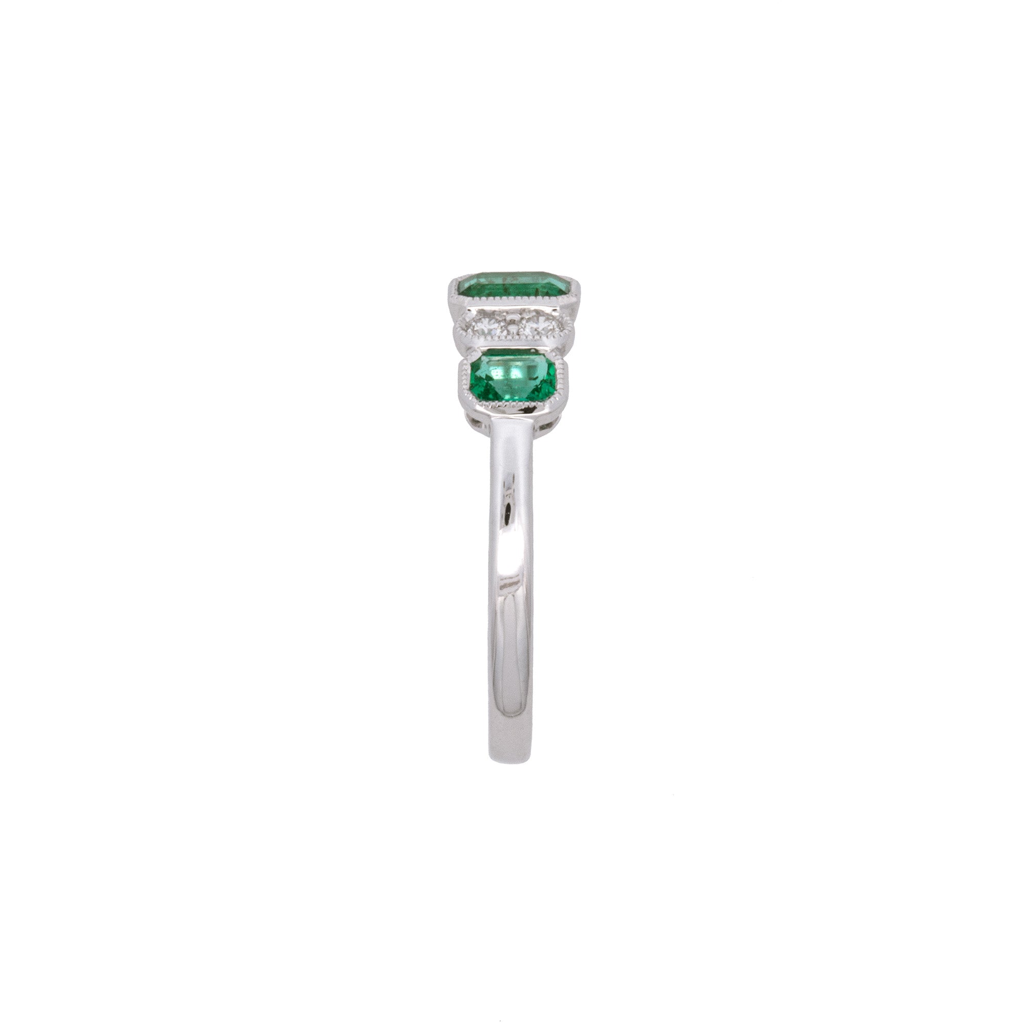 18K White Gold Bezel Set Emerald And Diamond Ring With Milgrain Edge. Three Emeralds Weigh A Total Of 0.65 Carats. Four Round Diamonds Weigh A Total Of 0.18 Carats And Have G-H Color, VS2-SI1 Clarity. Sizing Available.